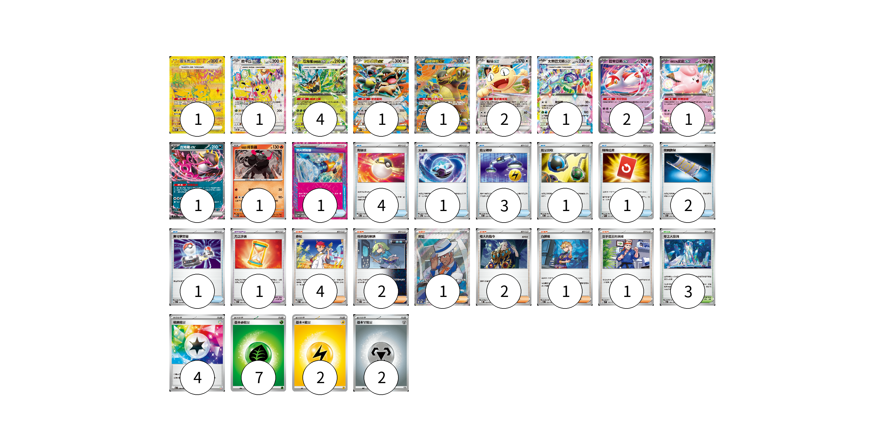 牌組構築方案 以此牌組為基礎新構築牌組 顯示卡面 顯示列表 寶可夢卡(16) 1 1 4 1 1 2 1 2 1 1 1 寶可夢道具(1) 1 物品卡(14) 1 4 1 3 1 1 2 1 支援者卡(11) 4 2 1 2 1 1 競技場卡(3) 3 能量卡(15) 4 7 2 2 寶可夢卡(16) 卡牌名稱 張數 卡牌名稱 張數 皮卡丘ex SV8a 236/187 01 皮卡丘ex SV8 122/106 01 厄鬼椪 碧草面具ex M2a 017/193 04 超級袋獸ex M1S 051/063 01 超級袋獸ex M1S 080/063 01 喵喵ex M3 061/080 02 太樂巴戈斯ex MC 630/742 01 拉帝亞斯ex MC 312/742 02 莉莉艾的皮皮ex MC 287/742 01 吉雉雞ex MC 489/742 01 帕底亞 肯泰羅 MC 093/742 01 寶可夢道具(1) 卡牌名稱 張數 卡牌名稱 張數 力之沙漏 MC 683/742 01 物品卡(14) 卡牌名稱 張數 卡牌名稱 張數 頂尖捕捉器 SV8a 148/187 01 高級球 MC 651/742 04 太晶珠 M2a 152/193 01 能量轉移 MC 638/742 03 能量回收 MC 636/742 01 特殊紅牌 M4 072/083 01 夜間擔架 MC 670/742 02 寶可夢交替 MJ 019/022 01 支援者卡(11) 卡牌名稱 張數 卡牌名稱 張數 赤松 MC 696/742 04 暗碼迷的解讀 MC 698/742 02 席藍 SV8 127/106 01 老大的指令 MBD 020/022 02 白蕾雅 MC 722/742 01 空手道王的演練 SVM 150/175 01 競技場卡(3) 卡牌名稱 張數 卡牌名稱 張數 零之大空洞 M2a 184/193 03 能量卡(15) 卡牌名稱 張數 卡牌名稱 張數 稜鏡能量 MC 739/742 04 基本【草】能量 MJ GRA 07 基本【雷】能量 MJ LIG 02 基本【鋼】能量 MC MET 02 以此牌組為基礎新構築牌組 牌組編碼 dSkwXY-bMUfGh-AKnGoT copy 列印牌組單 牌組編碼已複製 分享至SNS