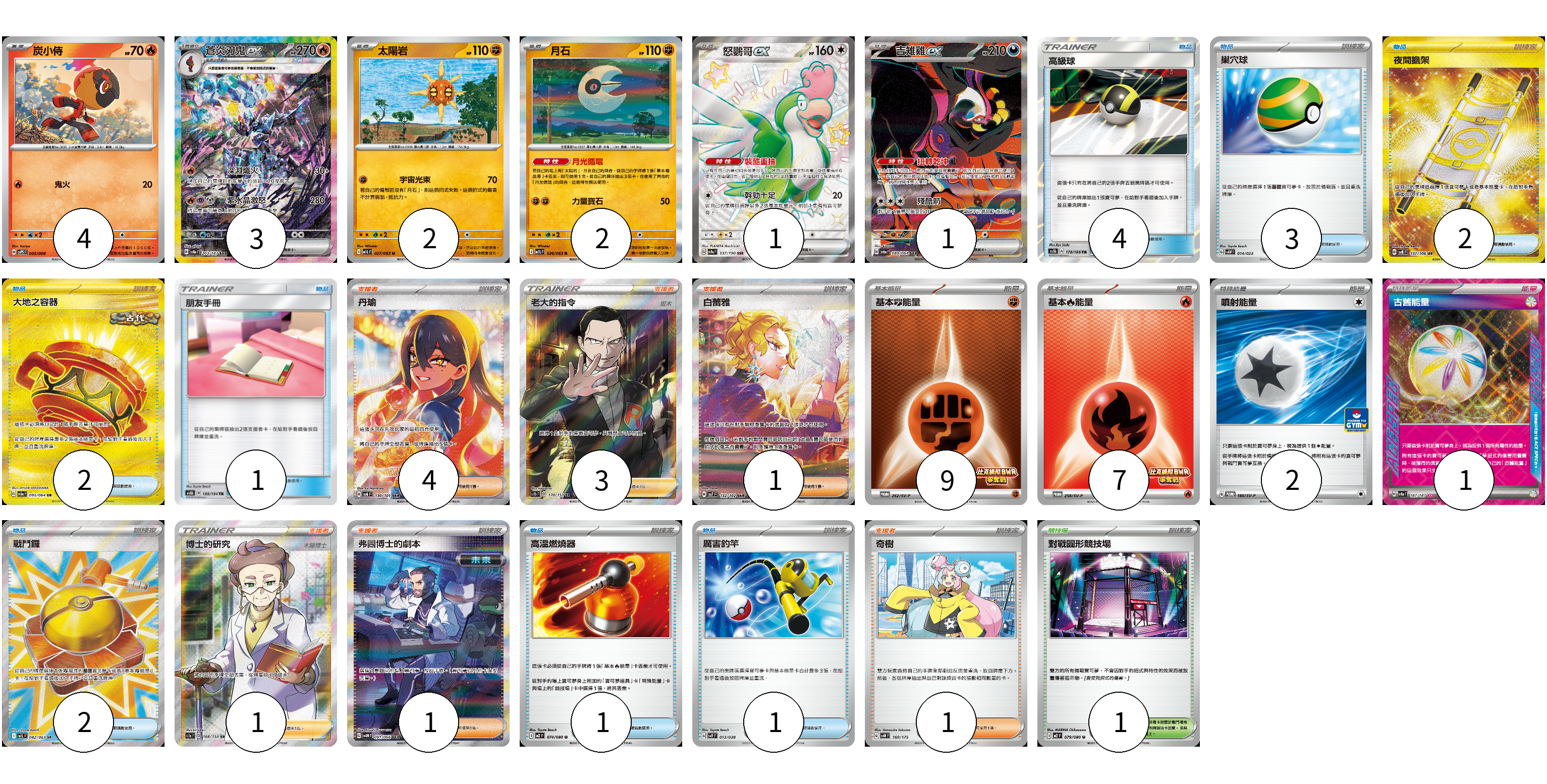 牌組構築方案 以此牌組為基礎新構築牌組 顯示卡面 顯示列表 寶可夢卡(13) 4 3 2 2 1 1 物品卡(16) 4 3 2 2 1 2 1 1 支援者卡(11) 4 3 1 1 1 1 競技場卡(1) 1 能量卡(19) 9 7 2 1 寶可夢卡(13) 卡牌名稱 張數 卡牌名稱 張數 炭小侍 SVPS 005/008 04 蒼炎刃鬼ex SV8a 203/187 03 太陽岩 M1L 027/063 02 月石 M1L 026/063 02 怒鸚哥ex SV4a 337/190 01 吉雉雞ex SV6a 089/064 01 物品卡(16) 卡牌名稱 張數 卡牌名稱 張數 高級球 AS5b 178/186 04 巢穴球 SVAW 014/023 03 夜間擔架 SV8 137/106 02 大地之容器 SV6a 093/064 02 朋友手冊 AS6b 188/194 01 戰鬥鑼 M1L 082/063 02 高溫燃燒器 M2 074/080 01 厲害釣竿 SVF 013/038 01 支援者卡(11) 卡牌名稱 張數 卡牌名稱 張數 丹瑜 SV6 130/101 04 老大的指令(坂木) SC1b 170/153 03 白蕾雅 SV7 132/102 01 博士的研究(木蘭博士) SC1a 168/154 01 弗圖博士的劇本 SV4M 091/066 01 奇樹 SVM 160/175 01 競技場卡(1) 卡牌名稱 張數 卡牌名稱 張數 對戰圓形競技場 M2 079/080 01 能量卡(19) 卡牌名稱 張數 卡牌名稱 張數 基本【鬥】能量 SV-P 262/SV-P 09 基本【火】能量 SV-P 258/SV-P 07 噴射能量 SV-P 180/SV-P 02 古舊能量 SV8a 187/187 01 以此牌組為基礎新構築牌組 牌組編碼 dTcvre-TNBYBg-BqXHwp copy 列印牌組單 牌組編碼已複製 分享至SNS