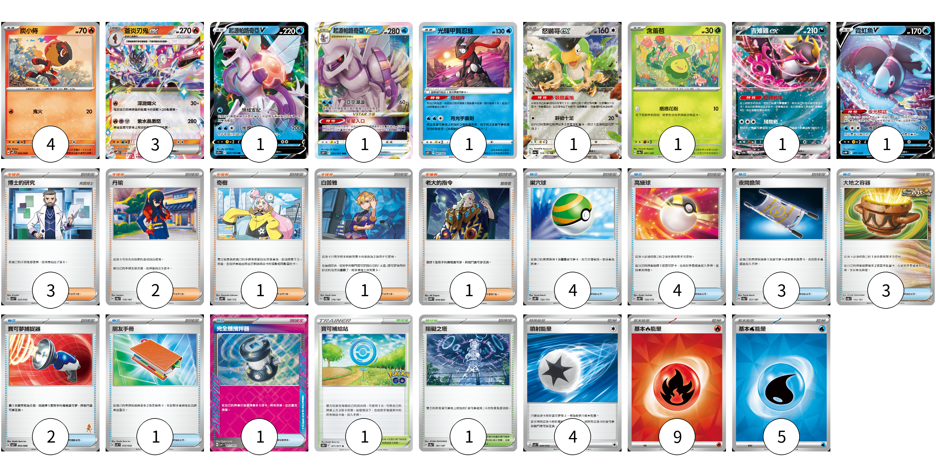 牌組構築方案 以此牌組為基礎新構築牌組 顯示卡面 顯示列表 寶可夢卡(14) 4 3 1 1 1 1 1 1 1 物品卡(18) 4 4 3 3 2 1 1 支援者卡(8) 3 2 1 1 1 競技場卡(2) 1 1 能量卡(18) 4 9 5 寶可夢卡(14) 卡牌名稱 張數 卡牌名稱 張數 炭小侍 SVPS 005/008 04 蒼炎刃鬼ex SVPS 006/008 03 起源帕路奇亞V S12a 027/172 01 起源帕路奇亞VSTAR S10P 023/067 01 光輝甲賀忍蛙 SVTS 001/022 01 怒鸚哥ex SV4a 154/190 01 含羞苞 SV8a 001/187 01 吉雉雞ex SV6a 038/064 01 霓虹魚V SVHM 001/022 01 物品卡(18) 卡牌名稱 張數 卡牌名稱 張數 巢穴球 SVM 133/175 04 高級球 SVM 134/175 04 夜間擔架 SV8a 151/187 03 大地之容器 SV8a 143/187 03 寶可夢捕捉器 SVI 055/066 02 朋友手冊 SVK 014/042 01 完全體攪拌器 SVK 017/042 01 支援者卡(8) 卡牌名稱 張數 卡牌名稱 張數 博士的研究 SVK 033/042 03 丹瑜 SV8a 170/187 02 奇樹 SVM 160/175 01 白蕾雅 SV8a 176/187 01 老大的指令 SVTR 019/021 01 競技場卡(2) 卡牌名稱 張數 卡牌名稱 張數 寶可補給站 S10b 071/071 01 阻礙之塔 SV8a 181/187 01 能量卡(18) 卡牌名稱 張數 卡牌名稱 張數 噴射能量 SVK 040/042 04 基本【火】能量 SVK FIR 09 基本【水】能量 SVK WAT 05 以此牌組為基礎新構築牌組 牌組編碼 dUJrGZ-sgjRKD-oETLEe copy 列印牌組單 牌組編碼已複製 分享至SNS