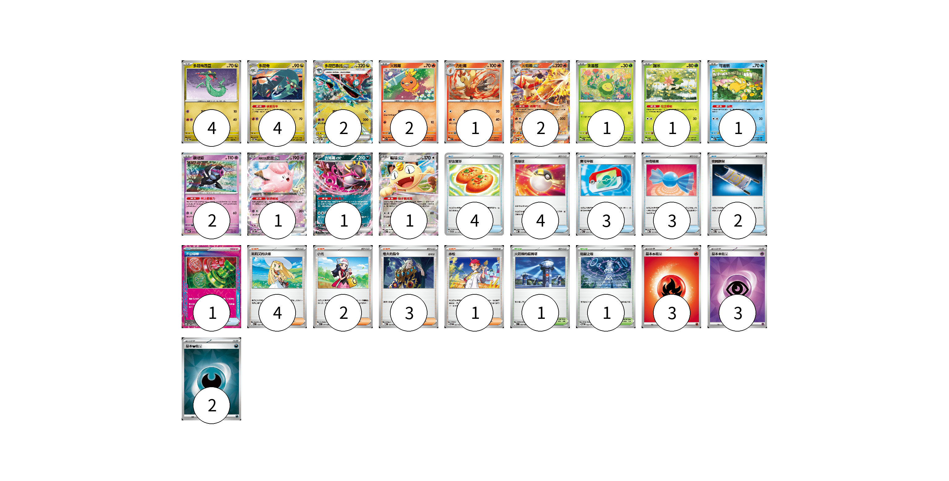 牌組構築方案 以此牌組為基礎新構築牌組 顯示卡面 顯示列表 寶可夢卡(23) 4 4 2 2 1 2 1 1 1 2 1 1 1 物品卡(17) 4 4 3 3 2 1 支援者卡(10) 4 2 3 1 競技場卡(2) 1 1 能量卡(8) 3 3 2 寶可夢卡(23) 卡牌名稱 張數 卡牌名稱 張數 多龍梅西亞 SV6 079/101 04 多龍奇 SV6 080/101 04 多龍巴魯托ex SV6 081/101 02 火稚雞 SV10 018/098 02 力壯雞 SV10 019/098 01 火焰雞ex SVM 016/175 02 含羞苞 M2a 011/193 01 謝米 SV9a 006/063 01 可達鴨 M2a 032/193 01 願增猿 SV8a 075/187 02 莉莉艾的皮皮ex SV9 033/100 01 吉雉雞ex M2a 114/193 01 喵喵ex M3 061/080 01 物品卡(17) 卡牌名稱 張數 卡牌名稱 張數 好友寶芬 SVTG 011/019 04 高級球 MBD 014/022 04 寶可平板 MC 662/742 03 神奇糖果 MBG 013/022 03 夜間擔架 M2a 159/193 02 不公印章 SV5a 053/066 01 支援者卡(10) 卡牌名稱 張數 卡牌名稱 張數 莉莉艾的決意 MC 729/742 04 小光 M2 077/080 02 老大的指令 MBD 020/022 03 赤松 SV7 097/102 01 競技場卡(2) 卡牌名稱 張數 卡牌名稱 張數 火箭隊的監視塔 SV10 096/098 01 阻礙之塔 SV6 100/101 01 能量卡(8) 卡牌名稱 張數 卡牌名稱 張數 基本【火】能量 MC FIR 03 基本【超】能量 SVOD PSY 03 基本【惡】能量 SVOM DAR 02 以此牌組為基礎新構築牌組 牌組編碼 dUfCnG-kBdtTK-AuHxWx copy 列印牌組單 牌組編碼已複製 分享至SNS