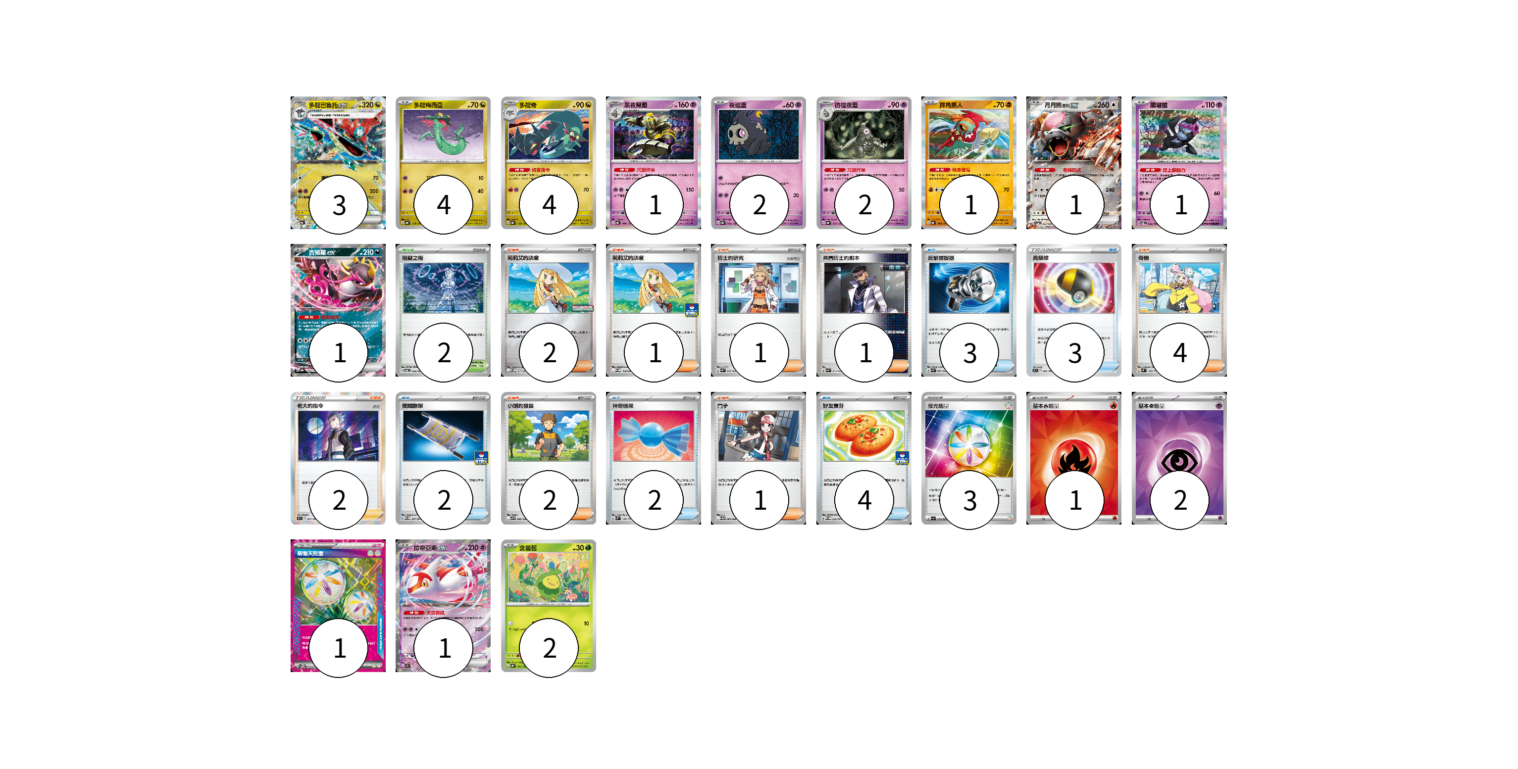 牌組構築方案 以此牌組為基礎新構築牌組 顯示卡面 顯示列表 寶可夢卡(23) 3 4 4 1 2 2 1 1 1 1 1 2 物品卡(14) 3 3 2 2 4 支援者卡(14) 2 1 1 1 4 2 2 1 競技場卡(2) 2 能量卡(7) 3 1 2 1 寶可夢卡(23) 卡牌名稱 張數 卡牌名稱 張數 多龍巴魯托ex SV8a 120/187 03 多龍梅西亞 SV8a 118/187 04 多龍奇 SV8a 119/187 04 黑夜魔靈 SV8a 066/187 01 夜巡靈 SV8a 064/187 02 彷徨夜靈 SV8a 065/187 02 摔角鷹人 SV8a 084/187 01 月月熊 赫月 ex SV5a 052/066 01 願增猿 SV6 055/101 01 吉雉雞ex SV8a 104/187 01 拉帝亞斯ex SV7a 019/064 01 含羞苞 SV8a 001/187 02 物品卡(14) 卡牌名稱 張數 卡牌名稱 張數 反擊捕捉器 SVK 009/042 03 高級球 S9 089/100 03 夜間擔架 SV-P 227/SV-P 02 神奇糖果 SVM 135/175 02 好友寶芬 SV-P 212/SV-P 04 支援者卡(14) 卡牌名稱 張數 卡牌名稱 張數 莉莉艾的決意 M-P 011/M-P 02 莉莉艾的決意 M-P 018/M-P 01 博士的研究 SVK 032/042 01 弗圖博士的劇本 SVK 034/042 01 奇樹 SVM 160/175 04 老大的指令(赤日) S9 097/100 02 小剛的發掘 SV9 096/100 02 鬥子 SV11W 085/086 01 競技場卡(2) 卡牌名稱 張數 卡牌名稱 張數 阻礙之塔 SV6 100/101 02 能量卡(7) 卡牌名稱 張數 卡牌名稱 張數 夜光能量 SV1a 073/073 03 基本【火】能量 SVM FIR 01 基本【超】能量 SVM PSY 02 新衝天能量 SV5K 071/071 01 以此牌組為基礎新構築牌組 牌組編碼 dVXwTs-YsbKun-ceefmi copy 列印牌組單 牌組編碼已複製 分享至SNS