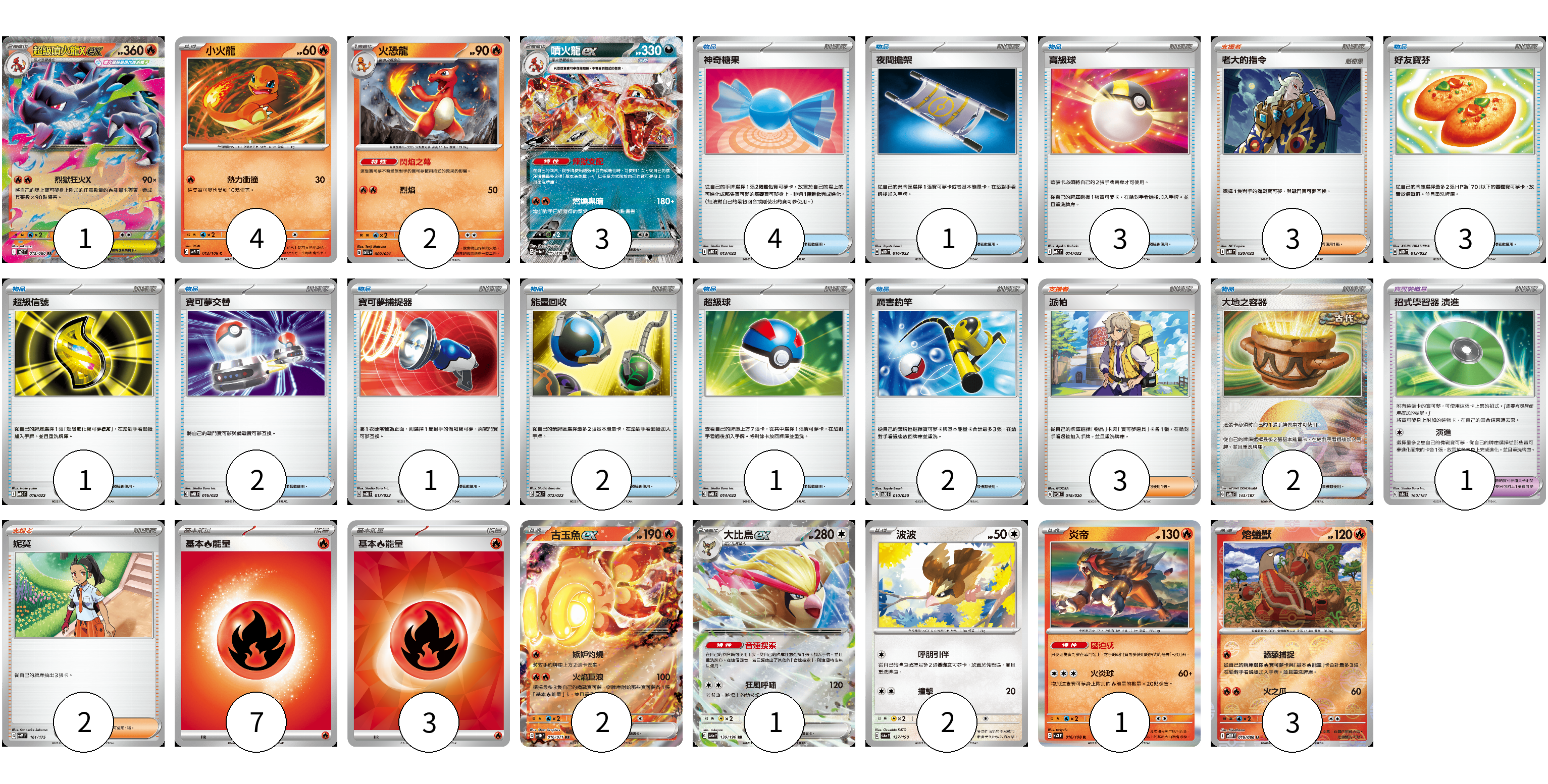 牌組構築方案 以此牌組為基礎新構築牌組 顯示卡面 顯示列表 寶可夢卡(19) 1 4 2 3 2 1 2 1 3 寶可夢道具(1) 1 物品卡(22) 4 1 3 3 1 2 1 2 1 2 2 支援者卡(8) 3 3 2 能量卡(10) 7 3 寶可夢卡(19) 卡牌名稱 張數 卡牌名稱 張數 超級噴火龍Xex M2 013/080 01 小火龍 SV3 012/108 04 火恐龍 SVTL 002/021 02 噴火龍ex SV4a 115/190 03 古玉魚ex SV2D 016/071 02 大比鳥ex SV4a 139/190 01 波波 SV4a 137/190 02 炎帝 SV3 016/108 01 熔蟻獸 SV11W 016/086 03 寶可夢道具(1) 卡牌名稱 張數 卡牌名稱 張數 招式學習器 演進 SV8a 160/187 01 物品卡(22) 卡牌名稱 張數 卡牌名稱 張數 神奇糖果 MBG 013/022 04 夜間擔架 MBD 016/022 01 高級球 MBD 014/022 03 好友寶芬 MBD 013/022 03 超級信號 MBG 016/022 01 寶可夢交替 SVQL 016/022 02 寶可夢捕捉器 SVQL 017/022 01 能量回收 SVQL 012/022 02 超級球 SVQL 014/022 01 厲害釣竿 SVOD 010/020 02 大地之容器 SV8a 143/187 02 支援者卡(8) 卡牌名稱 張數 卡牌名稱 張數 老大的指令 MBD 020/022 03 派帕 SVOD 018/020 03 妮莫 SVM 161/175 02 能量卡(10) 卡牌名稱 張數 卡牌名稱 張數 基本【火】能量 M-P FIR 07 基本【火】能量 SVQL FIR 03 以此牌組為基礎新構築牌組 牌組編碼 dWoZoq-jrvODe-zmjgEb copy 列印牌組單 牌組編碼已複製 分享至SNS