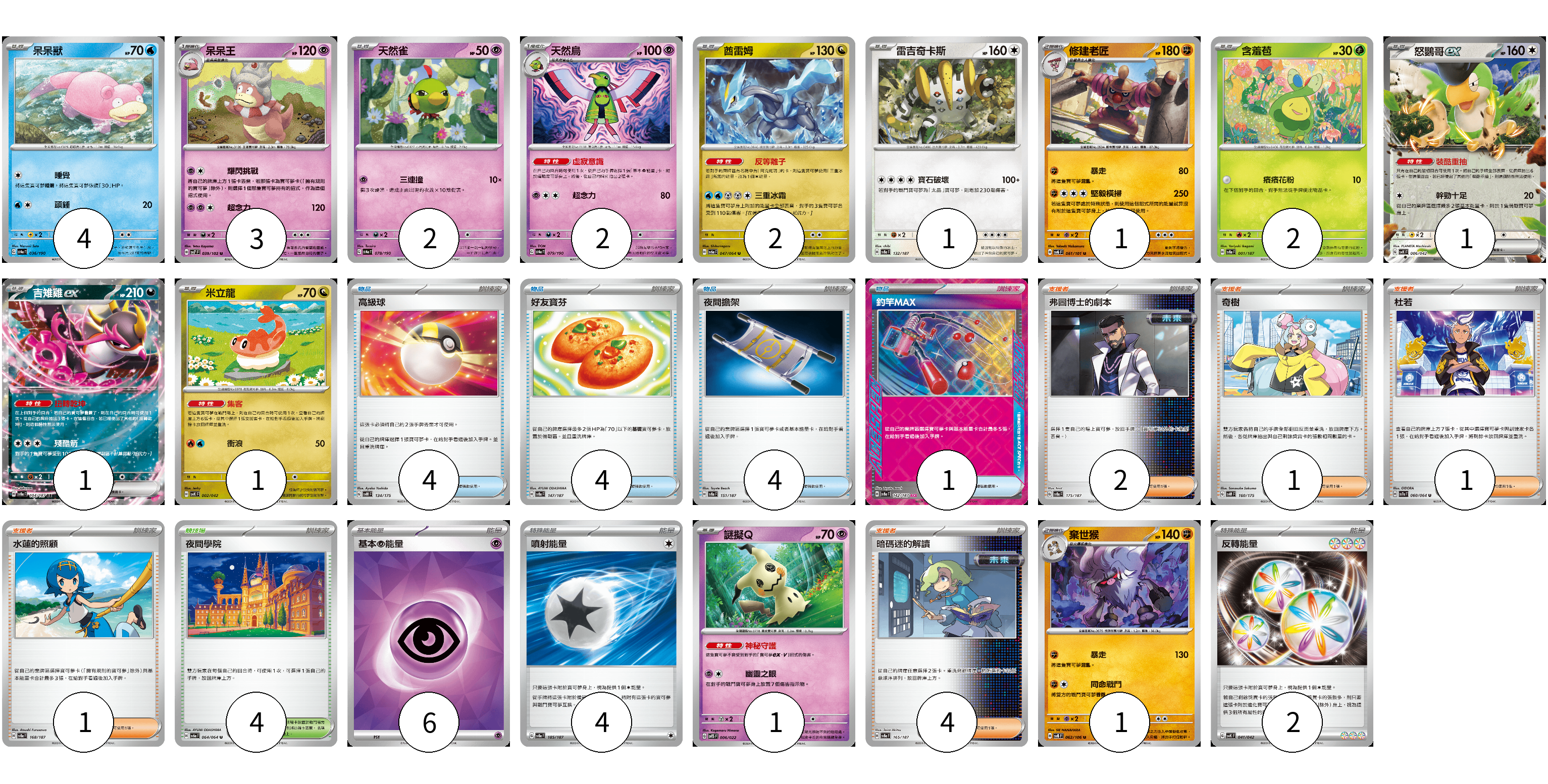 牌組構築方案 以此牌組為基礎新構築牌組 顯示卡面 顯示列表 寶可夢卡(22) 4 3 2 2 2 1 1 2 1 1 1 1 1 物品卡(13) 4 4 4 1 支援者卡(9) 2 1 1 1 4 競技場卡(4) 4 能量卡(12) 6 4 2 寶可夢卡(22) 卡牌名稱 張數 卡牌名稱 張數 呆呆獸 SV4a 036/190 04 呆呆王 SV7 039/102 03 天然雀 SV4a 078/190 02 天然鳥 SV4a 079/190 02 酋雷姆 SV6a 047/064 02 雷吉奇卡斯 SV8a 132/187 01 修建老匠 SV6 061/101 01 含羞苞 SV8a 001/187 02 怒鸚哥ex SVK 006/042 01 吉雉雞ex SV8a 104/187 01 米立龍 SVK 002/042 01 謎擬Q SVTS 006/022 01 棄世猴 SV8 062/106 01 物品卡(13) 卡牌名稱 張數 卡牌名稱 張數 高級球 SVM 134/175 04 好友寶芬 SV8a 147/187 04 夜間擔架 SV8a 151/187 04 釣竿MAX SV8a 142/187 01 支援者卡(9) 卡牌名稱 張數 卡牌名稱 張數 弗圖博士的劇本 SV8a 175/187 02 奇樹 SVM 160/175 01 杜若 SV7a 060/064 01 水蓮的照顧 SV8a 168/187 01 暗碼迷的解讀 SV8a 165/187 04 競技場卡(4) 卡牌名稱 張數 卡牌名稱 張數 夜間學院 SV6a 064/064 04 能量卡(12) 卡牌名稱 張數 卡牌名稱 張數 基本【超】能量 SVK PSY 06 噴射能量 SV8a 185/187 04 反轉能量 SVK 041/042 02 以此牌組為基礎新構築牌組 牌組編碼 dWyzOE-wOFxlv-FbYcuE copy 列印牌組單 牌組編碼已複製 分享至SNS