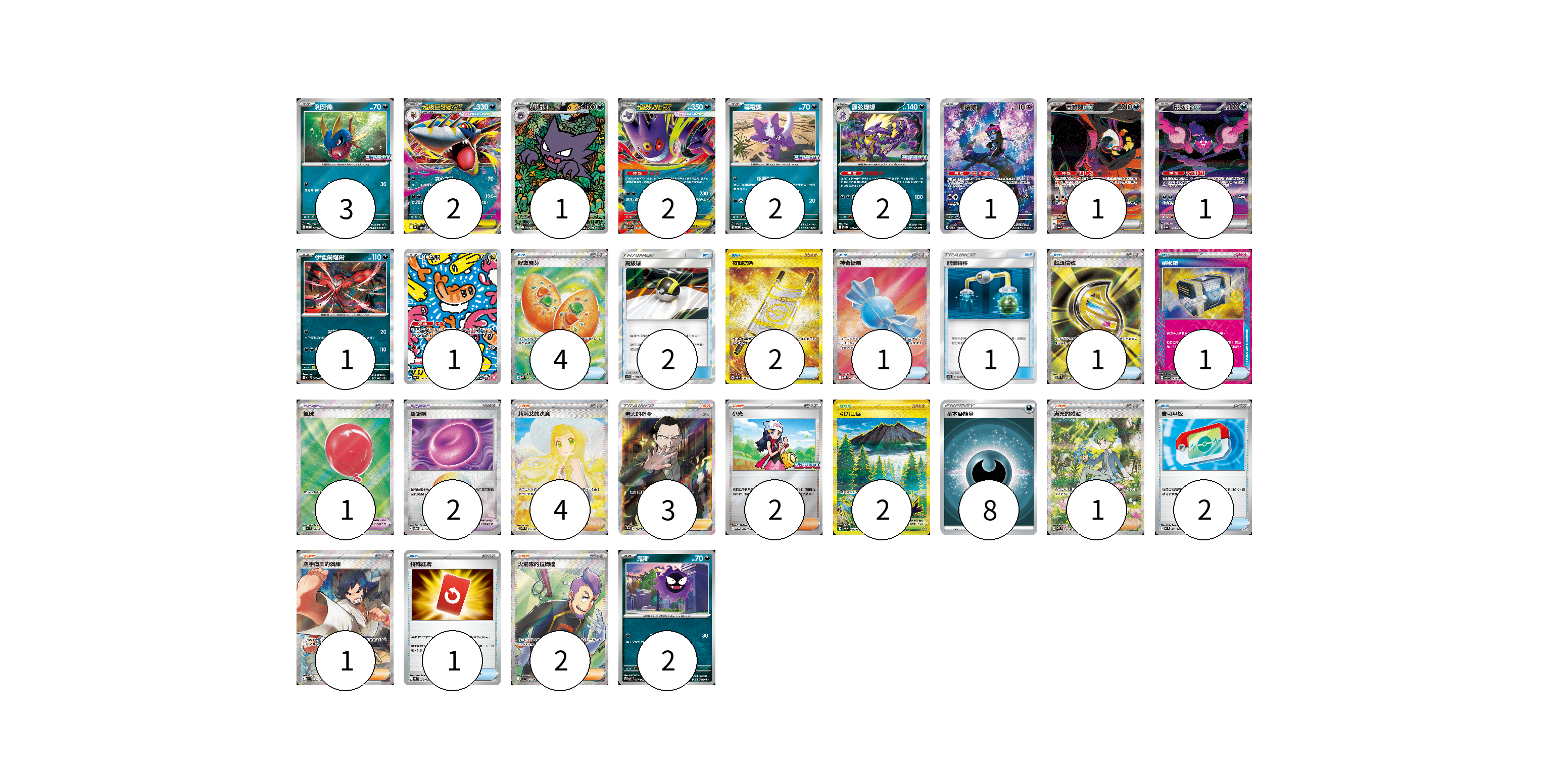 牌組構築方案 以此牌組為基礎新構築牌組 顯示卡面 顯示列表 寶可夢卡(19) 3 2 1 2 2 2 1 1 1 1 1 2 寶可夢道具(3) 1 2 物品卡(15) 4 2 2 1 1 1 1 2 1 支援者卡(13) 4 3 2 1 1 2 競技場卡(2) 2 能量卡(8) 8 寶可夢卡(19) 卡牌名稱 張數 卡牌名稱 張數 利牙魚 M-P 026/M-P 03 超級巨牙鯊ex M2 051/080 02 鬼斯通 MBG 023/022 01 超級耿鬼ex MBG 003/022 02 毒電嬰 M-P 027/M-P 02 顫弦蠑螈 M-P 031/M-P 02 願增猿 SV6 107/101 01 吉雉雞ex SV6a 089/064 01 桃歹郎ex SV6a 090/064 01 伊裴爾塔爾 M1L 040/063 01 米立龍 SV6 112/101 01 鬼斯 M3 047/080 02 寶可夢道具(3) 卡牌名稱 張數 卡牌名稱 張數 氣球 M1L 084/063 01 鎖鏈糬 SV8a 154/187 02 物品卡(15) 卡牌名稱 張數 卡牌名稱 張數 好友寶芬 M1S 081/063 04 高級球 AS5b 178/186 02 夜間擔架 SV8 137/106 02 神奇糖果 M1S 082/063 01 能量轉移 AC1D 132/157 01 超級信號 M1S 083/063 01 秘密箱 SV6 092/101 01 寶可平板 MC 662/742 02 特殊紅牌 M4 072/083 01 支援者卡(13) 卡牌名稱 張數 卡牌名稱 張數 莉莉艾的決意 M1L 091/063 04 老大的指令(坂木) SC1b 170/153 03 小光 M-P 028/M-P 02 滿充的體貼 M1S 091/063 01 空手道王的演練 M2a 220/193 01 火箭隊的拉姆達 SV10 122/098 02 競技場卡(2) 卡牌名稱 張數 卡牌名稱 張數 引力山岳 SV8 138/106 02 能量卡(8) 卡牌名稱 張數 卡牌名稱 張數 基本惡能量 SLD DAR 08 以此牌組為基礎新構築牌組 牌組編碼 dXPajI-raQjIW-JWwpSt copy 列印牌組單 牌組編碼已複製 分享至SNS