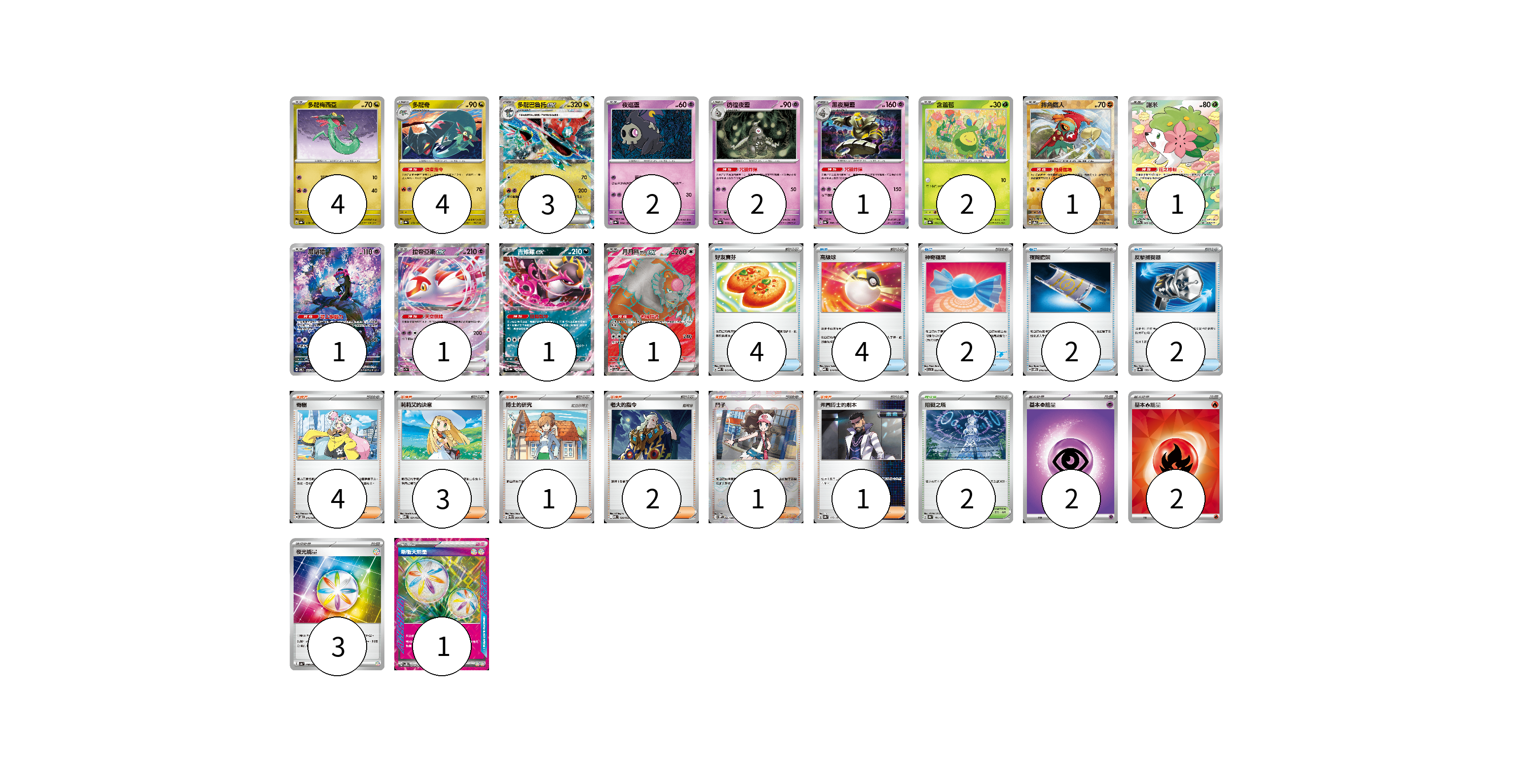 牌組構築方案 以此牌組為基礎新構築牌組 顯示卡面 顯示列表 寶可夢卡(24) 4 4 3 2 2 1 2 1 1 1 1 1 1 物品卡(14) 4 4 2 2 2 支援者卡(12) 4 3 1 2 1 1 競技場卡(2) 2 能量卡(8) 2 2 3 1 寶可夢卡(24) 卡牌名稱 張數 卡牌名稱 張數 多龍梅西亞 SV8a 118/187 04 多龍奇 SV8a 119/187 04 多龍巴魯托ex SV8a 120/187 03 夜巡靈 SV8a 064/187 02 彷徨夜靈 SV8a 065/187 02 黑夜魔靈 SV8a 066/187 01 含羞苞 SV8a 001/187 02 摔角鷹人 SV8a 084/187 01 謝米 SV9a 066/063 01 願增猿 SV6 107/101 01 拉帝亞斯ex SV7a 019/064 01 吉雉雞ex SV8a 104/187 01 月月熊 赫月 ex SV5a 084/066 01 物品卡(14) 卡牌名稱 張數 卡牌名稱 張數 好友寶芬 MBD 013/022 04 高級球 MBD 014/022 04 神奇糖果 SVI 053/066 02 夜間擔架 SVOM 016/021 02 反擊捕捉器 SV8a 139/187 02 支援者卡(12) 卡牌名稱 張數 卡牌名稱 張數 奇樹 SVOD 016/020 04 莉莉艾的決意 MBD 021/022 03 博士的研究 SV11B 084/086 01 老大的指令 MBD 020/022 02 鬥子 SV11W 085/086 01 弗圖博士的劇本 SV8a 175/187 01 競技場卡(2) 卡牌名稱 張數 卡牌名稱 張數 阻礙之塔 SV8a 181/187 02 能量卡(8) 卡牌名稱 張數 卡牌名稱 張數 基本【超】能量 MBD PSY 02 基本【火】能量 SVQL FIR 02 夜光能量 SV4a 190/190 03 新衝天能量 SV5K 071/071 01 以此牌組為基礎新構築牌組 牌組編碼 daOTIo-szyYPE-HSVsUh copy 列印牌組單 牌組編碼已複製 分享至SNS