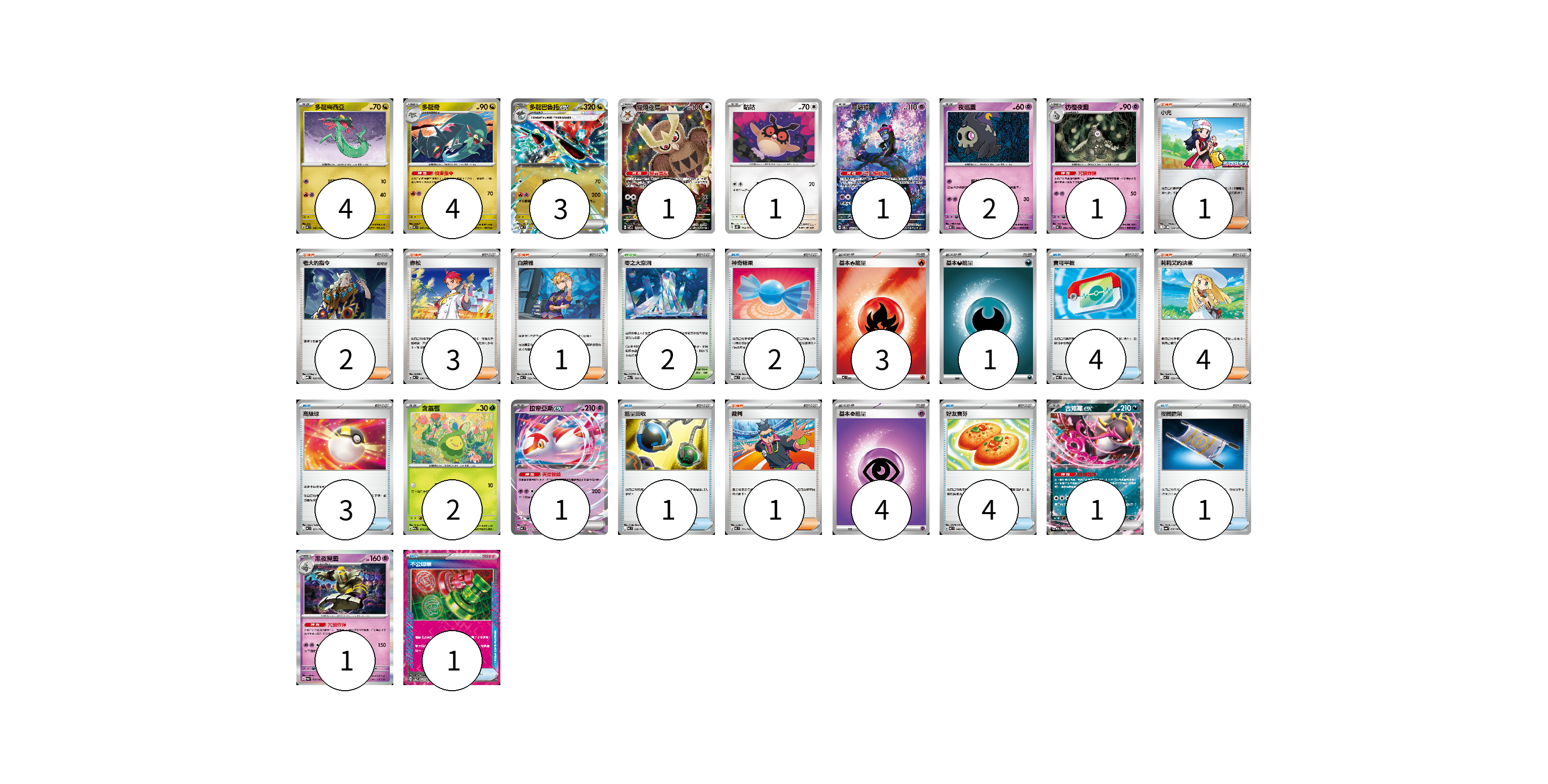 牌組構築方案 以此牌組為基礎新構築牌組 顯示卡面 顯示列表 寶可夢卡(22) 4 4 3 1 1 1 2 1 2 1 1 1 物品卡(16) 2 4 3 1 4 1 1 支援者卡(12) 1 2 3 1 4 1 競技場卡(2) 2 能量卡(8) 3 1 4 寶可夢卡(22) 卡牌名稱 張數 卡牌名稱 張數 多龍梅西亞 MC 546/742 04 多龍奇 MC 547/742 04 多龍巴魯托ex MC 548/742 03 貓頭夜鷹 SV7 114/102 01 咕咕 SV5K 054/071 01 願增猿 SV6 107/101 01 夜巡靈 MC 308/742 02 彷徨夜靈 MC 309/742 01 含羞苞 M2a 011/193 02 拉帝亞斯ex MC 312/742 01 吉雉雞ex M2a 114/193 01 黑夜魔靈 SV6a 020/064 01 物品卡(16) 卡牌名稱 張數 卡牌名稱 張數 神奇糖果 MC 655/742 02 寶可平板 M3 070/080 04 高級球 MC 651/742 03 能量回收 MC 636/742 01 好友寶芬 MC 648/742 04 夜間擔架 SV6a 056/064 01 不公印章 SV5a 053/066 01 支援者卡(12) 卡牌名稱 張數 卡牌名稱 張數 小光 M-P 028/M-P 01 老大的指令 MBD 020/022 02 赤松 MC 696/742 03 白蕾雅 MC 722/742 01 莉莉艾的決意 MC 729/742 04 裁判 MC 711/742 01 競技場卡(2) 卡牌名稱 張數 卡牌名稱 張數 零之大空洞 M2a 184/193 02 能量卡(8) 卡牌名稱 張數 卡牌名稱 張數 基本【火】能量 MC FIR 03 基本【惡】能量 MC DAR 01 基本【超】能量 MC PSY 04 以此牌組為基礎新構築牌組 牌組編碼 dawMeQ-JmChcw-NNrcoY copy 列印牌組單 牌組編碼已複製 分享至SNS