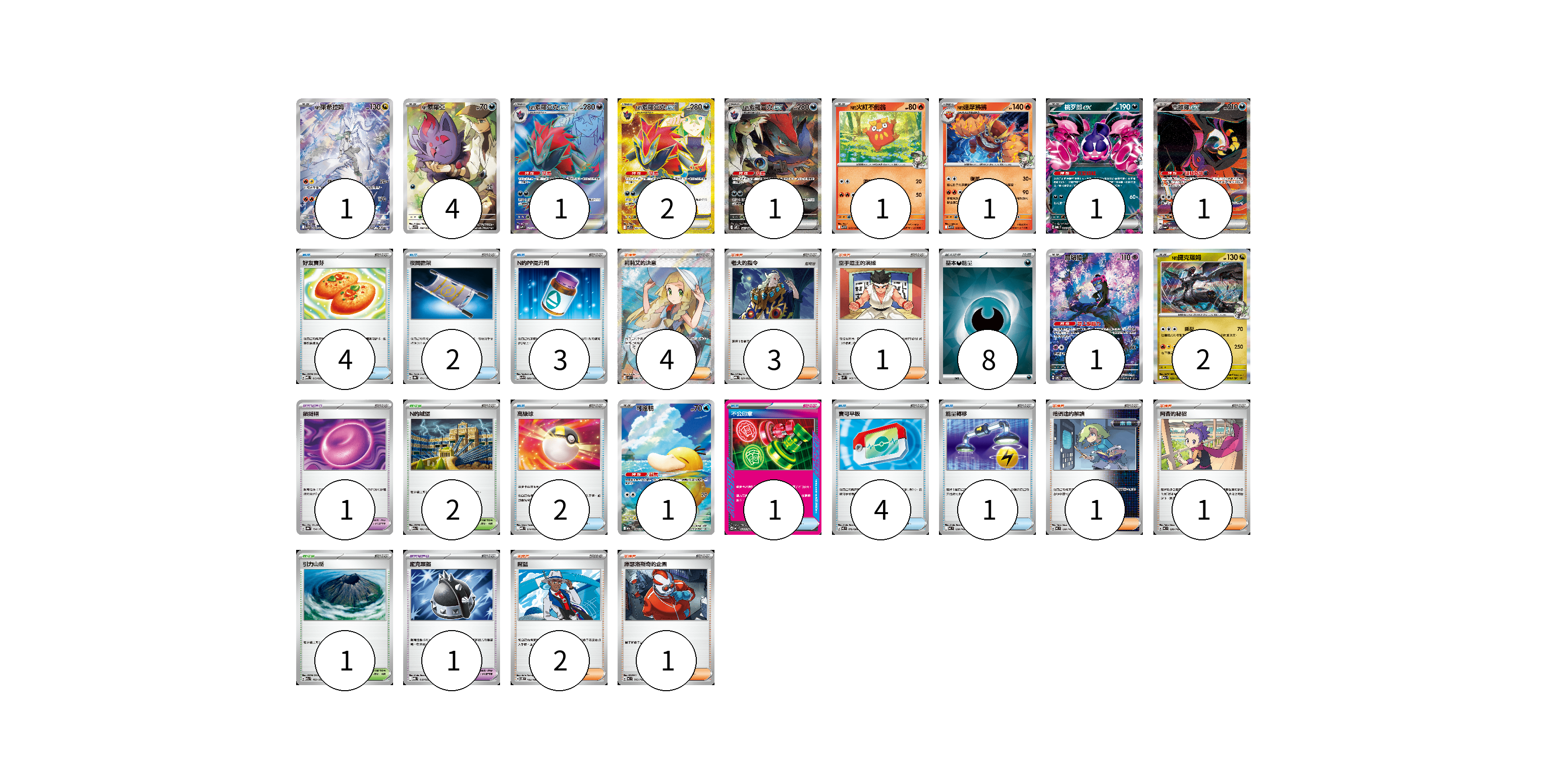 牌組構築方案 以此牌組為基礎新構築牌組 顯示卡面 顯示列表 寶可夢卡(17) 1 4 1 2 1 1 1 1 1 1 2 1 寶可夢道具(2) 1 1 物品卡(17) 4 2 3 2 1 4 1 支援者卡(13) 4 3 1 1 1 2 1 競技場卡(3) 2 1 能量卡(8) 8 寶可夢卡(17) 卡牌名稱 張數 卡牌名稱 張數 N的萊希拉姆 SV9 109/100 01 N的索羅亞 SV9 108/100 04 N的索羅亞克ex SV9 117/100 01 N的索羅亞克ex SV9 131/100 02 N的索羅亞克ex SV9 127/100 01 N的火紅不倒翁 SV9 015/100 01 N的達摩狒狒 SV9 016/100 01 桃歹郎ex MBG 009/022 01 吉雉雞ex SV6a 089/064 01 願增猿 SV6 107/101 01 N的捷克羅姆 M2a 129/193 02 可達鴨 M2a 199/193 01 寶可夢道具(2) 卡牌名稱 張數 卡牌名稱 張數 鎖鏈糬 SV8a 154/187 01 龐克頭盔 MBG 018/022 01 物品卡(17) 卡牌名稱 張數 卡牌名稱 張數 好友寶芬 MBD 013/022 04 夜間擔架 SV8a 151/187 02 N的PP提升劑 SV9 089/100 03 高級球 MBD 014/022 02 不公印章 MC 633/742 01 寶可平板 M3 070/080 04 能量轉移 MC 638/742 01 支援者卡(13) 卡牌名稱 張數 卡牌名稱 張數 莉莉艾的決意 M1L 086/063 04 老大的指令 MBG 021/022 03 空手道王的演練 SVM 143/175 01 暗碼迷的解讀 MC 698/742 01 阿杏的秘招 MC 699/742 01 席藍 SV8 102/106 02 庫瑟洛斯奇的企圖 MC 705/742 01 競技場卡(3) 卡牌名稱 張數 卡牌名稱 張數 N的城堡 M2a 181/193 02 引力山岳 M2a 183/193 01 能量卡(8) 卡牌名稱 張數 卡牌名稱 張數 基本【惡】能量 SVOM DAR 08 以此牌組為基礎新構築牌組 牌組編碼 dizuTi-jIdCKW-swnKDw copy 列印牌組單 牌組編碼已複製 分享至SNS
