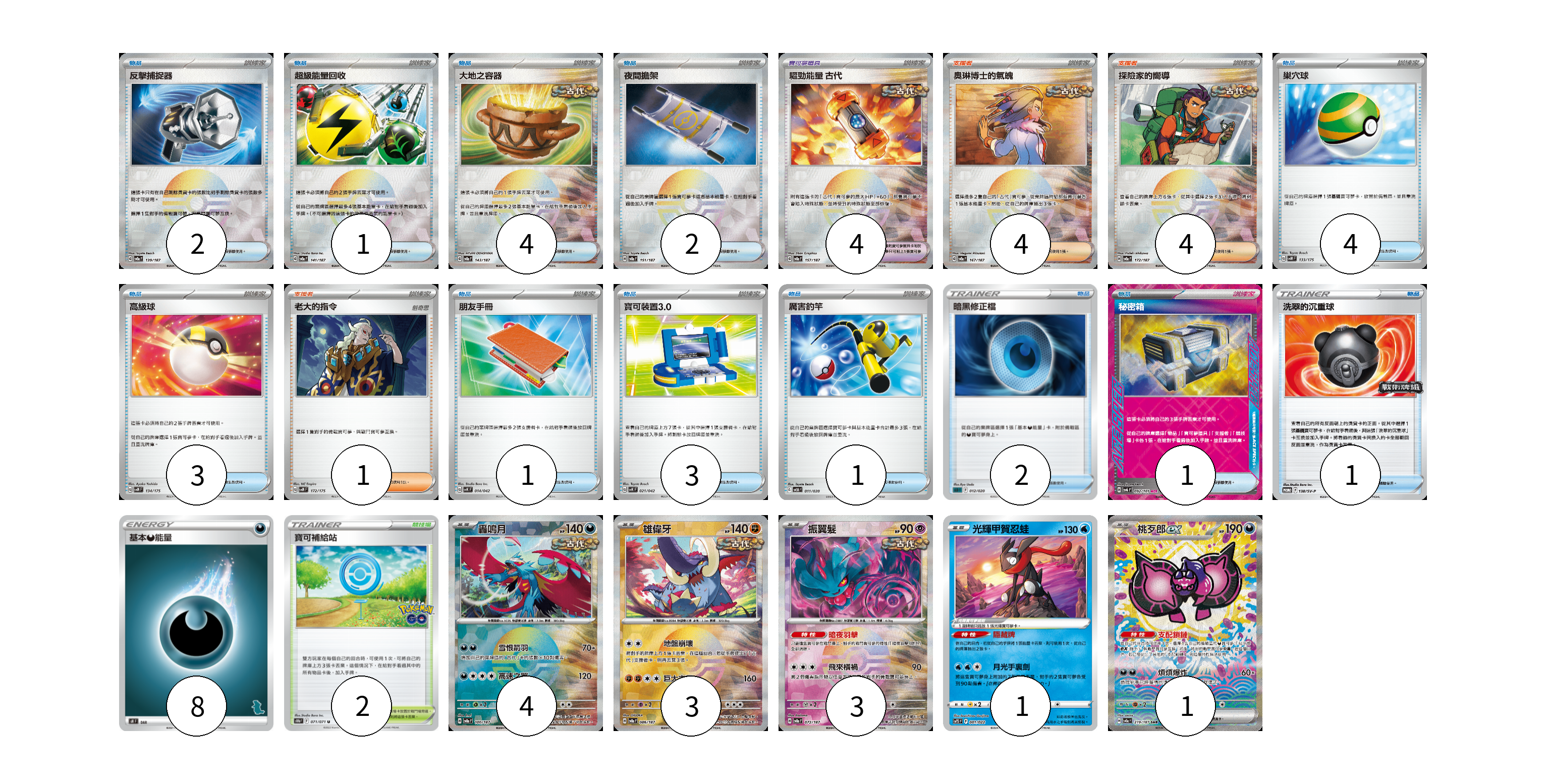 牌組構築方案 以此牌組為基礎新構築牌組 顯示卡面 顯示列表 寶可夢卡(12) 4 3 3 1 1 寶可夢道具(4) 4 物品卡(25) 2 1 4 2 4 3 1 3 1 2 1 1 支援者卡(5) 4 1 競技場卡(2) 2 能量卡(8) 8 寶可夢卡(12) 卡牌名稱 張數 卡牌名稱 張數 轟鳴月 SV8a 100/187 04 雄偉牙 SV8a 086/187 03 振翼髮 SV8a 072/187 03 光輝甲賀忍蛙 SVTS 001/022 01 桃歹郎ex SV8a 219/187 01 寶可夢道具(4) 卡牌名稱 張數 卡牌名稱 張數 驅勁能量 古代 SV8a 157/187 04 物品卡(25) 卡牌名稱 張數 卡牌名稱 張數 反擊捕捉器 SV8a 139/187 02 超級能量回收 SV8a 141/187 01 大地之容器 SV8a 143/187 04 夜間擔架 SV8a 151/187 02 巢穴球 SVM 133/175 04 高級球 SVM 134/175 03 朋友手冊 SVK 014/042 01 寶可裝置3.0 SVK 021/042 03 厲害釣竿 SVEM 011/020 01 暗黑修正檔 SLD 012/020 02 秘密箱 SV6 092/101 01 洗翠的沉重球 SV-P 138/SV-P 01 支援者卡(5) 卡牌名稱 張數 卡牌名稱 張數 奧琳博士的氣魄 SV8a 167/187 04 老大的指令 SVM 172/175 01 競技場卡(2) 卡牌名稱 張數 卡牌名稱 張數 寶可補給站 S10b 071/071 02 能量卡(8) 卡牌名稱 張數 卡牌名稱 張數 基本惡能量 SH DAR 08 以此牌組為基礎新構築牌組 牌組編碼 dkNriY-Cjlmej-dmlGSA copy 列印牌組單 牌組編碼已複製 分享至SNS
