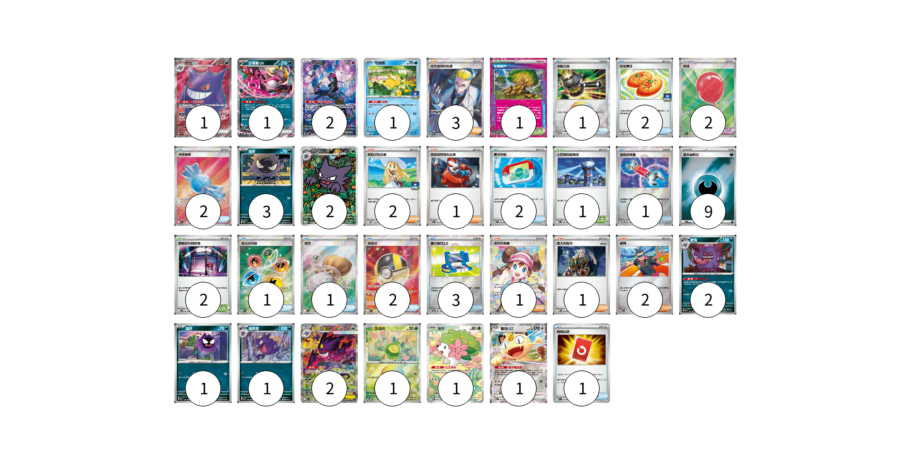 牌組構築方案 以此牌組為基礎新構築牌組 顯示卡面 顯示列表 寶可夢卡(19) 1 1 2 1 3 2 2 1 1 2 1 1 1 寶可夢道具(2) 2 物品卡(16) 1 2 2 2 1 1 1 2 3 1 支援者卡(10) 3 2 1 1 1 2 競技場卡(4) 1 1 2 能量卡(9) 9 寶可夢卡(19) 卡牌名稱 張數 卡牌名稱 張數 耿鬼ex SV5K 088/071 01 吉雉雞ex SVOD 004/020 01 願增猿 SV6 107/101 02 可達鴨 SV-P 220/SV-P 01 鬼斯 MBG 001/022 03 鬼斯通 MBG 023/022 02 耿鬼 M3 049/080 02 鬼斯 M3 047/080 01 鬼斯通 M3 048/080 01 超級耿鬼ex M2a 240/193 02 含羞苞 SV8a 001/187 01 謝米 SV9a 066/063 01 喵喵ex M3 061/080 01 寶可夢道具(2) 卡牌名稱 張數 卡牌名稱 張數 氣球 M1L 084/063 02 物品卡(16) 卡牌名稱 張數 卡牌名稱 張數 改造之錘 SV8a 138/187 01 好友寶芬 SV-P 212/SV-P 02 神奇糖果 M1S 082/063 02 寶可平板 M3 070/080 02 道具拆除器 SV11W 080/086 01 能量回收器 M3 101/080 01 聖灰 M3 102/080 01 高級球 M2a 216/193 02 寶可裝置3.0 SV11B 081/086 03 特殊紅牌 M4 072/083 01 支援者卡(10) 卡牌名稱 張數 卡牌名稱 張數 阿克羅瑪的執著 SV6a 083/064 03 莉莉艾的決意 M-P 018/M-P 02 庫瑟洛斯奇的企圖 MC 705/742 01 鳴依的勉勵 M3 115/080 01 老大的指令 MBD 020/022 01 裁判 MC 711/742 02 競技場卡(4) 卡牌名稱 張數 卡牌名稱 張數 壯偉碩木 SV7 101/102 01 火箭隊的監視塔 M2a 189/193 01 對戰圓形競技場 M2 079/080 02 能量卡(9) 卡牌名稱 張數 卡牌名稱 張數 基本【惡】能量 MC DAR 09 以此牌組為基礎新構築牌組 牌組編碼 dqtRGl-bVgYht-NhGbSf copy 列印牌組單 牌組編碼已複製 分享至SNS