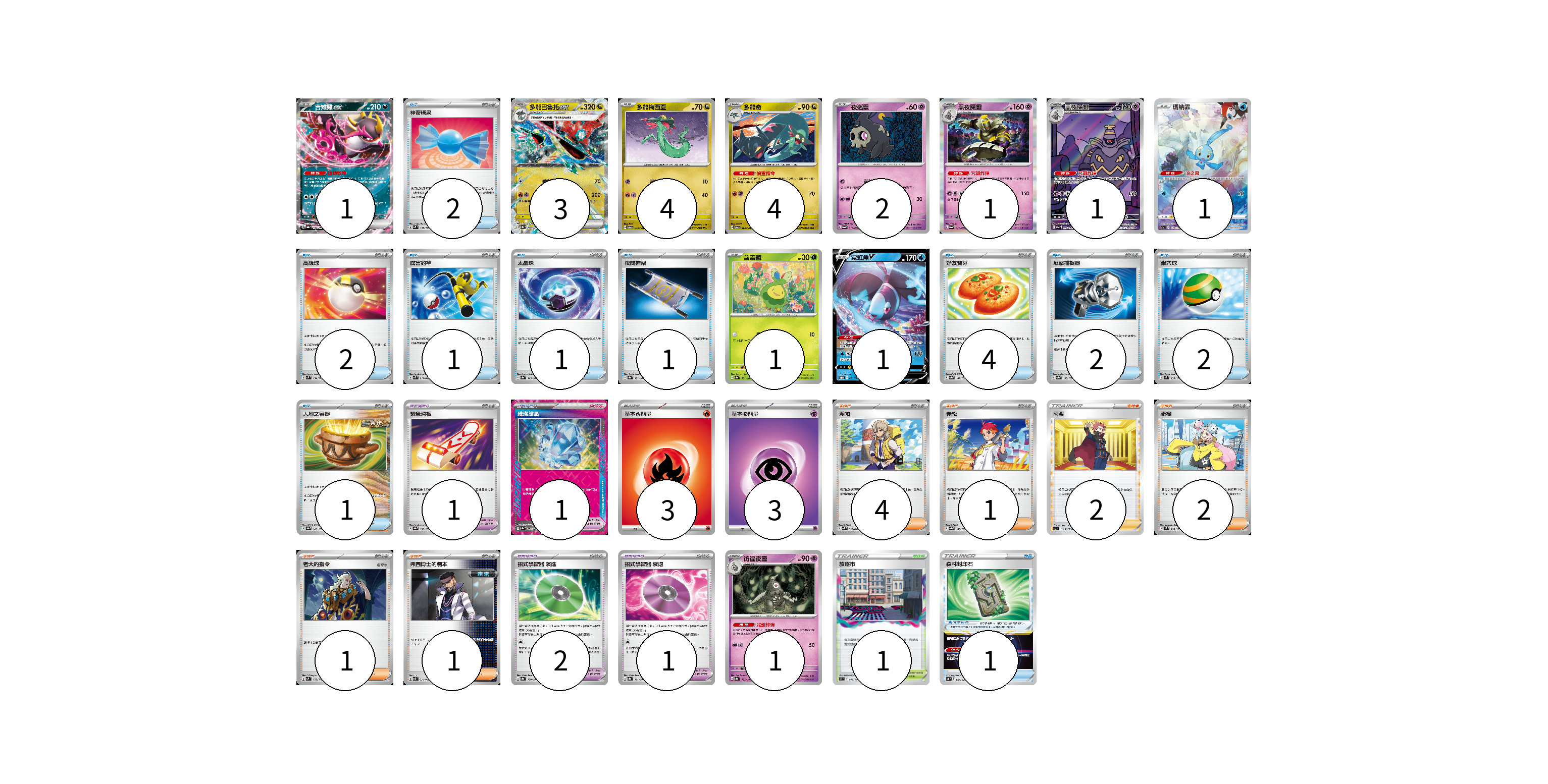牌組構築方案 以此牌組為基礎新構築牌組 顯示卡面 顯示列表 寶可夢卡(20) 1 3 4 4 2 1 1 1 1 1 1 寶可夢道具(5) 1 1 2 1 物品卡(17) 2 2 1 1 1 4 2 2 1 1 支援者卡(11) 4 1 2 2 1 1 競技場卡(1) 1 能量卡(6) 3 3 寶可夢卡(20) 卡牌名稱 張數 卡牌名稱 張數 吉雉雞ex SV8a 104/187 01 多龍巴魯托ex SV8a 120/187 03 多龍梅西亞 SV6 079/101 04 多龍奇 SV6 080/101 04 夜巡靈 SV6a 018/064 02 黑夜魔靈 SV6a 020/064 01 黑夜魔靈 SV6a 070/064 01 瑪納霏 S12a 178/172 01 含羞苞 SV8a 001/187 01 霓虹魚V SVHM 001/022 01 彷徨夜靈 SV8a 065/187 01 寶可夢道具(5) 卡牌名稱 張數 卡牌名稱 張數 緊急滑板 SV8a 153/187 01 璀璨結晶 SV8a 152/187 01 招式學習器 演進 SV8a 160/187 02 招式學習器 衰退 SV8a 161/187 01 物品卡(17) 卡牌名稱 張數 卡牌名稱 張數 神奇糖果 SVM 135/175 02 高級球 SVM 134/175 02 厲害釣竿 SVK 011/042 01 太晶珠 SV8a 145/187 01 夜間擔架 SV8a 151/187 01 好友寶芬 SV8a 147/187 04 反擊捕捉器 SV8a 139/187 02 巢穴球 SVM 133/175 02 大地之容器 SV8a 143/187 01 森林封印石 SVF 024/038 01 支援者卡(11) 卡牌名稱 張數 卡牌名稱 張數 派帕 SVK 035/042 04 赤松 SV8a 163/187 01 阿渡 S12 096/098 02 奇樹 SVM 160/175 02 老大的指令 SVM 172/175 01 弗圖博士的劇本 SVK 034/042 01 競技場卡(1) 卡牌名稱 張數 卡牌名稱 張數 放逐市 S11 099/100 01 能量卡(6) 卡牌名稱 張數 卡牌名稱 張數 基本火能量 sv-p FIR 03 基本超能量 sv-p PSY 03 以此牌組為基礎新構築牌組 牌組編碼 dySjmn-dgRRLC-WYzcJb copy 列印牌組單 牌組編碼已複製 分享至SNS