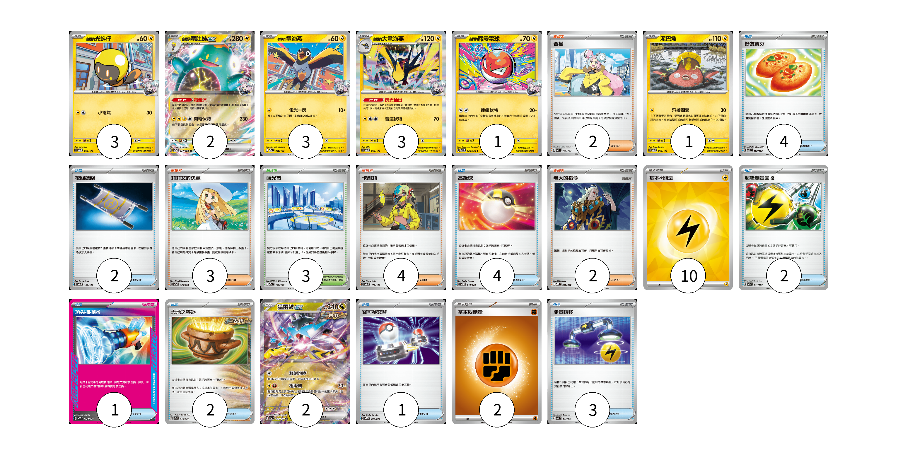 牌組構築方案 以此牌組為基礎新構築牌組 顯示卡面 顯示列表 寶可夢卡(15) 3 2 3 3 1 1 2 物品卡(19) 4 2 4 2 1 2 1 3 支援者卡(11) 2 3 4 2 競技場卡(3) 3 能量卡(12) 10 2 寶可夢卡(15) 卡牌名稱 張數 卡牌名稱 張數 奇樹的光蚪仔 M2a 056/193 03 奇樹的電肚蛙ex M2a 057/193 02 奇樹的電海燕 M2a 058/193 03 奇樹的大電海燕 M2a 059/193 03 奇樹的霹靂電球 SV9 026/100 01 泥巴魚 M2a 050/193 01 猛雷鼓ex SV8a 124/187 02 物品卡(19) 卡牌名稱 張數 卡牌名稱 張數 好友寶芬 M2a 153/193 04 夜間擔架 M2a 159/193 02 高級球 MBD 014/022 04 超級能量回收 SV8a 141/187 02 頂尖捕捉器 MBG 014/022 01 大地之容器 SV8a 143/187 02 寶可夢交替 MBG 015/022 01 能量轉移 SVM 127/175 03 支援者卡(11) 卡牌名稱 張數 卡牌名稱 張數 奇樹 SVK 031/042 02 莉莉艾的決意 M2a 175/193 03 卡娜莉 M2a 170/193 04 老大的指令 MBD 020/022 02 競技場卡(3) 卡牌名稱 張數 卡牌名稱 張數 釀光市 M2a 185/193 03 能量卡(12) 卡牌名稱 張數 卡牌名稱 張數 基本【雷】能量 SVQP LIG 10 基本【鬥】能量 M-P FIG 02 以此牌組為基礎新構築牌組 牌組編碼 eFfVXU-grLjiI-KxCcvf copy 列印牌組單 牌組編碼已複製 分享至SNS