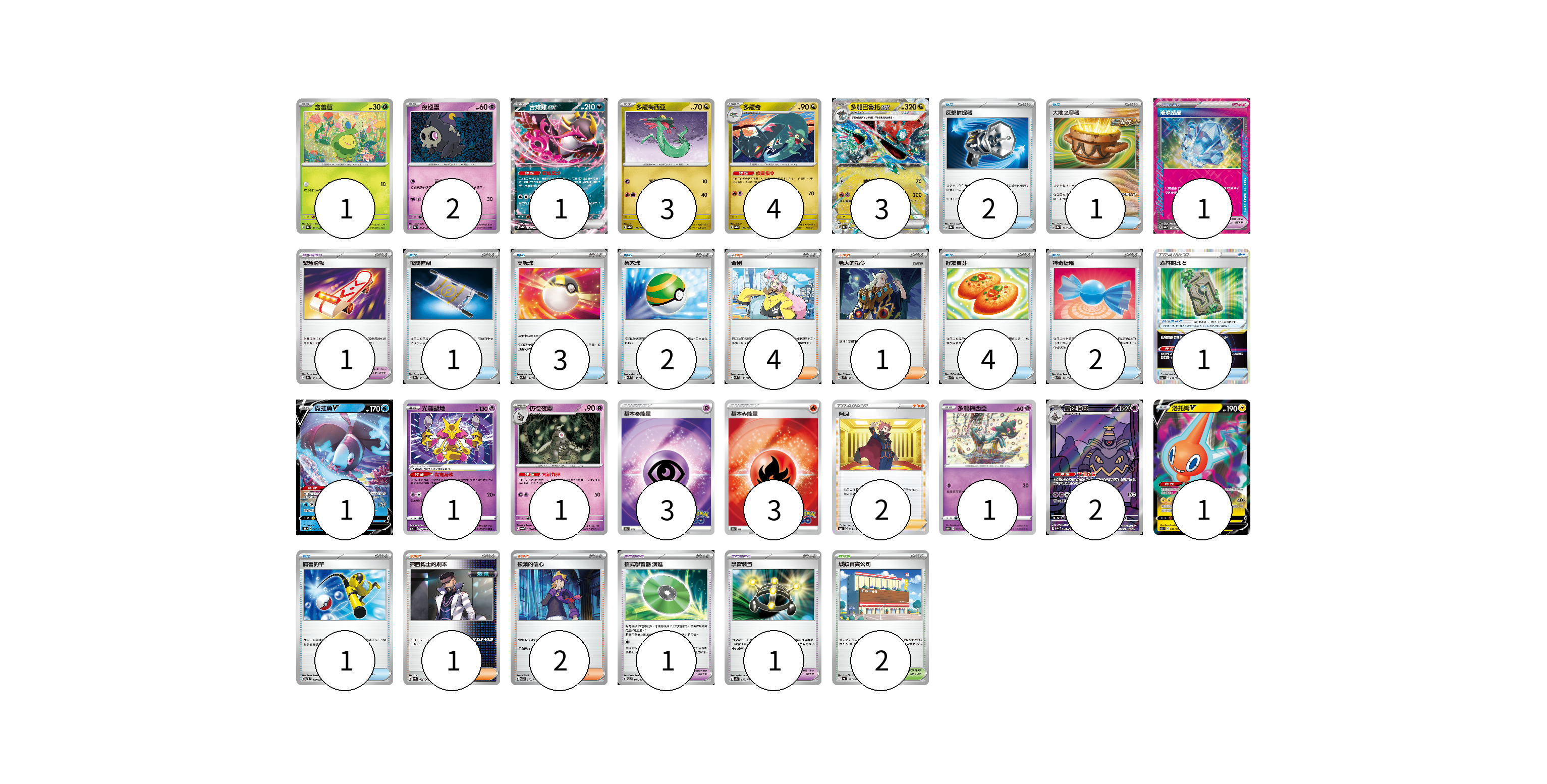 牌組構築方案 以此牌組為基礎新構築牌組 顯示卡面 顯示列表 寶可夢卡(21) 1 2 1 3 4 3 1 1 1 1 2 1 寶可夢道具(5) 1 1 1 1 1 物品卡(16) 2 1 1 3 2 4 2 1 支援者卡(10) 4 1 2 1 2 競技場卡(2) 2 能量卡(6) 3 3 寶可夢卡(21) 卡牌名稱 張數 卡牌名稱 張數 含羞苞 SV8a 001/187 01 夜巡靈 SV8a 064/187 02 吉雉雞ex SV8a 104/187 01 多龍梅西亞 SV8a 118/187 03 多龍奇 SV8a 119/187 04 多龍巴魯托ex SV8a 120/187 03 霓虹魚V SVHM 001/022 01 光輝胡地 SVTM 006/022 01 彷徨夜靈 SV6a 019/064 01 多龍梅西亞 S11 052/100 01 黑夜魔靈 SV6a 070/064 02 洛托姆V S11 037/100 01 寶可夢道具(5) 卡牌名稱 張數 卡牌名稱 張數 璀璨結晶 SV8a 152/187 01 緊急滑板 SV8a 153/187 01 森林封印石 S12 092/098 01 招式學習器 演進 SVTL 017/021 01 學習裝置 SV1S 072/078 01 物品卡(16) 卡牌名稱 張數 卡牌名稱 張數 反擊捕捉器 SV8a 139/187 02 大地之容器 SV8a 143/187 01 夜間擔架 SV8a 151/187 01 高級球 SVM 134/175 03 巢穴球 SVM 133/175 02 好友寶芬 SVK 015/042 04 神奇糖果 SVK 019/042 02 厲害釣竿 SVTL 009/021 01 支援者卡(10) 卡牌名稱 張數 卡牌名稱 張數 奇樹 SVM 160/175 04 老大的指令 SVM 172/175 01 阿渡 S12 096/098 02 弗圖博士的劇本 SV4M 065/066 01 松葉的信心 SV5K 069/071 02 競技場卡(2) 卡牌名稱 張數 卡牌名稱 張數 城鎮百貨公司 SV4a 183/190 02 能量卡(6) 卡牌名稱 張數 卡牌名稱 張數 基本超能量 S10b PSY 03 基本火能量 S10b FIR 03 以此牌組為基礎新構築牌組 牌組編碼 eGRxie-kbHTXf-gjqUJB copy 列印牌組單 牌組編碼已複製 分享至SNS