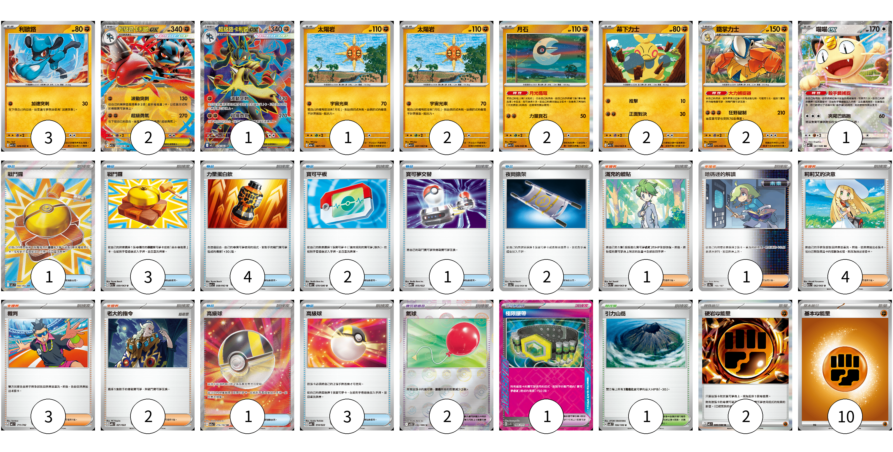 牌組構築方案 以此牌組為基礎新構築牌組 顯示卡面 顯示列表 寶可夢卡(16) 3 2 1 1 2 2 2 2 1 寶可夢道具(3) 2 1 物品卡(17) 1 3 4 2 1 2 1 3 支援者卡(11) 1 1 4 3 2 競技場卡(1) 1 能量卡(12) 2 10 寶可夢卡(16) 卡牌名稱 張數 卡牌名稱 張數 利歐路 M1L 028/063 03 超級路卡利歐ex M1L 029/063 02 超級路卡利歐ex M1L 078/063 01 太陽岩 M2a 087/193 01 太陽岩 M1L 027/063 02 月石 M1L 026/063 02 幕下力士 M1L 024/063 02 鐵掌力士 M1L 025/063 02 喵喵ex M3 061/080 01 寶可夢道具(3) 卡牌名稱 張數 卡牌名稱 張數 氣球 SV11B 082/086 02 極限腰帶 SV5K 066/071 01 物品卡(17) 卡牌名稱 張數 卡牌名稱 張數 戰鬥鑼 M1L 082/063 01 戰鬥鑼 M1L 059/063 03 力量蛋白飲 M1L 058/063 04 寶可平板 M3 070/080 02 寶可夢交替 MBG 015/022 01 夜間擔架 SV6a 056/064 02 高級球 M2a 216/193 01 高級球 MBD 014/022 03 支援者卡(11) 卡牌名稱 張數 卡牌名稱 張數 滿充的體貼 M1S 060/063 01 暗碼迷的解讀 SV8a 165/187 01 莉莉艾的決意 M1L 062/063 04 裁判 MC 711/742 03 老大的指令 MBG 021/022 02 競技場卡(1) 卡牌名稱 張數 卡牌名稱 張數 引力山岳 SV8 106/106 01 能量卡(12) 卡牌名稱 張數 卡牌名稱 張數 硬岩【鬥】能量 M3 080/080 02 基本【鬥】能量 MC FIG 10 以此牌組為基礎新構築牌組 牌組編碼 eKzdpI-JsKRdl-VWVUxw copy 列印牌組單 牌組編碼已複製 分享至SNS