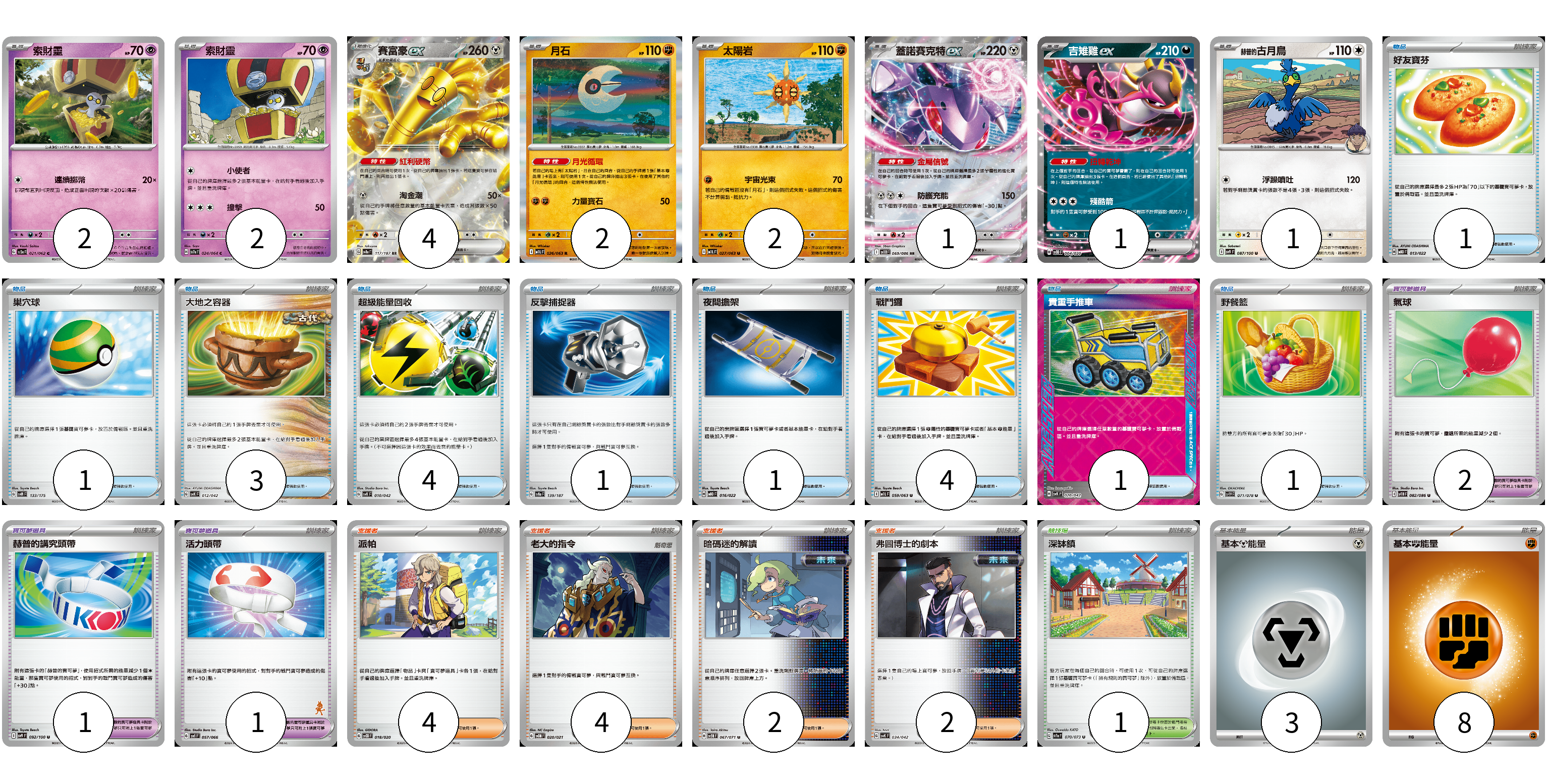 牌組構築方案 以此牌組為基礎新構築牌組 顯示卡面 顯示列表 寶可夢卡(15) 2 2 4 2 2 1 1 1 寶可夢道具(4) 2 1 1 物品卡(17) 1 1 3 4 1 1 4 1 1 支援者卡(12) 4 4 2 2 競技場卡(1) 1 能量卡(11) 3 8 寶可夢卡(15) 卡牌名稱 張數 卡牌名稱 張數 索財靈 SV3a 021/062 02 索財靈 SV7a 024/064 02 賽富豪ex SV8a 117/187 04 月石 M1L 026/063 02 太陽岩 M1L 027/063 02 蓋諾賽克特ex SV11B 069/086 01 吉雉雞ex SVOD 004/020 01 赫普的古月鳥 SV9 087/100 01 寶可夢道具(4) 卡牌名稱 張數 卡牌名稱 張數 氣球 SV11B 082/086 02 赫普的講究頭帶 SV9 092/100 01 活力頭帶 SVI 057/066 01 物品卡(17) 卡牌名稱 張數 卡牌名稱 張數 好友寶芬 MBD 013/022 01 巢穴球 SVM 133/175 01 大地之容器 SVK 012/042 03 超級能量回收 SVK 010/042 04 反擊捕捉器 SV8a 139/187 01 夜間擔架 MBD 016/022 01 戰鬥鑼 M1L 059/063 04 貴重手推車 SVK 020/042 01 野餐籃 SV1V 071/078 01 支援者卡(12) 卡牌名稱 張數 卡牌名稱 張數 派帕 SVOD 018/020 04 老大的指令 SVOM 020/021 04 暗碼迷的解讀 SV5M 067/071 02 弗圖博士的劇本 SVK 034/042 02 競技場卡(1) 卡牌名稱 張數 卡牌名稱 張數 深缽鎮 SV1a 070/073 01 能量卡(11) 卡牌名稱 張數 卡牌名稱 張數 基本【鋼】能量 SVTH MET 03 基本【鬥】能量 M-P FIG 08 以此牌組為基礎新構築牌組 牌組編碼 eLCaZj-yAhhpm-PXnwsw copy 列印牌組單 牌組編碼已複製 分享至SNS