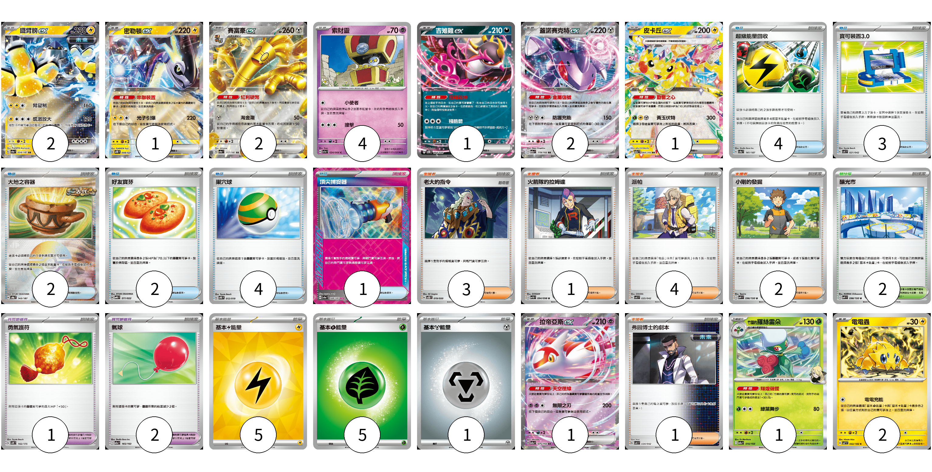 牌組構築方案 以此牌組為基礎新構築牌組 顯示卡面 顯示列表 寶可夢卡(17) 2 1 2 4 1 2 1 1 1 2 寶可夢道具(3) 1 2 物品卡(16) 4 3 2 2 4 1 支援者卡(11) 3 1 4 2 1 競技場卡(2) 2 能量卡(11) 5 5 1 寶可夢卡(17) 卡牌名稱 張數 卡牌名稱 張數 鐵臂膀ex SV8a 054/187 02 密勒頓ex SVTR 008/021 01 賽富豪ex SV8a 117/187 02 索財靈 SV7a 024/064 04 吉雉雞ex SVOD 004/020 01 蓋諾賽克特ex M2a 119/193 02 皮卡丘ex M2a 044/193 01 拉帝亞斯ex M2a 075/193 01 <竹蘭的>羅絲雷朵 M2a 010/193 01 電電蟲 SV7 032/102 02 寶可夢道具(3) 卡牌名稱 張數 卡牌名稱 張數 勇氣護符 SVM 142/175 01 氣球 M2a 165/193 02 物品卡(16) 卡牌名稱 張數 卡牌名稱 張數 超級能量回收 SV8a 141/187 04 寶可裝置3.0 SVK 021/042 03 大地之容器 SV8a 143/187 02 好友寶芬 MBG 011/022 02 巢穴球 SVTG 012/019 04 頂尖捕捉器 SV8a 148/187 01 支援者卡(11) 卡牌名稱 張數 卡牌名稱 張數 老大的指令 SVOD 019/020 03 火箭隊的拉姆達 SV10 094/098 01 派帕 SVK 035/042 04 小剛的發掘 SV9 096/100 02 弗圖博士的劇本 SVK 034/042 01 競技場卡(2) 卡牌名稱 張數 卡牌名稱 張數 釀光市 SV9 098/100 02 能量卡(11) 卡牌名稱 張數 卡牌名稱 張數 基本【雷】能量 SVQP LIG 05 基本【草】能量 M-P GRA 05 基本【鋼】能量 M-P MET 01 以此牌組為基礎新構築牌組 牌組編碼 eQECWC-MCkKgU-edkGrk copy 列印牌組單 牌組編碼已複製 分享至SNS