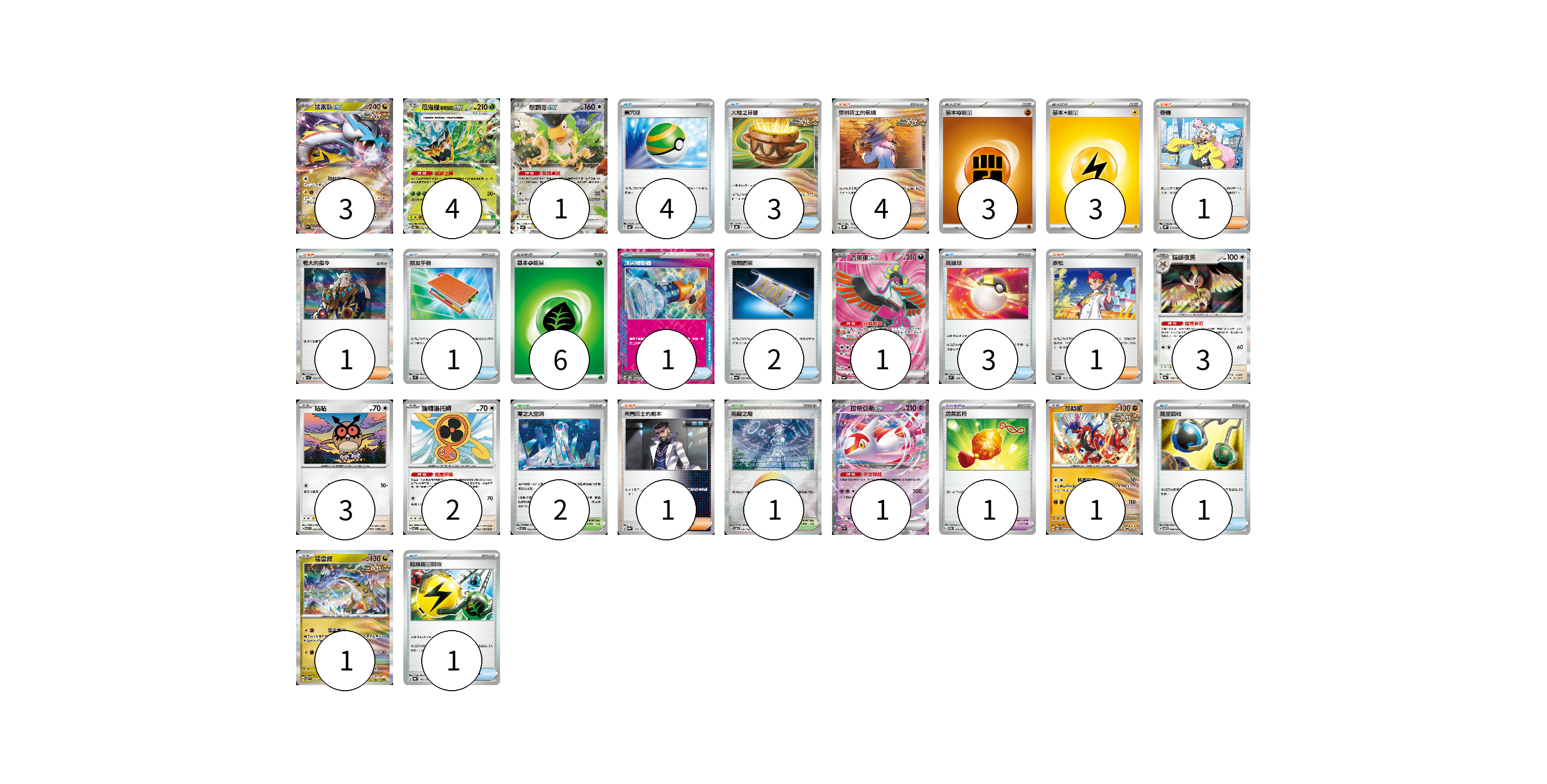 牌組構築方案 以此牌組為基礎新構築牌組 顯示卡面 顯示列表 寶可夢卡(20) 3 4 1 1 3 3 2 1 1 1 寶可夢道具(1) 1 物品卡(16) 4 3 1 1 2 3 1 1 支援者卡(8) 4 1 1 1 1 競技場卡(3) 2 1 能量卡(12) 3 3 6 寶可夢卡(20) 卡牌名稱 張數 卡牌名稱 張數 猛雷鼓ex SV5K 053/071 03 厄鬼椪 碧草面具ex SV6 016/101 04 怒鸚哥ex SV4a 154/190 01 吉雉雞ex SV6a 081/064 01 貓頭夜鷹 SV8a 128/187 03 咕咕 SV7 076/102 03 旋轉洛托姆 SV7 080/102 02 拉帝亞斯ex SV7a 019/064 01 故勒頓 SV8 069/106 01 猛雷鼓 SV7 075/102 01 寶可夢道具(1) 卡牌名稱 張數 卡牌名稱 張數 勇氣護符 SVEM 016/020 01 物品卡(16) 卡牌名稱 張數 卡牌名稱 張數 巢穴球 SV4a 159/190 04 大地之容器 SVHK 011/022 03 朋友手冊 SV1S 069/078 01 頂尖捕捉器 SV5M 062/071 01 夜間擔架 SV6a 056/064 02 高級球 SVM 134/175 03 能量回收 SVTM 009/022 01 超級能量回收 SV8a 141/187 01 支援者卡(8) 卡牌名稱 張數 卡牌名稱 張數 奧琳博士的氣魄 SVHK 017/022 04 奇樹 SVHK 019/022 01 老大的指令 SV1a 069/073 01 赤松 SV8a 163/187 01 弗圖博士的劇本 SV8a 175/187 01 競技場卡(3) 卡牌名稱 張數 卡牌名稱 張數 零之大空洞 SV7 102/102 02 阻礙之塔 SV8a 181/187 01 能量卡(12) 卡牌名稱 張數 卡牌名稱 張數 基本【鬥】能量 SVHK FIG 03 基本【雷】能量 SVHM LIG 03 基本【草】能量 SVF GRA 06 以此牌組為基礎新構築牌組 牌組編碼 eUVRck-ZRZrDh-GwvxyO copy 列印牌組單 牌組編碼已複製 分享至SNS