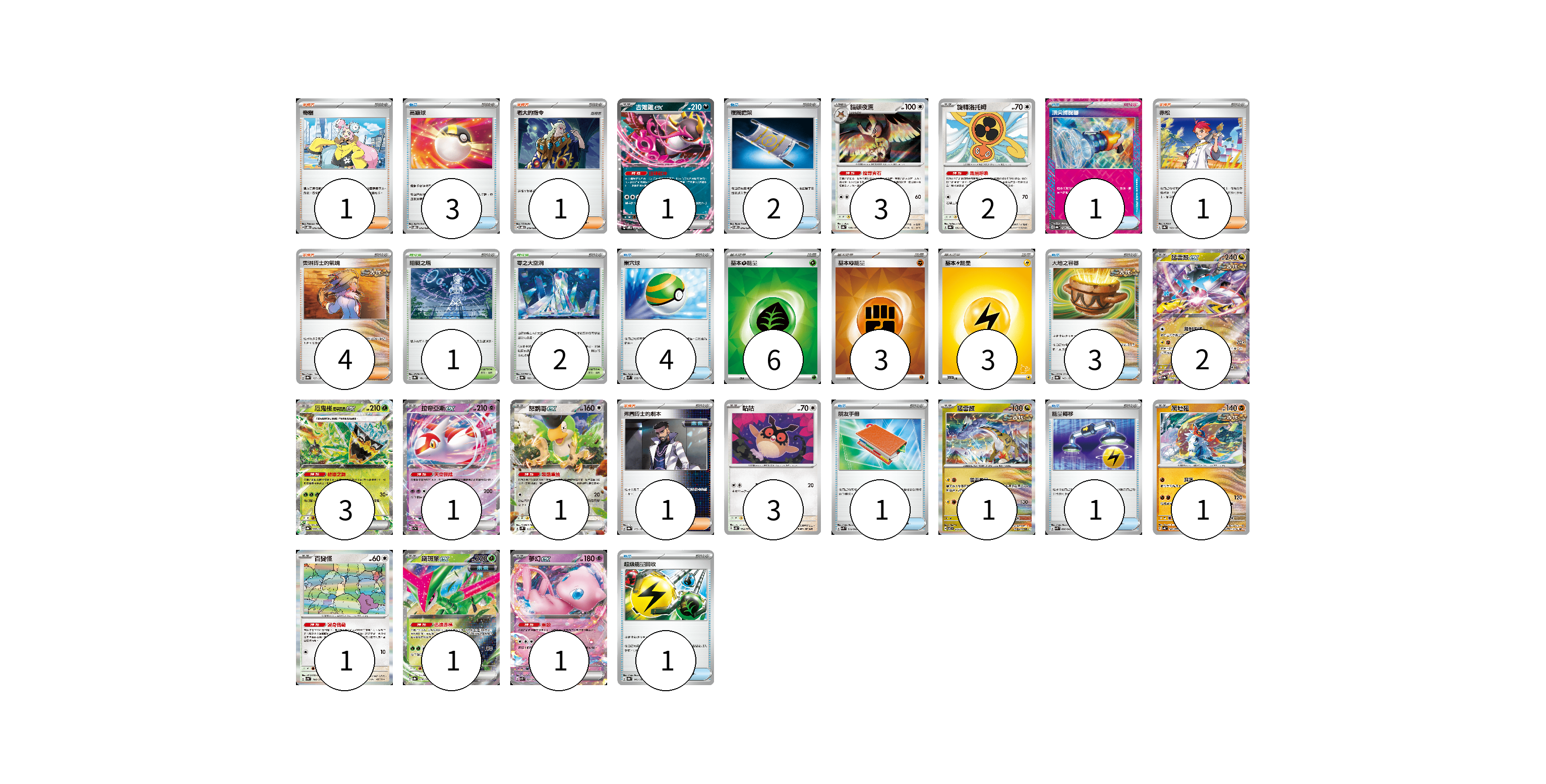 牌組構築方案 以此牌組為基礎新構築牌組 顯示卡面 顯示列表 寶可夢卡(21) 1 3 2 2 3 1 1 3 1 1 1 1 1 物品卡(16) 3 2 1 4 3 1 1 1 支援者卡(8) 1 1 1 4 1 競技場卡(3) 1 2 能量卡(12) 6 3 3 寶可夢卡(21) 卡牌名稱 張數 卡牌名稱 張數 吉雉雞ex SVOM 009/021 01 貓頭夜鷹 SV8a 128/187 03 旋轉洛托姆 SV8a 131/187 02 猛雷鼓ex SV8a 124/187 02 厄鬼椪 碧草面具ex SV8a 020/187 03 拉帝亞斯ex SV7a 019/064 01 怒鸚哥ex SV2P 065/071 01 咕咕 SV5K 054/071 03 猛雷鼓 SV7 075/102 01 爬地翅 SV4K 041/066 01 百變怪 SV4a 144/190 01 鐵斑葉ex SV8a 016/187 01 夢幻ex SVK 001/042 01 物品卡(16) 卡牌名稱 張數 卡牌名稱 張數 高級球 SVOD 012/020 03 夜間擔架 SVOM 016/021 02 頂尖捕捉器 SV8a 148/187 01 巢穴球 SVM 133/175 04 大地之容器 SV8a 143/187 03 朋友手冊 SVK 014/042 01 能量轉移 SVK 008/042 01 超級能量回收 SV8a 141/187 01 支援者卡(8) 卡牌名稱 張數 卡牌名稱 張數 奇樹 SVOD 016/020 01 老大的指令 SVOD 019/020 01 赤松 SV8a 163/187 01 奧琳博士的氣魄 SV8a 167/187 04 弗圖博士的劇本 SV8a 175/187 01 競技場卡(3) 卡牌名稱 張數 卡牌名稱 張數 阻礙之塔 SV8a 181/187 01 零之大空洞 SV8a 182/187 02 能量卡(12) 卡牌名稱 張數 卡牌名稱 張數 基本【草】能量 SVK GRA 06 基本【鬥】能量 SVK FIG 03 基本【雷】能量 SVI LIG 03 以此牌組為基礎新構築牌組 牌組編碼 eUuoMB-KYeDKa-ZGkLgl copy 列印牌組單 牌組編碼已複製 分享至SNS