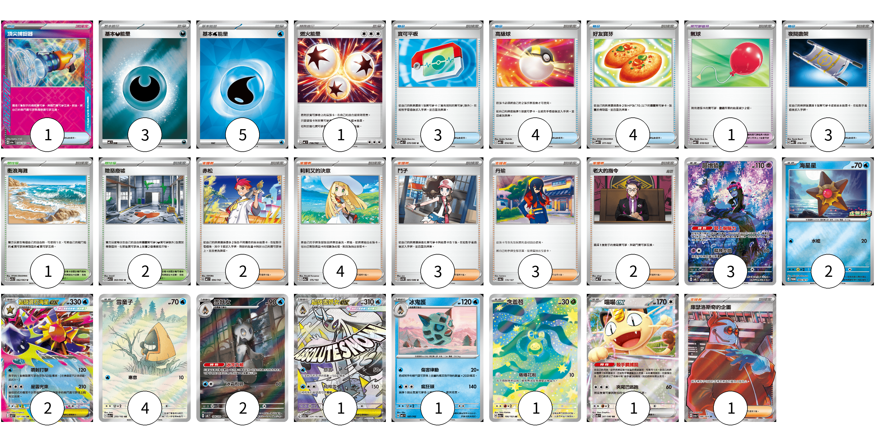牌組構築方案 以此牌組為基礎新構築牌組 顯示卡面 顯示列表 寶可夢卡(17) 3 2 2 4 2 1 1 1 1 物品卡(16) 1 3 4 4 1 3 支援者卡(15) 2 4 3 3 2 1 競技場卡(3) 1 2 能量卡(9) 3 5 1 寶可夢卡(17) 卡牌名稱 張數 卡牌名稱 張數 願增猿 SV6 107/101 03 海星星 M-P 066/M-P 02 超級寶石海星ex M3 021/080 02 雪童子 M2a 200/193 04 雪妖女 SV6 104/101 02 超級雪妖女ex M2a 224/193 01 冰鬼護 MC 187/742 01 含羞苞 M2a 196/193 01 喵喵ex M3 061/080 01 物品卡(16) 卡牌名稱 張數 卡牌名稱 張數 頂尖捕捉器 SV8a 148/187 01 寶可平板 M3 070/080 03 高級球 MBD 014/022 04 好友寶芬 MBG 011/022 04 氣球 MBD 018/022 01 夜間擔架 MBD 016/022 03 支援者卡(15) 卡牌名稱 張數 卡牌名稱 張數 赤松 MC 696/742 02 莉莉艾的決意 M2a 175/193 04 鬥子 SV11W 085/086 03 丹瑜 SV8a 170/187 03 老大的指令 MC 724/742 02 庫瑟洛斯奇的企圖 SV6a 086/064 01 競技場卡(3) 卡牌名稱 張數 卡牌名稱 張數 衝浪海灘 M1S 062/063 01 險惡廢墟 M1L 063/063 02 能量卡(9) 卡牌名稱 張數 卡牌名稱 張數 基本【惡】能量 MC DAR 03 基本【水】能量 SVM WAT 05 燃火能量 MC 736/742 01 以此牌組為基礎新構築牌組 牌組編碼 eWeSZV-LzWoxM-qYLGDs copy 列印牌組單 牌組編碼已複製 分享至SNS