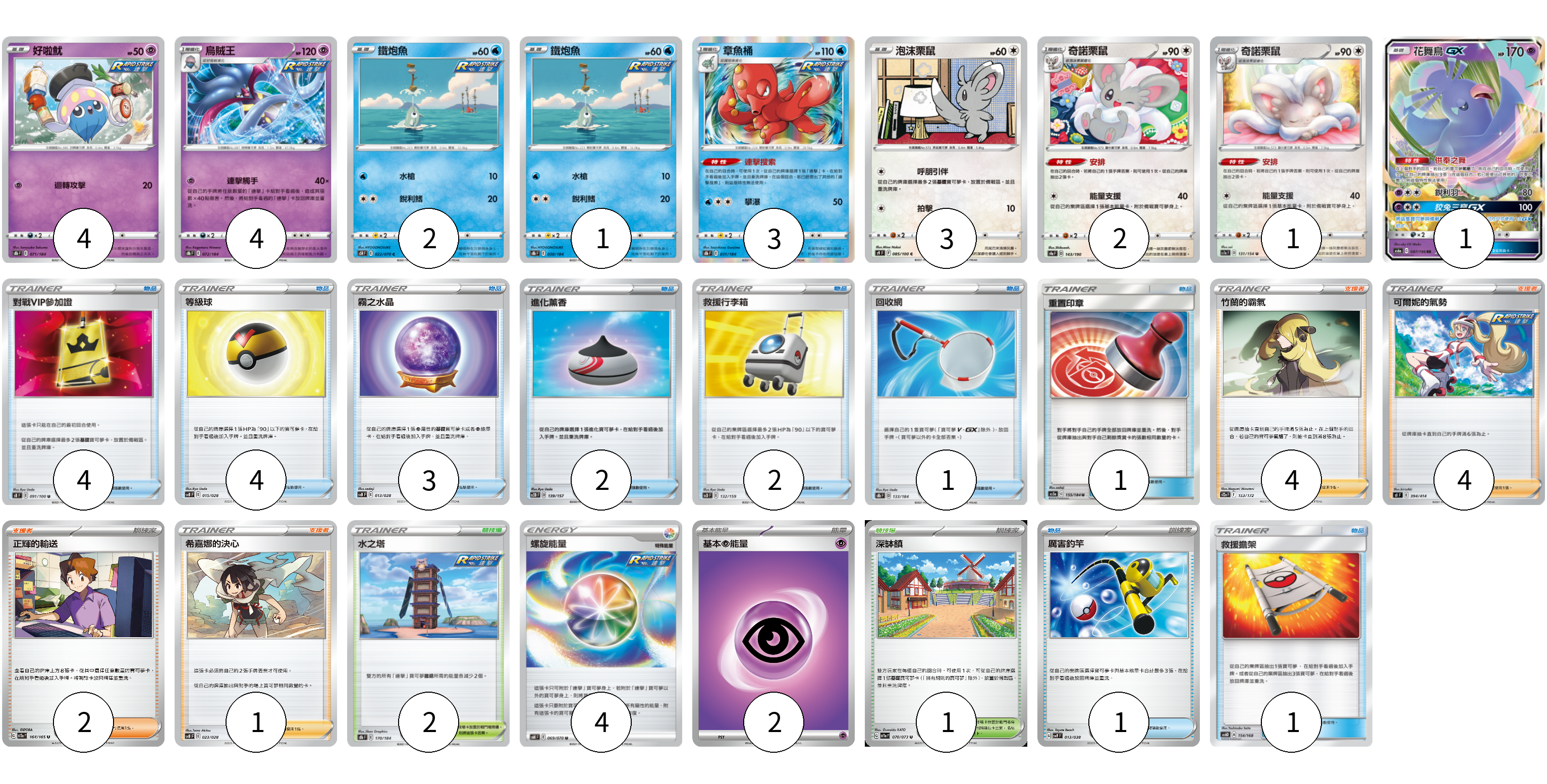 牌組構築方案 以此牌組為基礎新構築牌組 顯示卡面 顯示列表 寶可夢卡(21) 4 4 2 1 3 3 2 1 1 物品卡(19) 4 4 3 2 2 1 1 1 1 支援者卡(11) 4 4 2 1 競技場卡(3) 2 1 能量卡(6) 4 2 寶可夢卡(21) 卡牌名稱 張數 卡牌名稱 張數 好啦魷 S8b 071/184 04 烏賊王 S8b 072/184 04 鐵炮魚 S5R 022/070 02 鐵炮魚 S8b 030/184 01 章魚桶 S8b 031/184 03 泡沫栗鼠 S9 085/100 03 奇諾栗鼠 S4a 143/190 02 奇諾栗鼠 SC1a 131/154 01 花舞鳥GX AS6a 087/196 01 物品卡(19) 卡牌名稱 張數 卡牌名稱 張數 對戰VIP參加證 S8 091/100 04 等級球 SVB 015/028 04 霧之水晶 SVB 013/028 03 進化薰香 SC2D 139/157 02 救援行李箱 SCD 132/159 02 回收網 S8b 133/184 01 重置印章 AS5a 155/184 01 厲害釣竿 SVF 013/038 01 救援擔架 AS6D 154/168 01 支援者卡(11) 卡牌名稱 張數 卡牌名稱 張數 竹蘭的霸氣 S12a 153/172 04 可爾妮的氣勢 SI 394/414 04 正輝的輸送 SV2a 164/165 02 希嘉娜的決心 SVB 023/028 01 競技場卡(3) 卡牌名稱 張數 卡牌名稱 張數 水之塔 S8b 170/184 02 深缽鎮 SV1a 070/073 01 能量卡(6) 卡牌名稱 張數 卡牌名稱 張數 螺旋能量 S6K 069/070 04 基本【超】能量 SVD PSY 02 以此牌組為基礎新構築牌組 牌組編碼 eWgEzJ-FvkhIK-JQJFzL copy 列印牌組單 牌組編碼已複製 分享至SNS