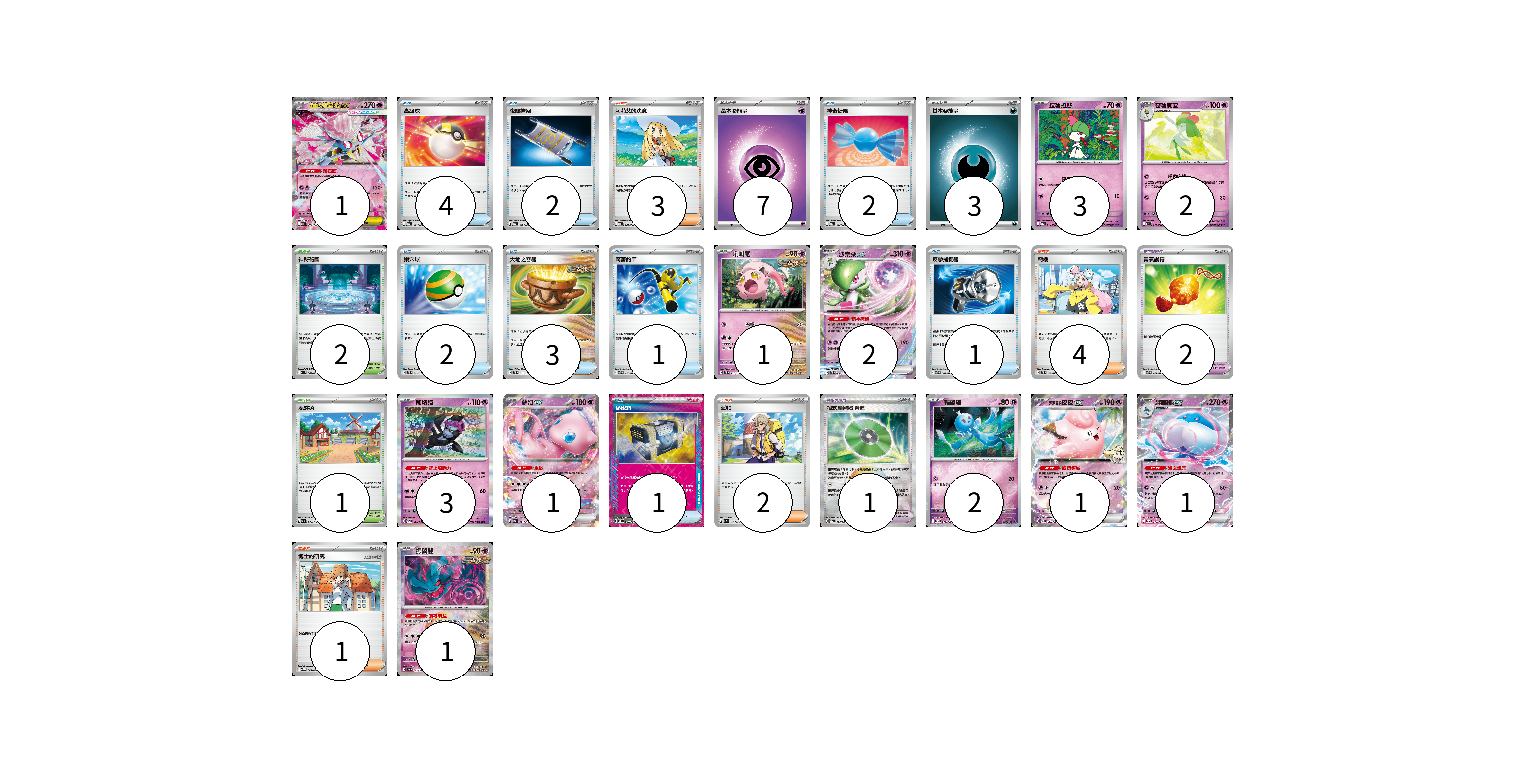 牌組構築方案 以此牌組為基礎新構築牌組 顯示卡面 顯示列表 寶可夢卡(18) 1 3 2 1 2 3 1 2 1 1 1 寶可夢道具(3) 2 1 物品卡(16) 4 2 2 2 3 1 1 1 支援者卡(10) 3 4 2 1 競技場卡(3) 2 1 能量卡(10) 7 3 寶可夢卡(18) 卡牌名稱 張數 卡牌名稱 張數 超級蒂安希ex MBD 006/022 01 拉魯拉絲 M1S 040/063 03 奇魯莉安 M1S 041/063 02 吼叫尾 SVTS 007/022 01 沙奈朵ex SVTS 004/022 02 願增猿 SV6 055/101 03 夢幻ex SV2a 151/165 01 輕飄飄 SV11W 041/086 02 莉莉艾的皮皮ex SV9 033/100 01 胖嘟嘟ex SV11W 042/086 01 振翼髮 SV8a 072/187 01 寶可夢道具(3) 卡牌名稱 張數 卡牌名稱 張數 勇氣護符 SVTS 017/022 02 招式學習器 演進 SV8a 160/187 01 物品卡(16) 卡牌名稱 張數 卡牌名稱 張數 高級球 MBD 014/022 04 夜間擔架 MBD 016/022 02 神奇糖果 MBG 013/022 02 巢穴球 SVTS 013/022 02 大地之容器 SVTS 011/022 03 厲害釣竿 SVTS 010/022 01 反擊捕捉器 SVTS 009/022 01 秘密箱 SV6 092/101 01 支援者卡(10) 卡牌名稱 張數 卡牌名稱 張數 莉莉艾的決意 MBD 021/022 03 奇樹 SVTS 018/022 04 派帕 SV1V 076/078 02 博士的研究 SV11B 084/086 01 競技場卡(3) 卡牌名稱 張數 卡牌名稱 張數 神秘花園 M1S 063/063 02 深缽鎮 SV1a 070/073 01 能量卡(10) 卡牌名稱 張數 卡牌名稱 張數 基本【超】能量 MBD PSY 07 基本【惡】能量 MBG DAR 03 以此牌組為基礎新構築牌組 牌組編碼 eWmMnG-zEogcT-auweoS copy 列印牌組單 牌組編碼已複製 分享至SNS