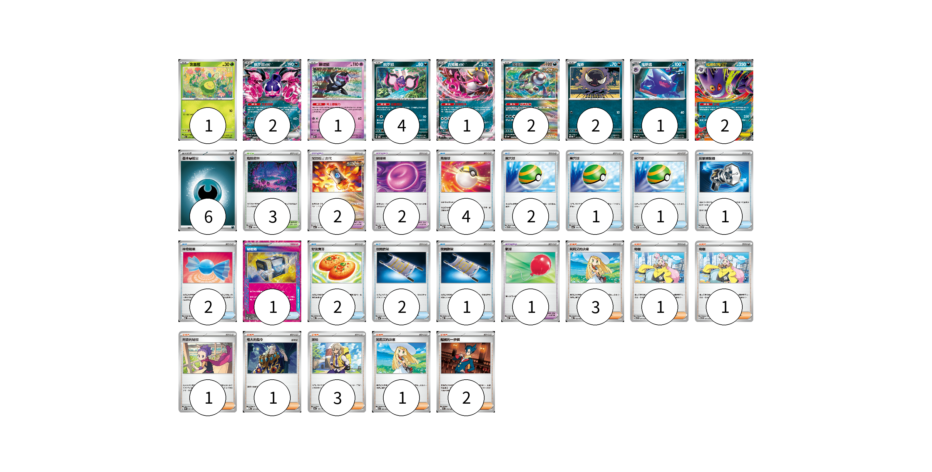 牌組構築方案 以此牌組為基礎新構築牌組 顯示卡面 顯示列表 寶可夢卡(16) 1 2 1 4 1 2 2 1 2 寶可夢道具(5) 2 2 1 物品卡(17) 4 2 1 1 1 2 1 2 2 1 支援者卡(13) 3 1 1 1 1 3 1 2 競技場卡(3) 3 能量卡(6) 6 寶可夢卡(16) 卡牌名稱 張數 卡牌名稱 張數 含羞苞 M2a 011/193 01 桃歹郎ex SV6a 039/064 02 願增猿 SV8a 075/187 01 桃歹郎 SV8 075/106 04 吉雉雞ex SV6a 038/064 01 猛惡菇 SV8a 099/187 02 鬼斯 MBG 001/022 02 鬼斯通 MBG 002/022 01 超級耿鬼ex MBG 003/022 02 寶可夢道具(5) 卡牌名稱 張數 卡牌名稱 張數 驅勁能量 古代 SV4K 061/066 02 鎖鏈糬 SV8a 154/187 02 氣球 MBG 019/022 01 物品卡(17) 卡牌名稱 張數 卡牌名稱 張數 高級球 MBG 012/022 04 巢穴球 SVTR 013/021 02 巢穴球 SV4a 159/190 01 巢穴球 SVAL 012/021 01 反擊捕捉器 SVTS 009/022 01 神奇糖果 MBG 013/022 02 秘密箱 SV6 092/101 01 好友寶芬 MBG 011/022 02 夜間擔架 SV6a 056/064 02 夜間擔架 MBG 017/022 01 支援者卡(13) 卡牌名稱 張數 卡牌名稱 張數 莉莉艾的決意 MBG 022/022 03 奇樹 SVTR 017/021 01 奇樹 SVTG 017/019 01 阿杏的秘招 SV6a 060/064 01 老大的指令 MBG 021/022 01 派帕 SV4a 180/190 03 莉莉艾的決意 M1L 062/063 01 越橘的一步棋 M2 076/080 02 競技場卡(3) 卡牌名稱 張數 卡牌名稱 張數 危險密林 SV5K 070/071 03 能量卡(6) 卡牌名稱 張數 卡牌名稱 張數 基本【惡】能量 M-P DAR 06 以此牌組為基礎新構築牌組 牌組編碼 ebaPtS-hGKUNt-tLIxsN copy 列印牌組單 牌組編碼已複製 分享至SNS