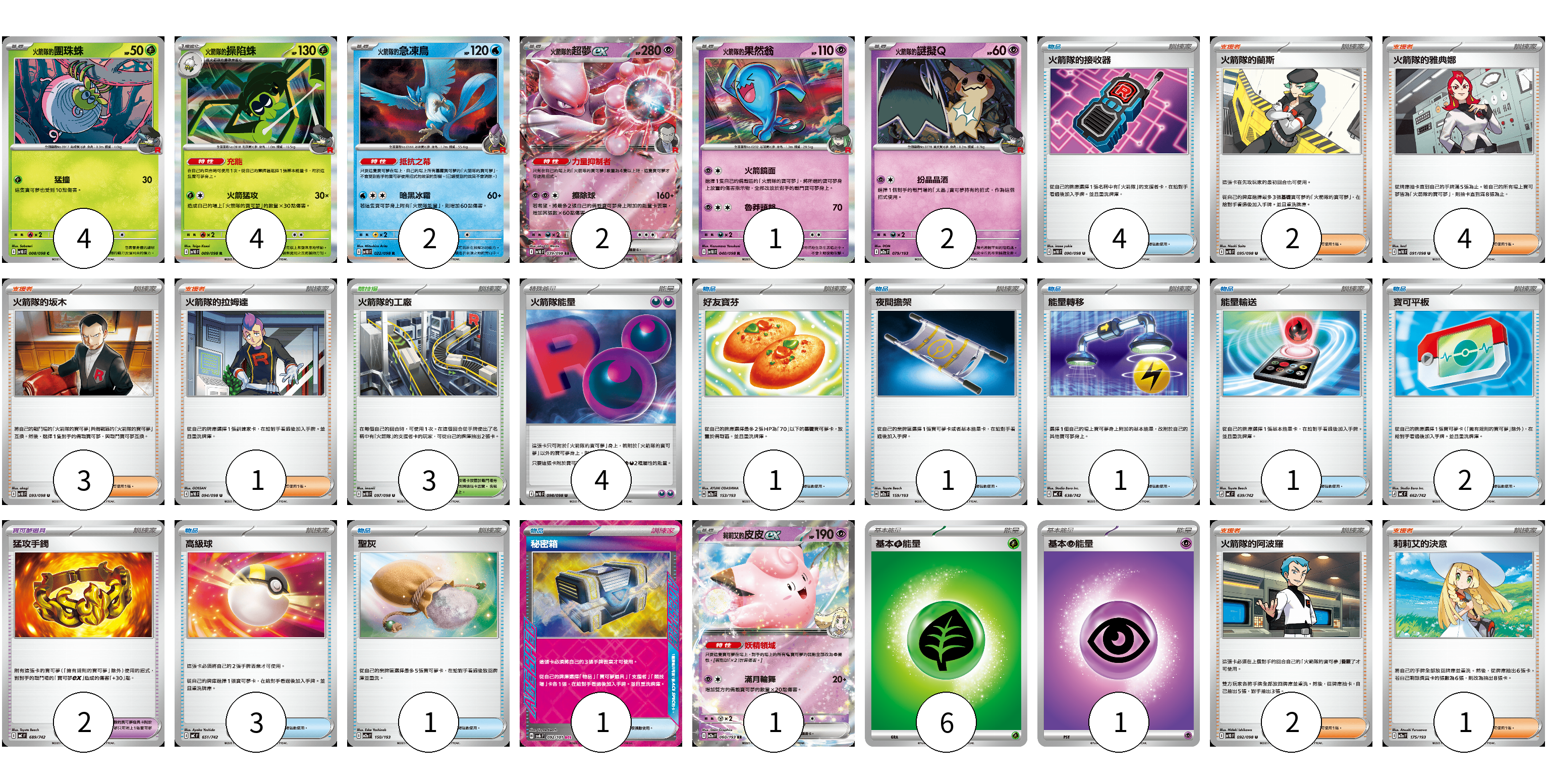 牌組構築方案 以此牌組為基礎新構築牌組 顯示卡面 顯示列表 寶可夢卡(16) 4 4 2 2 1 2 1 寶可夢道具(2) 2 物品卡(15) 4 1 1 1 1 2 3 1 1 支援者卡(13) 2 4 3 1 2 1 競技場卡(3) 3 能量卡(11) 4 6 1 寶可夢卡(16) 卡牌名稱 張數 卡牌名稱 張數 <火箭隊的>團珠蛛 SV10 008/098 04 <火箭隊的>操陷蛛 SV10 009/098 04 <火箭隊的>急凍鳥 SV10 022/098 02 <火箭隊的>超夢ex SV10 039/098 02 <火箭隊的>果然翁 SV10 040/098 01 <火箭隊的>謎擬Q M2a 079/193 02 莉莉艾的皮皮ex M2a 060/193 01 寶可夢道具(2) 卡牌名稱 張數 卡牌名稱 張數 猛攻手鐲 MC 689/742 02 物品卡(15) 卡牌名稱 張數 卡牌名稱 張數 火箭隊的接收器 SV10 090/098 04 好友寶芬 M2a 153/193 01 夜間擔架 M2a 159/193 01 能量轉移 MC 638/742 01 能量輸送 MC 639/742 01 寶可平板 MC 662/742 02 高級球 MC 651/742 03 聖灰 M2a 150/193 01 秘密箱 SV6 092/101 01 支援者卡(13) 卡牌名稱 張數 卡牌名稱 張數 火箭隊的蘭斯 SV10 095/098 02 火箭隊的雅典娜 SV10 091/098 04 火箭隊的坂木 SV10 093/098 03 火箭隊的拉姆達 SV10 094/098 01 火箭隊的阿波羅 SV10 092/098 02 莉莉艾的決意 M2a 175/193 01 競技場卡(3) 卡牌名稱 張數 卡牌名稱 張數 火箭隊的工廠 SV10 097/098 03 能量卡(11) 卡牌名稱 張數 卡牌名稱 張數 火箭隊能量 SV10 098/098 04 基本【草】能量 MJ GRA 06 基本【超】能量 M-P PSY 01 以此牌組為基礎新構築牌組 牌組編碼 ebipxA-CTAgoc-uuDdzx copy 列印牌組單 牌組編碼已複製 分享至SNS