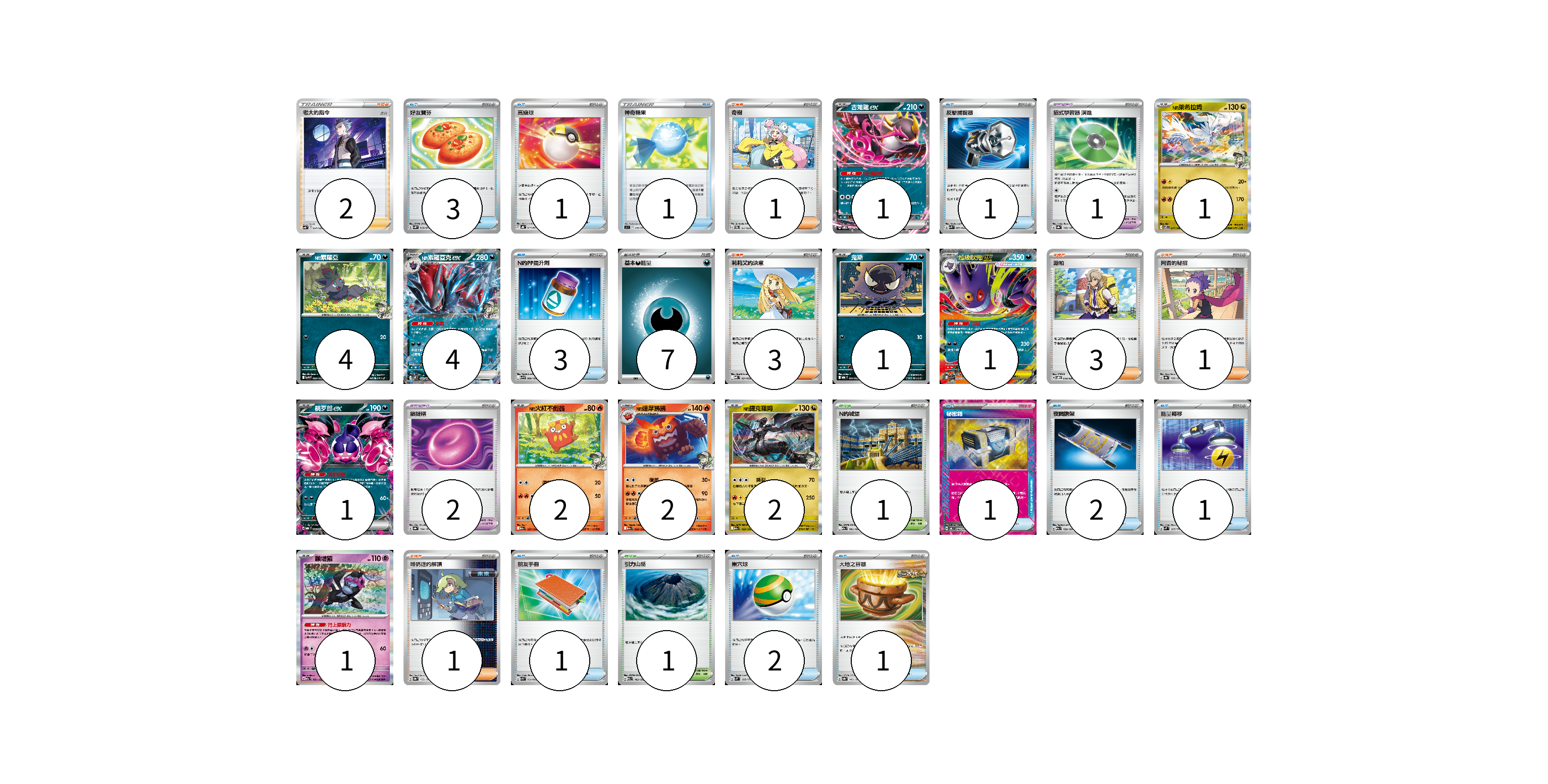 牌組構築方案 以此牌組為基礎新構築牌組 顯示卡面 顯示列表 寶可夢卡(20) 1 1 4 4 1 1 1 2 2 2 1 寶可夢道具(3) 1 2 物品卡(17) 3 1 1 1 3 1 2 1 1 2 1 支援者卡(11) 2 1 3 3 1 1 競技場卡(2) 1 1 能量卡(7) 7 寶可夢卡(20) 卡牌名稱 張數 卡牌名稱 張數 吉雉雞ex SVOM 009/021 01 N的萊希拉姆 SV9 074/100 01 N的索羅亞 SV9 060/100 04 N的索羅亞克ex SV9 061/100 04 鬼斯 MBG 001/022 01 超級耿鬼ex MBG 003/022 01 桃歹郎ex MBG 009/022 01 N的火紅不倒翁 M2a 027/193 02 N的達摩狒狒 M2a 028/193 02 N的捷克羅姆 M2a 129/193 02 願增猿 M2a 081/193 01 寶可夢道具(3) 卡牌名稱 張數 卡牌名稱 張數 招式學習器 演進 SV8a 160/187 01 鎖鏈糬 SV8a 154/187 02 物品卡(17) 卡牌名稱 張數 卡牌名稱 張數 好友寶芬 SV5K 063/071 03 高級球 SVHK 013/022 01 神奇糖果 SI 376/414 01 反擊捕捉器 SVK 009/042 01 N的PP提升劑 SV9 089/100 03 秘密箱 SV6 092/101 01 夜間擔架 M2a 159/193 02 能量轉移 SVM 127/175 01 朋友手冊 SVK 014/042 01 巢穴球 SVM 133/175 02 大地之容器 SV8a 143/187 01 支援者卡(11) 卡牌名稱 張數 卡牌名稱 張數 老大的指令(赤日) SVB 024/028 02 奇樹 SVEM 017/020 01 莉莉艾的決意 MBD 021/022 03 派帕 SVOD 018/020 03 阿杏的秘招 SV8a 166/187 01 暗碼迷的解讀 SV8a 165/187 01 競技場卡(2) 卡牌名稱 張數 卡牌名稱 張數 N的城堡 M2a 181/193 01 引力山岳 M2a 183/193 01 能量卡(7) 卡牌名稱 張數 卡牌名稱 張數 基本【惡】能量 MBG DAR 07 以此牌組為基礎新構築牌組 牌組編碼 ehpWUk-tCGjtC-HXWMXi copy 列印牌組單 牌組編碼已複製 分享至SNS