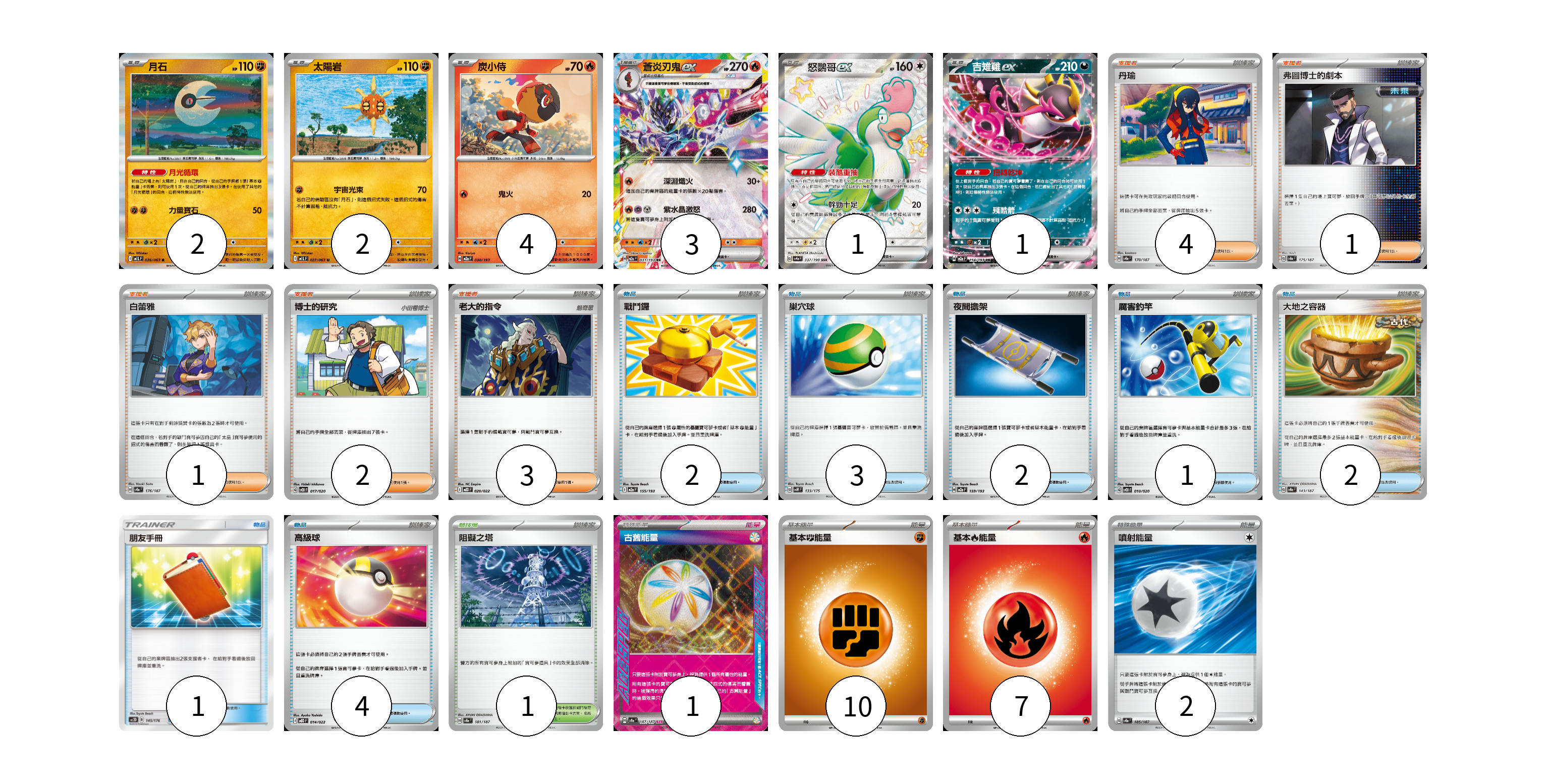 牌組構築方案 以此牌組為基礎新構築牌組 顯示卡面 顯示列表 寶可夢卡(13) 2 2 4 3 1 1 物品卡(15) 2 3 2 1 2 1 4 支援者卡(11) 4 1 1 2 3 競技場卡(1) 1 能量卡(20) 1 10 7 2 寶可夢卡(13) 卡牌名稱 張數 卡牌名稱 張數 月石 M1L 026/063 02 太陽岩 M1L 027/063 02 炭小侍 M2a 030/193 04 蒼炎刃鬼ex M2a 031/193 03 怒鸚哥ex SV4a 337/190 01 吉雉雞ex M2a 114/193 01 物品卡(15) 卡牌名稱 張數 卡牌名稱 張數 戰鬥鑼 M2a 155/193 02 巢穴球 SVM 133/175 03 夜間擔架 M2a 159/193 02 厲害釣竿 SVOD 010/020 01 大地之容器 SV8a 143/187 02 朋友手冊 AC2D 145/176 01 高級球 MBD 014/022 04 支援者卡(11) 卡牌名稱 張數 卡牌名稱 張數 丹瑜 SV8a 170/187 04 弗圖博士的劇本 SV8a 175/187 01 白蕾雅 SV8a 176/187 01 博士的研究 SVOD 017/020 02 老大的指令 MBD 020/022 03 競技場卡(1) 卡牌名稱 張數 卡牌名稱 張數 阻礙之塔 SV8a 181/187 01 能量卡(20) 卡牌名稱 張數 卡牌名稱 張數 古舊能量 SV8a 187/187 01 基本【鬥】能量 M-P FIG 10 基本【火】能量 M-P FIR 07 噴射能量 SV8a 185/187 02 以此牌組為基礎新構築牌組 牌組編碼 eiQBlz-cjeCqx-BRmxTQ copy 列印牌組單 牌組編碼已複製 分享至SNS