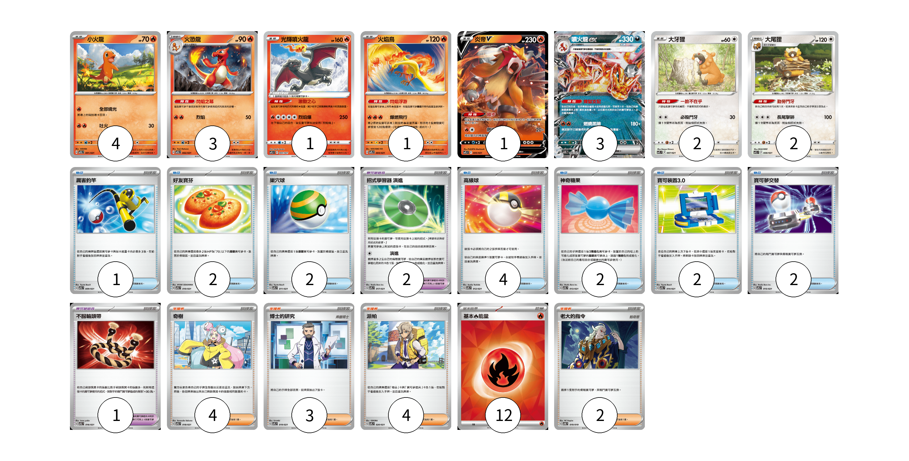 牌組構築方案 以此牌組為基礎新構築牌組 顯示卡面 顯示列表 寶可夢卡(17) 4 3 1 1 1 3 2 2 寶可夢道具(7) 2 1 4 物品卡(15) 1 2 2 4 2 2 2 支援者卡(9) 3 4 2 能量卡(12) 12 寶可夢卡(17) 卡牌名稱 張數 卡牌名稱 張數 小火龍 SVTL 001/021 04 火恐龍 SVTL 002/021 03 光輝噴火龍 SVTL 003/021 01 火焰鳥 SVTL 004/021 01 炎帝V SVTL 005/021 01 噴火龍ex SVTL 006/021 03 大牙狸 SVTL 007/021 02 大尾狸 SVTL 008/021 02 寶可夢道具(7) 卡牌名稱 張數 卡牌名稱 張數 招式學習器 演進 SVTL 017/021 02 不服輸頭帶 SVTL 016/021 01 奇樹 SVTL 018/021 04 物品卡(15) 卡牌名稱 張數 卡牌名稱 張數 厲害釣竿 SVTL 009/021 01 好友寶芬 SVTL 010/021 02 巢穴球 SVTL 011/021 02 高級球 SVTL 012/021 04 神奇糖果 SVTL 013/021 02 寶可裝置3.0 SVTL 014/021 02 寶可夢交替 SVTL 015/021 02 支援者卡(9) 卡牌名稱 張數 卡牌名稱 張數 博士的研究 SVTL 019/021 03 派帕 SVTL 020/021 04 老大的指令 SVTG 019/019 02 能量卡(12) 卡牌名稱 張數 卡牌名稱 張數 基本【火】能量 SVK FIR 12 以此牌組為基礎新構築牌組 牌組編碼 elVgcO-CtSWQD-cprYjj copy 列印牌組單 牌組編碼已複製 分享至SNS