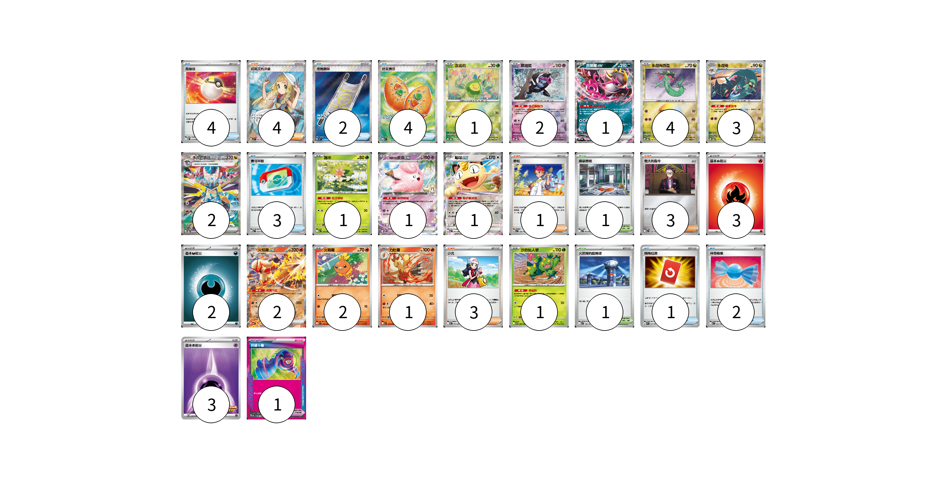 牌組構築方案 以此牌組為基礎新構築牌組 顯示卡面 顯示列表 寶可夢卡(22) 1 2 1 4 3 2 1 1 1 2 2 1 1 寶可夢道具(1) 1 物品卡(16) 4 2 4 3 1 2 支援者卡(11) 4 1 3 3 競技場卡(2) 1 1 能量卡(8) 3 2 3 寶可夢卡(22) 卡牌名稱 張數 卡牌名稱 張數 含羞苞 SV8a 001/187 01 願增猿 SV8a 075/187 02 吉雉雞ex SV8a 104/187 01 多龍梅西亞 SV8a 118/187 04 多龍奇 SV8a 119/187 03 多龍巴魯托ex SV8a 221/187 02 謝米 M2a 012/193 01 莉莉艾的皮皮ex SV9 033/100 01 喵喵ex M3 061/080 01 火焰雞ex SVM 016/175 02 火稚雞 SV10 018/098 02 力壯雞 SV10 019/098 01 沙鈴仙人掌 SV9 006/100 01 寶可夢道具(1) 卡牌名稱 張數 卡牌名稱 張數 英雄斗篷 MC 687/742 01 物品卡(16) 卡牌名稱 張數 卡牌名稱 張數 高級球 MBD 014/022 04 夜間擔架 M1L 083/063 02 好友寶芬 M1S 081/063 04 寶可平板 MC 662/742 03 特殊紅牌 M4 072/083 01 神奇糖果 MC 655/742 02 支援者卡(11) 卡牌名稱 張數 卡牌名稱 張數 莉莉艾的決意 M1L 086/063 04 赤松 MC 696/742 01 老大的指令 MC 724/742 03 小光 M2 077/080 03 競技場卡(2) 卡牌名稱 張數 卡牌名稱 張數 險惡廢墟 M1L 063/063 01 火箭隊的監視塔 M2a 189/193 01 能量卡(8) 卡牌名稱 張數 卡牌名稱 張數 基本【火】能量 MC FIR 03 基本【惡】能量 MC DAR 02 基本【超】能量 SV-P 261/SV-P 03 以此牌組為基礎新構築牌組 牌組編碼 emjnjv-UnqPka-FbyOVR copy 列印牌組單 牌組編碼已複製 分享至SNS