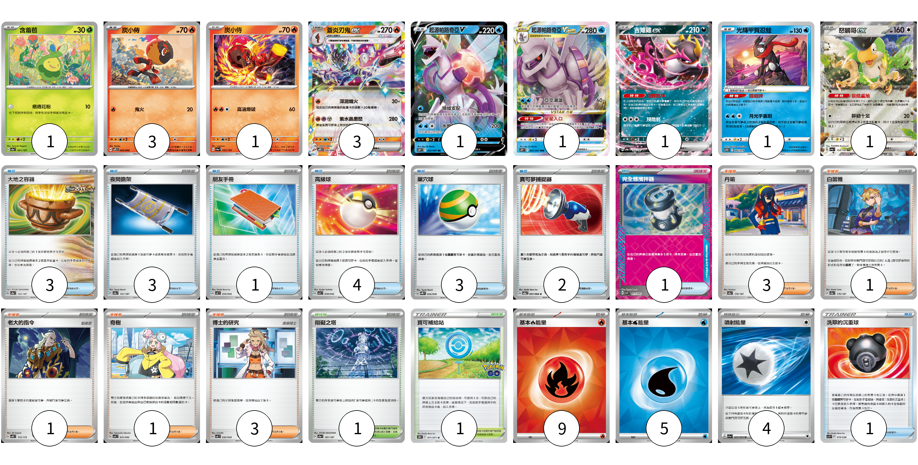 牌組構築方案 以此牌組為基礎新構築牌組 顯示卡面 顯示列表 寶可夢卡(13) 1 3 1 3 1 1 1 1 1 物品卡(18) 3 3 1 4 3 2 1 1 支援者卡(9) 3 1 1 1 3 競技場卡(2) 1 1 能量卡(18) 9 5 4 寶可夢卡(13) 卡牌名稱 張數 卡牌名稱 張數 含羞苞 SV8a 001/187 01 炭小侍 SVPS 005/008 03 炭小侍 SV4a 033/190 01 蒼炎刃鬼ex SVPS 006/008 03 起源帕路奇亞V S10P 022/067 01 起源帕路奇亞VSTAR S10P 023/067 01 吉雉雞ex SV8a 104/187 01 光輝甲賀忍蛙 SVTG 002/019 01 怒鸚哥ex SV4a 154/190 01 物品卡(18) 卡牌名稱 張數 卡牌名稱 張數 大地之容器 SV8a 143/187 03 夜間擔架 SV8a 151/187 03 朋友手冊 SVK 014/042 01 高級球 SVK 018/042 04 巢穴球 SVTG 012/019 03 寶可夢捕捉器 SV5a 057/066 02 完全體攪拌器 SVK 017/042 01 洗翠的沉重球 SVF 019/038 01 支援者卡(9) 卡牌名稱 張數 卡牌名稱 張數 丹瑜 SV8a 170/187 03 白蕾雅 SV8a 176/187 01 老大的指令 SVM 172/175 01 奇樹 SVK 031/042 01 博士的研究 SVK 032/042 03 競技場卡(2) 卡牌名稱 張數 卡牌名稱 張數 阻礙之塔 SV8a 181/187 01 寶可補給站 S10b 071/071 01 能量卡(18) 卡牌名稱 張數 卡牌名稱 張數 基本【火】能量 SVK FIR 09 基本【水】能量 SVK WAT 05 噴射能量 SV1a 072/073 04 以此牌組為基礎新構築牌組 牌組編碼 enGDke-badfTN-uKHZEx copy 列印牌組單 牌組編碼已複製 分享至SNS
