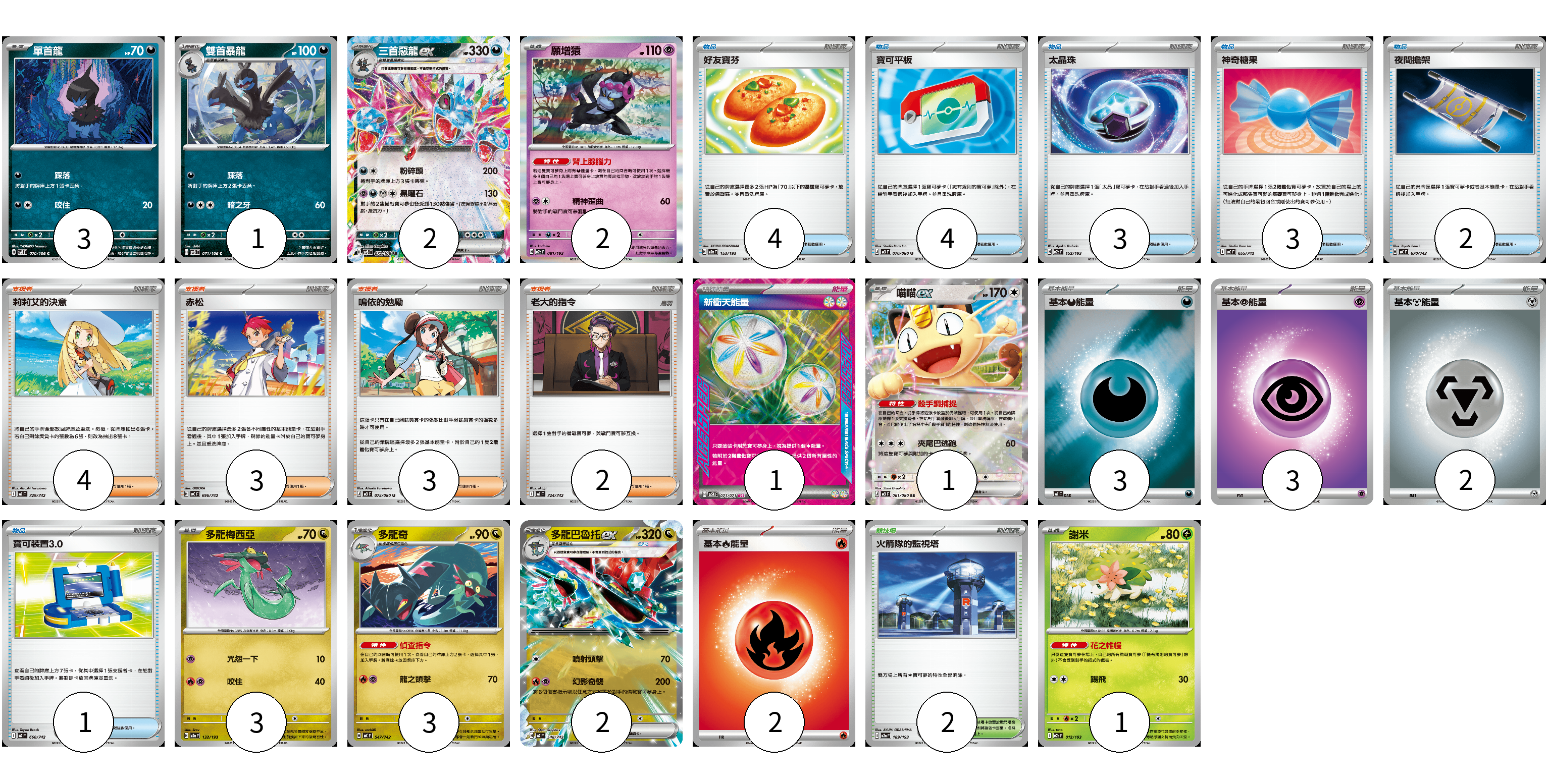牌組構築方案 以此牌組為基礎新構築牌組 顯示卡面 顯示列表 寶可夢卡(18) 3 1 2 2 1 3 3 2 1 物品卡(17) 4 4 3 3 2 1 支援者卡(12) 4 3 3 2 競技場卡(2) 2 能量卡(11) 1 3 3 2 2 寶可夢卡(18) 卡牌名稱 張數 卡牌名稱 張數 單首龍 SV8 070/106 03 雙首暴龍 SV8 071/106 01 三首惡龍ex SV8 072/106 02 願增猿 M2a 081/193 02 喵喵ex M3 061/080 01 多龍梅西亞 M2a 132/193 03 多龍奇 MC 547/742 03 多龍巴魯托ex MC 548/742 02 謝米 M2a 012/193 01 物品卡(17) 卡牌名稱 張數 卡牌名稱 張數 好友寶芬 M2a 153/193 04 寶可平板 M3 070/080 04 太晶珠 M2a 152/193 03 神奇糖果 MC 655/742 03 夜間擔架 MC 670/742 02 寶可裝置3.0 MC 660/742 01 支援者卡(12) 卡牌名稱 張數 卡牌名稱 張數 莉莉艾的決意 MC 729/742 04 赤松 MC 696/742 03 鳴依的勉勵 M3 075/080 03 老大的指令 MC 724/742 02 競技場卡(2) 卡牌名稱 張數 卡牌名稱 張數 火箭隊的監視塔 M2a 189/193 02 能量卡(11) 卡牌名稱 張數 卡牌名稱 張數 新衝天能量 SV5K 071/071 01 基本【惡】能量 MC DAR 03 基本【超】能量 M-P PSY 03 基本【鋼】能量 M-P MET 02 基本【火】能量 MC FIR 02 以此牌組為基礎新構築牌組 牌組編碼 eqEdzk-ZRFSaF-MAmzyn copy 列印牌組單 牌組編碼已複製 分享至SNS