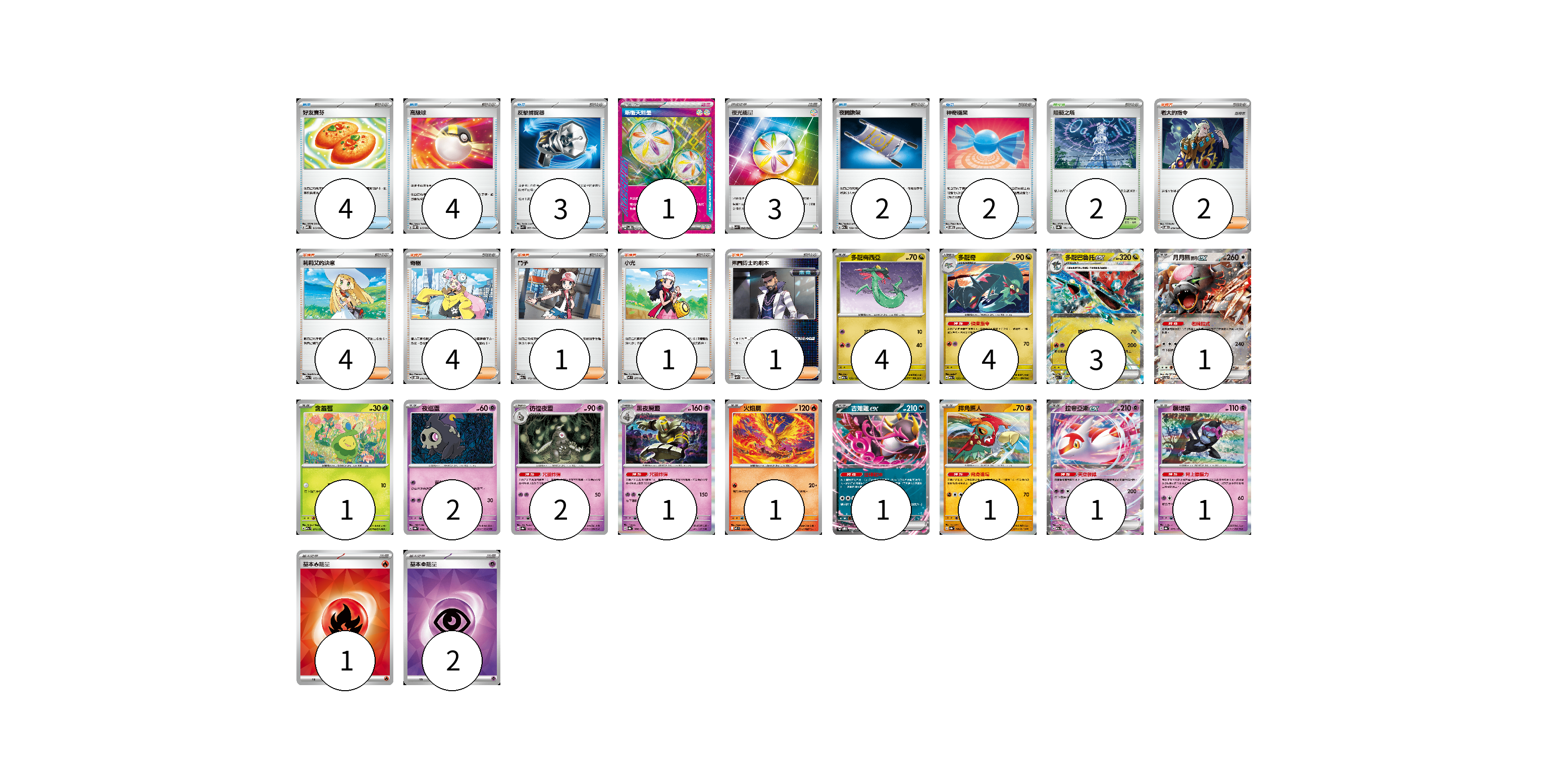 牌組構築方案 以此牌組為基礎新構築牌組 顯示卡面 顯示列表 寶可夢卡(23) 4 4 3 1 1 2 2 1 1 1 1 1 1 物品卡(15) 4 4 3 2 2 支援者卡(13) 2 4 4 1 1 1 競技場卡(2) 2 能量卡(7) 1 3 1 2 寶可夢卡(23) 卡牌名稱 張數 卡牌名稱 張數 多龍梅西亞 M2a 132/193 04 多龍奇 M2a 133/193 04 多龍巴魯托ex M2a 134/193 03 月月熊 赫月 ex SV5a 052/066 01 含羞苞 M2a 011/193 01 夜巡靈 SV8a 064/187 02 彷徨夜靈 SV8a 065/187 02 黑夜魔靈 SV8a 066/187 01 火焰鳥 M2 014/080 01 吉雉雞ex SVOD 004/020 01 摔角鷹人 SV8a 084/187 01 拉帝亞斯ex M2a 075/193 01 願增猿 SV8a 075/187 01 物品卡(15) 卡牌名稱 張數 卡牌名稱 張數 好友寶芬 MBD 013/022 04 高級球 SVQP 015/023 04 反擊捕捉器 SVK 009/042 03 夜間擔架 M2a 159/193 02 神奇糖果 SVOM 014/021 02 支援者卡(13) 卡牌名稱 張數 卡牌名稱 張數 老大的指令 SVOD 019/020 02 莉莉艾的決意 M2a 175/193 04 奇樹 SVOD 016/020 04 鬥子 M2a 172/193 01 小光 M2 077/080 01 弗圖博士的劇本 SVHM 021/022 01 競技場卡(2) 卡牌名稱 張數 卡牌名稱 張數 阻礙之塔 SV8a 181/187 02 能量卡(7) 卡牌名稱 張數 卡牌名稱 張數 新衝天能量 SV5K 071/071 01 夜光能量 SVK 042/042 03 基本【火】能量 SVQL FIR 01 基本【超】能量 SVOD PSY 02 以此牌組為基礎新構築牌組 牌組編碼 evgrmR-wgHBot-RjxGdH copy 列印牌組單 牌組編碼已複製 分享至SNS