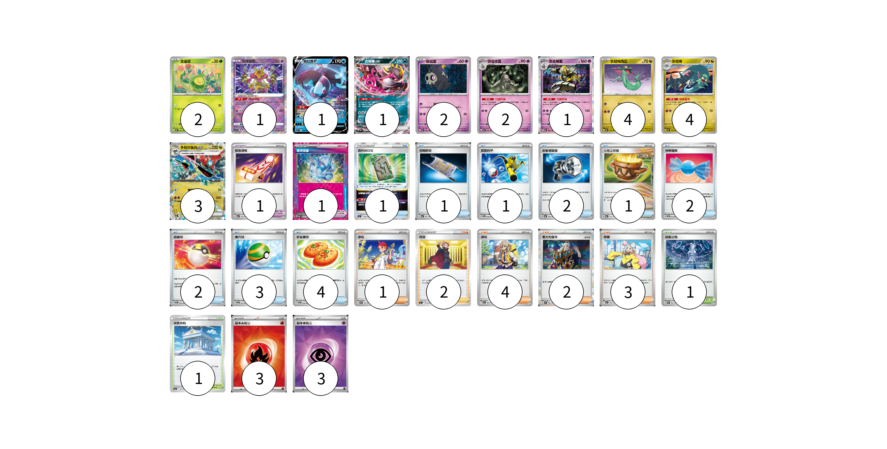 牌組構築方案 以此牌組為基礎新構築牌組 顯示卡面 顯示列表 寶可夢卡(21) 2 1 1 1 2 2 1 4 4 3 寶可夢道具(3) 1 1 1 物品卡(16) 1 1 2 1 2 2 3 4 支援者卡(12) 1 2 4 2 3 競技場卡(2) 1 1 能量卡(6) 3 3 寶可夢卡(21) 卡牌名稱 張數 卡牌名稱 張數 含羞苞 SV8a 001/187 02 光輝胡地 S11a 031/068 01 霓虹魚V S9 030/100 01 吉雉雞ex SV8a 104/187 01 夜巡靈 SV8a 064/187 02 彷徨夜靈 SV8a 065/187 02 黑夜魔靈 SV8a 066/187 01 多龍梅西亞 SV8a 118/187 04 多龍奇 SV8a 119/187 04 多龍巴魯托ex SV8a 120/187 03 寶可夢道具(3) 卡牌名稱 張數 卡牌名稱 張數 緊急滑板 SV8a 153/187 01 璀璨結晶 SV8a 152/187 01 森林封印石 S12 092/098 01 物品卡(16) 卡牌名稱 張數 卡牌名稱 張數 夜間擔架 SV8a 151/187 01 厲害釣竿 SVTL 009/021 01 反擊捕捉器 SV8a 139/187 02 大地之容器 SV8a 143/187 01 神奇糖果 SVTL 013/021 02 高級球 SVTL 012/021 02 巢穴球 SVTL 011/021 03 好友寶芬 SVTL 010/021 04 支援者卡(12) 卡牌名稱 張數 卡牌名稱 張數 赤松 SV8a 163/187 01 阿渡 S12 096/098 02 派帕 SV4a 180/190 04 老大的指令 SV4a 181/190 02 奇樹 SV4a 174/190 03 競技場卡(2) 卡牌名稱 張數 卡牌名稱 張數 阻礙之塔 SV8a 181/187 01 神奧神殿 S12a 169/172 01 能量卡(6) 卡牌名稱 張數 卡牌名稱 張數 基本【火】能量 SVK FIR 03 基本【超】能量 SVK PSY 03 以此牌組為基礎新構築牌組 牌組編碼 eyUCTi-upsydI-YjFVhH copy 列印牌組單 牌組編碼已複製 分享至SNS