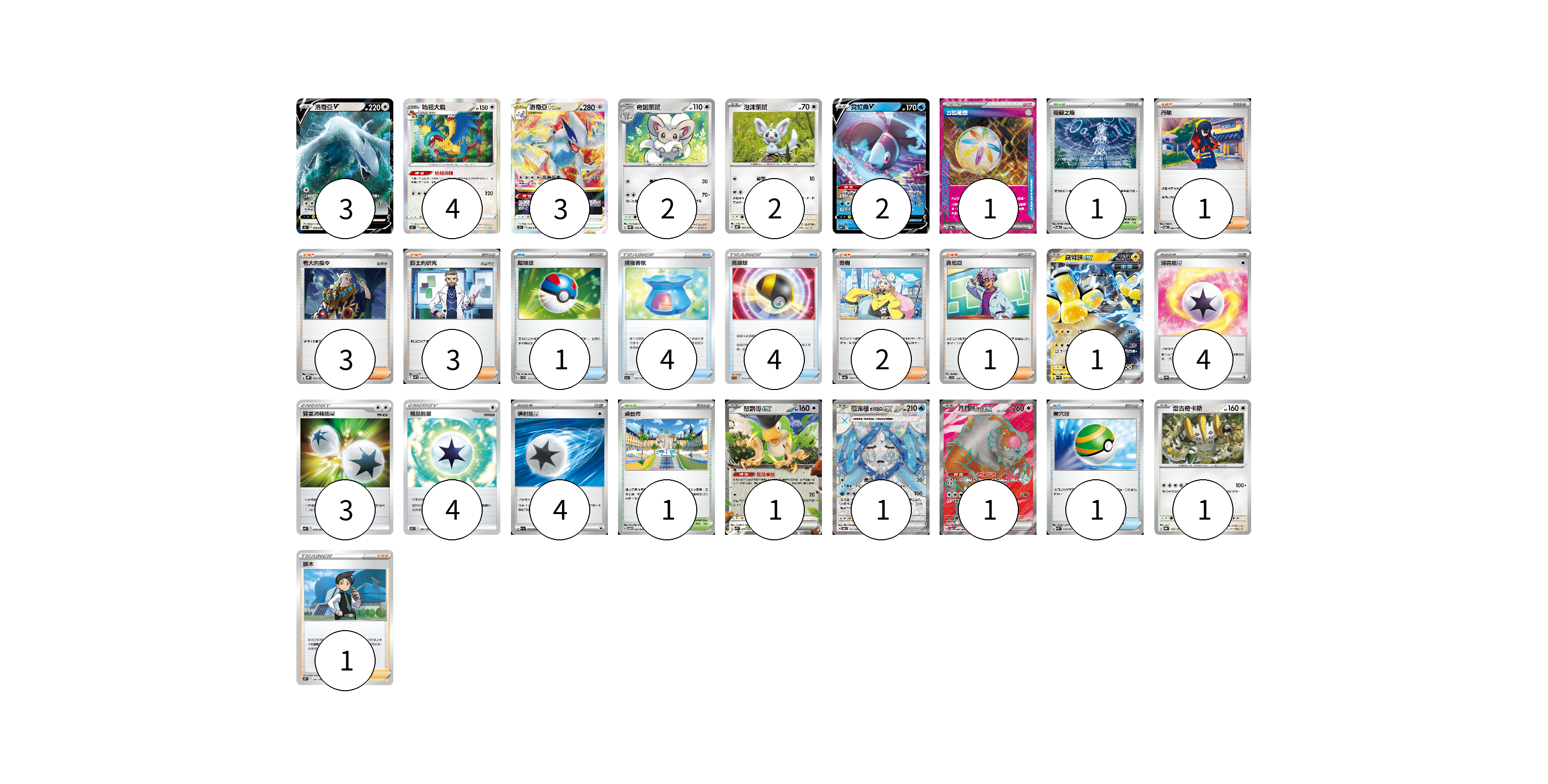 牌組構築方案 以此牌組為基礎新構築牌組 顯示卡面 顯示列表 寶可夢卡(21) 3 4 3 2 2 2 1 1 1 1 1 物品卡(10) 1 4 4 1 支援者卡(11) 1 3 3 2 1 1 競技場卡(2) 1 1 能量卡(16) 1 4 3 4 4 寶可夢卡(21) 卡牌名稱 張數 卡牌名稱 張數 洛奇亞V S12 079/098 03 始祖大鳥 S12 083/098 04 洛奇亞VSTAR S12 080/098 03 奇諾栗鼠 SV5K 060/071 02 泡沫栗鼠 SV5K 059/071 02 霓虹魚V SVF 002/038 02 鐵臂膀ex SV4M 027/066 01 怒鸚哥ex SVK 006/042 01 厄鬼椪 水井面具ex SV6 117/101 01 月月熊 赫月 ex SV5a 084/066 01 雷吉奇卡斯 SV8a 132/187 01 物品卡(10) 卡牌名稱 張數 卡牌名稱 張數 超級球 SVD 117/139 01 捕獲香氛 S11a 060/068 04 高級球 SLL 013/021 04 巢穴球 SVK 016/042 01 支援者卡(11) 卡牌名稱 張數 卡牌名稱 張數 丹瑜 SV6 097/101 01 老大的指令 SVHK 022/022 03 博士的研究 SVHM 020/022 03 奇樹 SV4a 174/190 02 吉尼亞 SVD 129/139 01 捩木 S11 097/100 01 競技場卡(2) 卡牌名稱 張數 卡牌名稱 張數 阻礙之塔 SV6 100/101 01 桌台市 SVTM 021/022 01 能量卡(16) 卡牌名稱 張數 卡牌名稱 張數 古舊能量 SV6 101/101 01 薄霧能量 SV5M 071/071 04 雙重渦輪能量 SVF 038/038 03 禮品能量 S11 100/100 04 噴射能量 SV1a 072/073 04 以此牌組為基礎新構築牌組 牌組編碼 eypzcJ-hBomxy-UKSVIU copy 列印牌組單 牌組編碼已複製 分享至SNS