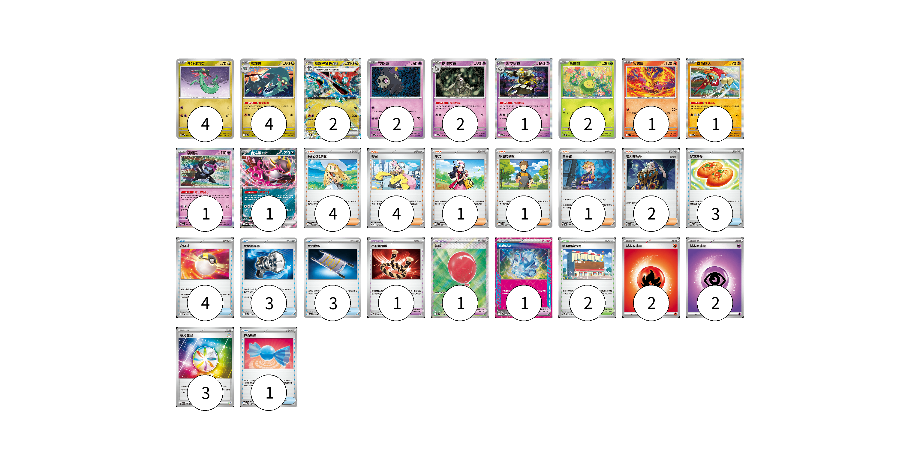 牌組構築方案 以此牌組為基礎新構築牌組 顯示卡面 顯示列表 寶可夢卡(21) 4 4 2 2 2 1 2 1 1 1 1 寶可夢道具(3) 1 1 1 物品卡(14) 3 4 3 3 1 支援者卡(13) 4 4 1 1 1 2 競技場卡(2) 2 能量卡(7) 2 2 3 寶可夢卡(21) 卡牌名稱 張數 卡牌名稱 張數 多龍梅西亞 SV8a 118/187 04 多龍奇 SV8a 119/187 04 多龍巴魯托ex SV8a 120/187 02 夜巡靈 SV6a 018/064 02 彷徨夜靈 SV6a 019/064 02 黑夜魔靈 SV6a 020/064 01 含羞苞 SV8a 001/187 02 火焰鳥 M2 014/080 01 摔角鷹人 SV8a 084/187 01 願增猿 SV8a 075/187 01 吉雉雞ex SV8a 104/187 01 寶可夢道具(3) 卡牌名稱 張數 卡牌名稱 張數 不服輸頭帶 SVTL 016/021 01 氣球 M1L 084/063 01 璀璨結晶 SV8a 152/187 01 物品卡(14) 卡牌名稱 張數 卡牌名稱 張數 好友寶芬 MBD 013/022 03 高級球 MBD 014/022 04 反擊捕捉器 SV8a 139/187 03 夜間擔架 SV6a 056/064 03 神奇糖果 MBG 013/022 01 支援者卡(13) 卡牌名稱 張數 卡牌名稱 張數 莉莉艾的決意 M1L 062/063 04 奇樹 SVOM 018/021 04 小光 M2 077/080 01 小剛的發掘 SV9 096/100 01 白蕾雅 SV8a 176/187 01 老大的指令 SVM 172/175 02 競技場卡(2) 卡牌名稱 張數 卡牌名稱 張數 城鎮百貨公司 SVK 037/042 02 能量卡(7) 卡牌名稱 張數 卡牌名稱 張數 基本【火】能量 M-P FIR 02 基本【超】能量 MBD PSY 02 夜光能量 SVK 042/042 03 以此牌組為基礎新構築牌組 牌組編碼 eyynZo-OvjdNh-upxPFx copy 列印牌組單 牌組編碼已複製 分享至SNS