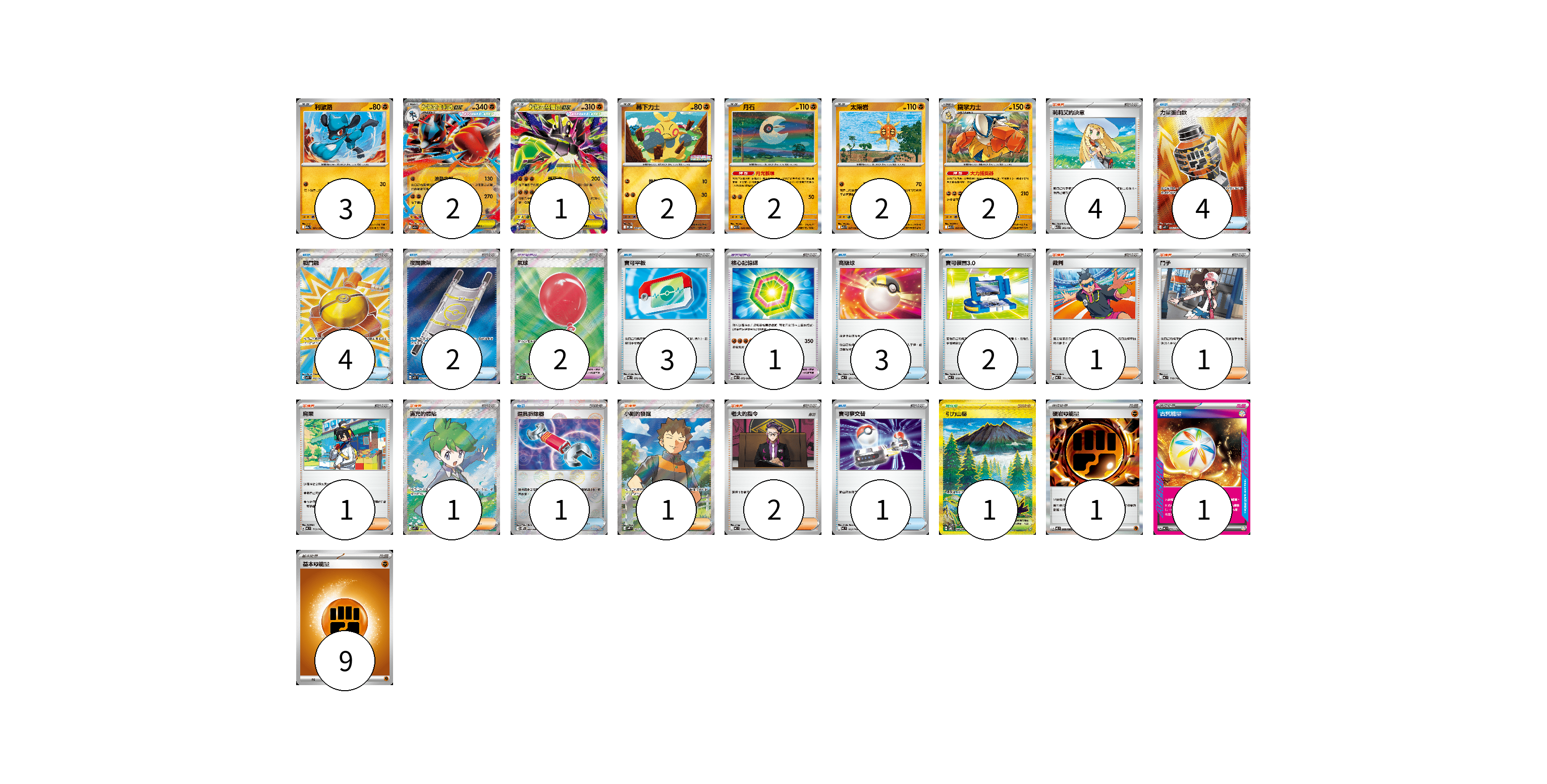 牌組構築方案 以此牌組為基礎新構築牌組 顯示卡面 顯示列表 寶可夢卡(14) 3 2 1 2 2 2 2 寶可夢道具(3) 2 1 物品卡(20) 4 4 2 3 3 2 1 1 支援者卡(11) 4 1 1 1 1 1 2 競技場卡(1) 1 能量卡(11) 1 1 9 寶可夢卡(14) 卡牌名稱 張數 卡牌名稱 張數 利歐路 M2a 091/193 03 超級路卡利歐ex M2a 092/193 02 超級基格爾德ex M3 046/080 01 幕下力士 M-P 007/M-P 02 月石 M1L 026/063 02 太陽岩 M1L 027/063 02 鐵掌力士 M1L 025/063 02 寶可夢道具(3) 卡牌名稱 張數 卡牌名稱 張數 氣球 M1L 084/063 02 核心記憶碟 M3 072/080 01 物品卡(20) 卡牌名稱 張數 卡牌名稱 張數 力量蛋白飲 M1L 081/063 04 戰鬥鑼 M1L 082/063 04 夜間擔架 M1L 083/063 02 寶可平板 M3 070/080 03 高級球 MC 651/742 03 寶可裝置3.0 MC 660/742 02 道具拆除器 SV11W 080/086 01 寶可夢交替 MC 663/742 01 支援者卡(11) 卡牌名稱 張數 卡牌名稱 張數 莉莉艾的決意 M1L 062/063 04 裁判 MC 711/742 01 鬥子 MC 718/742 01 烏栗 MC 713/742 01 滿充的體貼 M1S 085/063 01 小剛的發掘 SV9 123/100 01 老大的指令 MC 724/742 02 競技場卡(1) 卡牌名稱 張數 卡牌名稱 張數 引力山岳 SV8 138/106 01 能量卡(11) 卡牌名稱 張數 卡牌名稱 張數 硬岩【鬥】能量 M3 080/080 01 古舊能量 MC 741/742 01 基本【鬥】能量 MC FIG 09 以此牌組為基礎新構築牌組 牌組編碼 ezcPsM-HRIuDv-QgcmWm copy 列印牌組單 牌組編碼已複製 分享至SNS