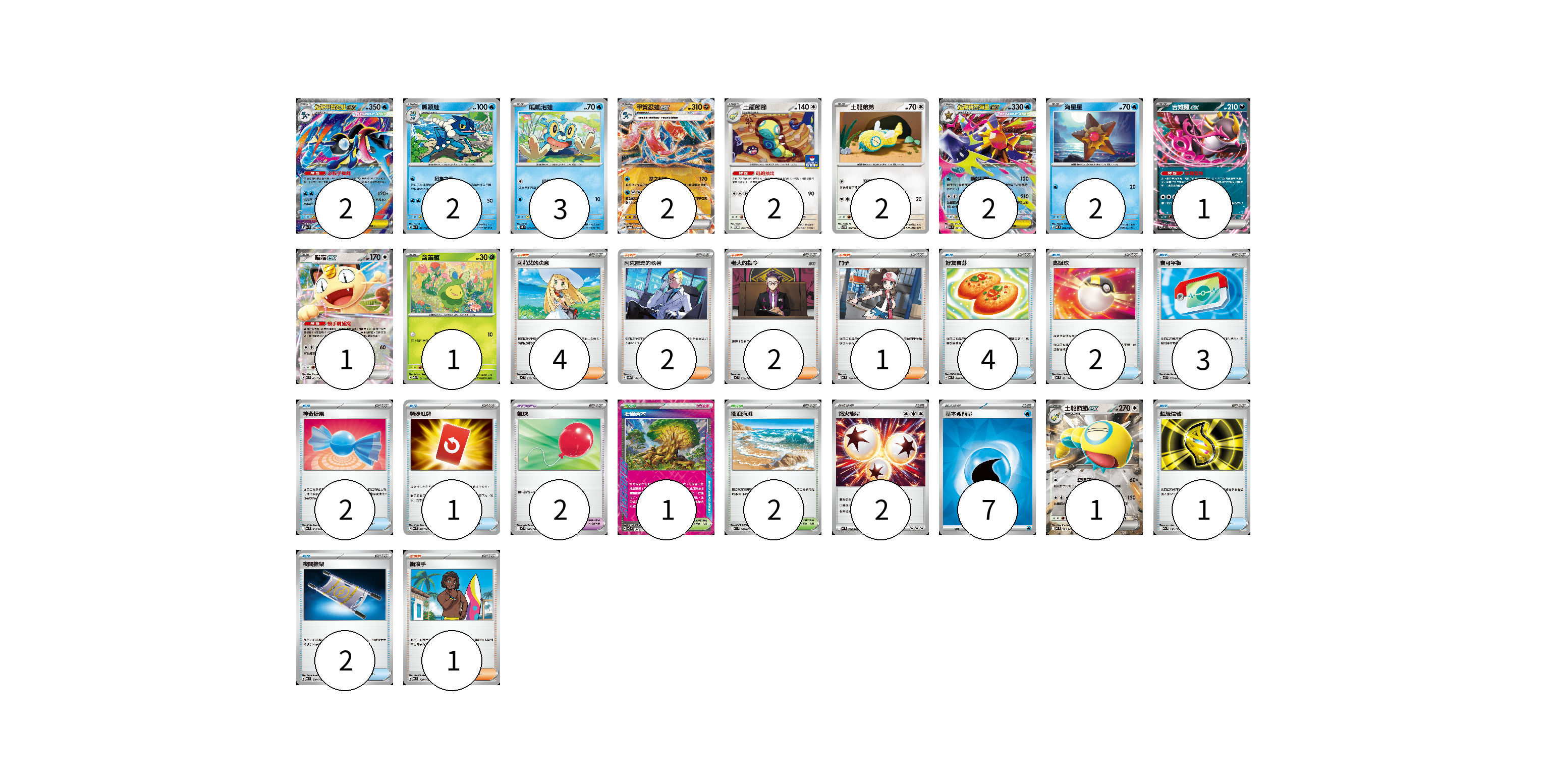 牌組構築方案 以此牌組為基礎新構築牌組 顯示卡面 顯示列表 寶可夢卡(21) 2 2 3 2 2 2 2 2 1 1 1 1 寶可夢道具(2) 2 物品卡(15) 4 2 3 2 1 1 2 支援者卡(10) 4 2 2 1 1 競技場卡(3) 1 2 能量卡(9) 2 7 寶可夢卡(21) 卡牌名稱 張數 卡牌名稱 張數 超級甲賀忍蛙ex M4 022/083 02 呱頭蛙 M4 021/083 02 呱呱泡蛙 M4 020/083 03 甲賀忍蛙ex SV5a 045/066 02 土龍節節 M-P 045/M-P 02 土龍弟弟 SV9 078/100 02 超級寶石海星ex M3 021/080 02 海星星 M3 020/080 02 吉雉雞ex MC 489/742 01 喵喵ex M3 061/080 01 含羞苞 M2a 011/193 01 土龍節節ex MC 575/742 01 寶可夢道具(2) 卡牌名稱 張數 卡牌名稱 張數 氣球 MC 688/742 02 物品卡(15) 卡牌名稱 張數 卡牌名稱 張數 好友寶芬 MC 648/742 04 高級球 MC 651/742 02 寶可平板 M3 070/080 03 神奇糖果 MC 655/742 02 特殊紅牌 M4 072/083 01 超級信號 M2a 158/193 01 夜間擔架 MC 670/742 02 支援者卡(10) 卡牌名稱 張數 卡牌名稱 張數 莉莉艾的決意 MC 729/742 04 阿克羅瑪的執著 SV8a 164/187 02 老大的指令 MC 724/742 02 鬥子 MC 718/742 01 衝浪手 MC 708/742 01 競技場卡(3) 卡牌名稱 張數 卡牌名稱 張數 壯偉碩木 SV7 101/102 01 衝浪海灘 M1S 062/063 02 能量卡(9) 卡牌名稱 張數 卡牌名稱 張數 燃火能量 MC 736/742 02 基本【水】能量 SVM WAT 07 以此牌組為基礎新構築牌組 牌組編碼 fAPZWR-AOuOMf-XxBeOU copy 列印牌組單 牌組編碼已複製 分享至SNS