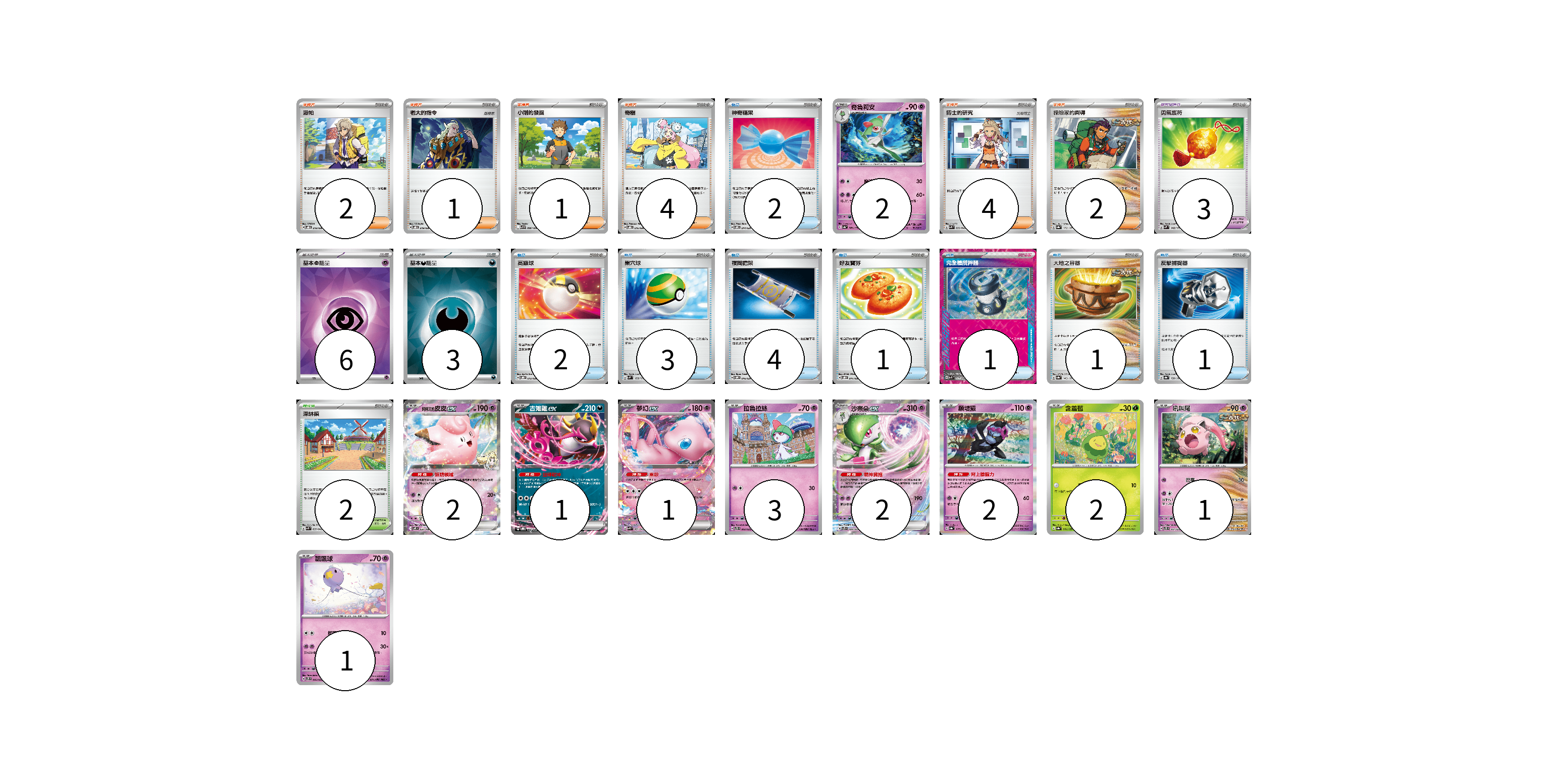 牌組構築方案 以此牌組為基礎新構築牌組 顯示卡面 顯示列表 寶可夢卡(17) 2 2 1 1 3 2 2 2 1 1 寶可夢道具(3) 3 物品卡(15) 2 2 3 4 1 1 1 1 支援者卡(14) 2 1 1 4 4 2 競技場卡(2) 2 能量卡(9) 6 3 寶可夢卡(17) 卡牌名稱 張數 卡牌名稱 張數 奇魯莉安 SV4a 081/190 02 莉莉艾的皮皮ex SV9 033/100 02 吉雉雞ex SVOD 004/020 01 夢幻ex SVK 001/042 01 拉魯拉絲 SVTS 002/022 03 沙奈朵ex SVTS 004/022 02 願增猿 SV8a 075/187 02 含羞苞 SV8a 001/187 02 吼叫尾 SVTS 007/022 01 飄飄球 SVTS 005/022 01 寶可夢道具(3) 卡牌名稱 張數 卡牌名稱 張數 勇氣護符 SVM 142/175 03 物品卡(15) 卡牌名稱 張數 卡牌名稱 張數 神奇糖果 SVOM 014/021 02 高級球 SVOD 012/020 02 巢穴球 SVM 133/175 03 夜間擔架 SVOM 016/021 04 好友寶芬 SVOD 011/020 01 完全體攪拌器 SVK 017/042 01 大地之容器 SV8a 143/187 01 反擊捕捉器 SV8a 139/187 01 支援者卡(14) 卡牌名稱 張數 卡牌名稱 張數 派帕 SVOD 018/020 02 老大的指令 SVOD 019/020 01 小剛的發掘 SV9 096/100 01 奇樹 SVOD 016/020 04 博士的研究 SVK 032/042 04 探險家的嚮導 SV8a 172/187 02 競技場卡(2) 卡牌名稱 張數 卡牌名稱 張數 深缽鎮 SVK 039/042 02 能量卡(9) 卡牌名稱 張數 卡牌名稱 張數 基本【超】能量 SVOD PSY 06 基本【惡】能量 SVOM DAR 03 以此牌組為基礎新構築牌組 牌組編碼 fBfkGa-nXGAWm-wKGgHq copy 列印牌組單 牌組編碼已複製 分享至SNS