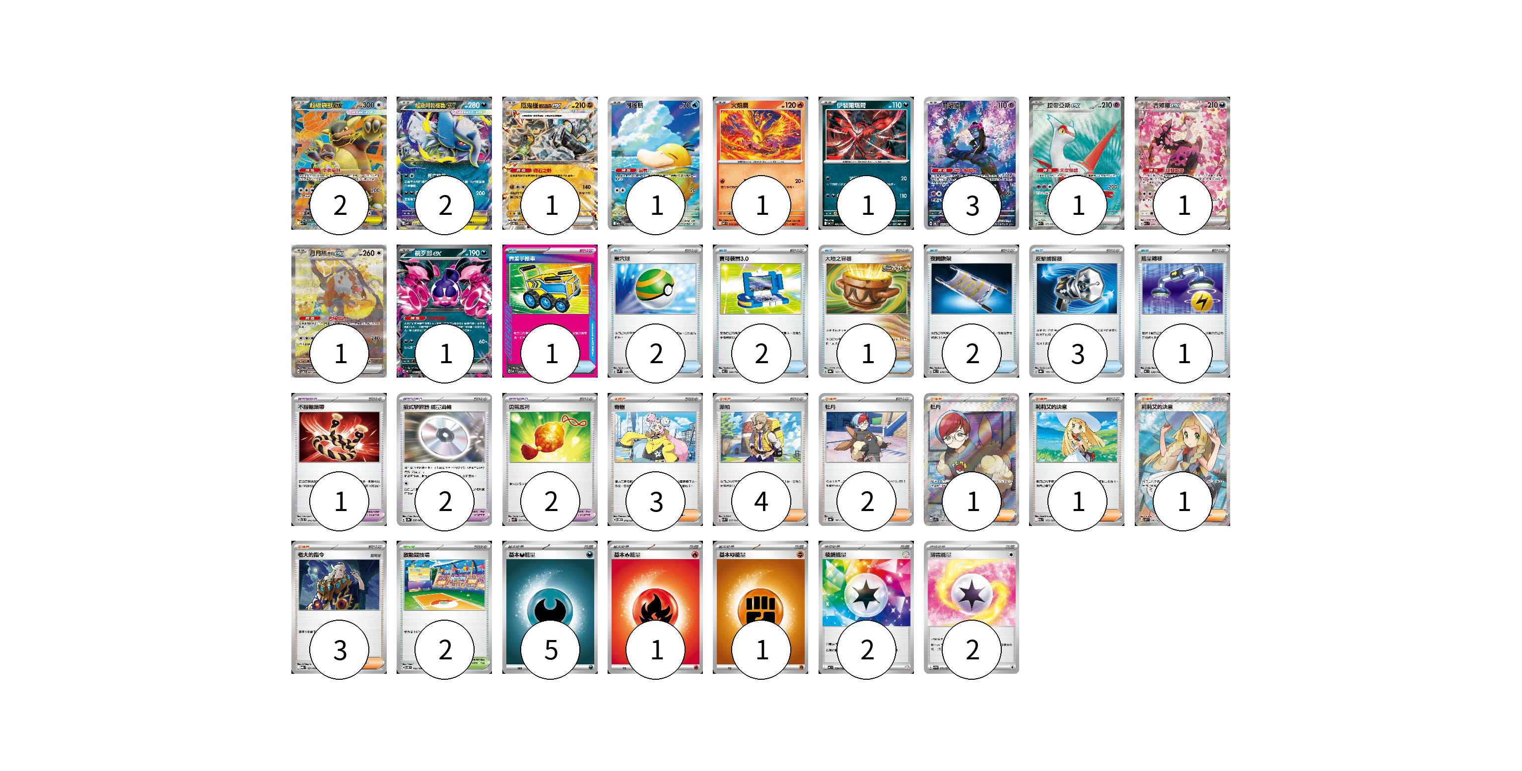 牌組構築方案 以此牌組為基礎新構築牌組 顯示卡面 顯示列表 寶可夢卡(15) 2 2 1 1 1 1 3 1 1 1 1 寶可夢道具(5) 1 2 2 物品卡(12) 1 2 2 1 2 3 1 支援者卡(15) 3 4 2 1 1 1 3 競技場卡(2) 2 能量卡(11) 5 1 1 2 2 寶可夢卡(15) 卡牌名稱 張數 卡牌名稱 張數 超級袋獸ex M1S 080/063 02 超級阿勃梭魯ex M1L 038/063 02 厄鬼椪 礎石面具ex SV6 065/101 01 可達鴨 M2a 199/193 01 火焰鳥 M2 014/080 01 伊裴爾塔爾 MC 481/742 01 願增猿 SV6 107/101 03 拉帝亞斯ex SV7a 078/064 01 吉雉雞ex M2a 244/193 01 月月熊 赫月 ex SV5a 091/066 01 桃歹郎ex MC 491/742 01 寶可夢道具(5) 卡牌名稱 張數 卡牌名稱 張數 不服輸頭帶 SVTL 016/021 01 招式學習器 能量渦輪 SV3a 056/062 02 勇氣護符 SVK 024/042 02 物品卡(12) 卡牌名稱 張數 卡牌名稱 張數 貴重手推車 MC 658/742 01 巢穴球 SVM 133/175 02 寶可裝置3.0 MC 660/742 02 大地之容器 SV8a 143/187 01 夜間擔架 MC 670/742 02 反擊捕捉器 SV8a 139/187 03 能量轉移 MC 638/742 01 支援者卡(15) 卡牌名稱 張數 卡牌名稱 張數 奇樹 SVOM 018/021 03 派帕 SVK 035/042 04 牡丹 SV4a 182/190 02 牡丹 SV1S 100/078 01 莉莉艾的決意 M2a 175/193 01 莉莉艾的決意 M1L 086/063 01 老大的指令 MBG 021/022 03 競技場卡(2) 卡牌名稱 張數 卡牌名稱 張數 激動競技場 SV8 105/106 02 能量卡(11) 卡牌名稱 張數 卡牌名稱 張數 基本【惡】能量 MC DAR 05 基本【火】能量 MC FIR 01 基本【鬥】能量 MC FIG 01 稜鏡能量 MC 739/742 02 薄霧能量 SV5M 071/071 02 以此牌組為基礎新構築牌組 牌組編碼 fDajQl-SzdaHB-YcouzU copy 列印牌組單 牌組編碼已複製 分享至SNS