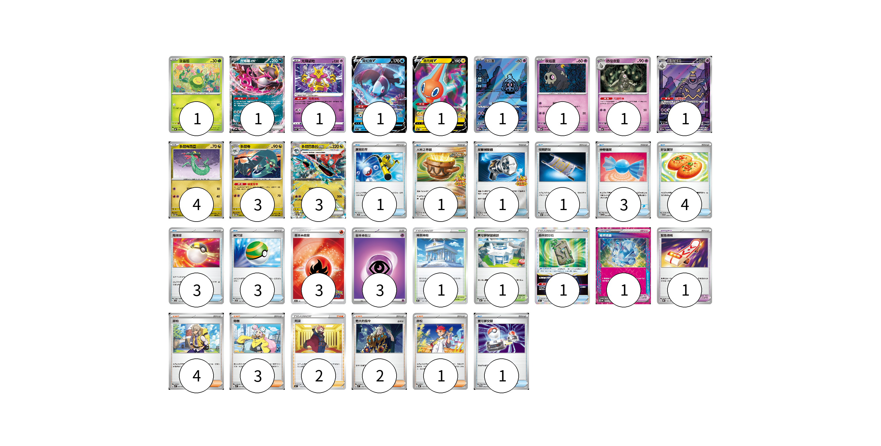 牌組構築方案 以此牌組為基礎新構築牌組 顯示卡面 顯示列表 寶可夢卡(19) 1 1 1 1 1 1 1 1 1 4 3 3 寶可夢道具(3) 1 1 1 物品卡(18) 1 1 1 1 3 4 3 3 1 支援者卡(12) 4 3 2 2 1 競技場卡(2) 1 1 能量卡(6) 3 3 寶可夢卡(19) 卡牌名稱 張數 卡牌名稱 張數 含羞苞 SV8a 001/187 01 吉雉雞ex SV8a 104/187 01 光輝胡地 SVTM 006/022 01 霓虹魚V S9 030/100 01 洛托姆V S11 037/100 01 夜巡靈 SV6a 068/064 01 夜巡靈 SV6a 018/064 01 彷徨夜靈 SV6a 019/064 01 黑夜魔靈 SV6a 070/064 01 多龍梅西亞 SV6 079/101 04 多龍奇 SV6 080/101 03 多龍巴魯托ex SV6 081/101 03 寶可夢道具(3) 卡牌名稱 張數 卡牌名稱 張數 森林封印石 S12 092/098 01 璀璨結晶 SV8a 152/187 01 緊急滑板 SV8a 153/187 01 物品卡(18) 卡牌名稱 張數 卡牌名稱 張數 厲害釣竿 SVF 013/038 01 大地之容器 SV-P 084/SV-P 01 反擊捕捉器 SV-P 083/SV-P 01 夜間擔架 SV6a 056/064 01 神奇糖果 SVI 053/066 03 好友寶芬 SVTH 009/018 04 高級球 SVD 119/139 03 巢穴球 SVF 016/038 03 寶可夢交替 SVTH 012/018 01 支援者卡(12) 卡牌名稱 張數 卡牌名稱 張數 派帕 SVK 035/042 04 奇樹 SVK 031/042 03 阿渡 S12 096/098 02 老大的指令 SVM 172/175 02 赤松 SV8a 163/187 01 競技場卡(2) 卡牌名稱 張數 卡牌名稱 張數 神奧神殿 S10P 067/067 01 寶可夢聯盟總部 SV4a 186/190 01 能量卡(6) 卡牌名稱 張數 卡牌名稱 張數 基本火能量 S10b FIR 03 基本超能量 sv-p PSY 03 以此牌組為基礎新構築牌組 牌組編碼 fEJeXo-THqyLC-njhLhX copy 列印牌組單 牌組編碼已複製 分享至SNS