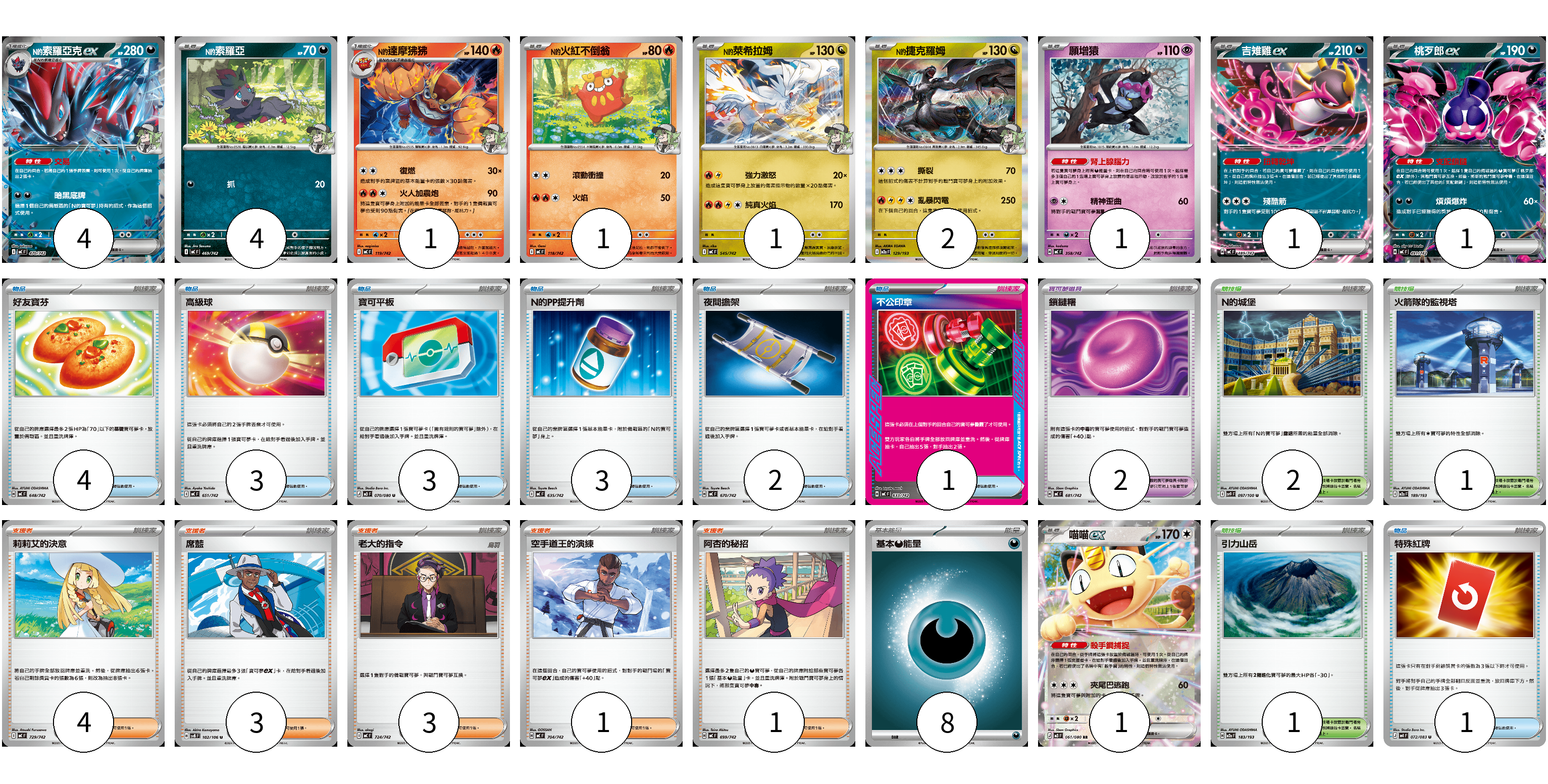 牌組構築方案 以此牌組為基礎新構築牌組 顯示卡面 顯示列表 寶可夢卡(17) 4 4 1 1 1 2 1 1 1 1 寶可夢道具(2) 2 物品卡(17) 4 3 3 3 2 1 1 支援者卡(12) 4 3 3 1 1 競技場卡(4) 2 1 1 能量卡(8) 8 寶可夢卡(17) 卡牌名稱 張數 卡牌名稱 張數 N的索羅亞克ex MC 470/742 04 N的索羅亞 MC 469/742 04 N的達摩狒狒 MC 119/742 01 N的火紅不倒翁 MC 118/742 01 N的萊希拉姆 MC 545/742 01 N的捷克羅姆 M2a 129/193 02 願增猿 MC 358/742 01 吉雉雞ex MC 489/742 01 桃歹郎ex MC 491/742 01 喵喵ex M3 061/080 01 寶可夢道具(2) 卡牌名稱 張數 卡牌名稱 張數 鎖鏈糬 MC 681/742 02 物品卡(17) 卡牌名稱 張數 卡牌名稱 張數 好友寶芬 MC 648/742 04 高級球 MC 651/742 03 寶可平板 M3 070/080 03 N的PP提升劑 MC 635/742 03 夜間擔架 MC 670/742 02 不公印章 MC 633/742 01 特殊紅牌 M4 072/083 01 支援者卡(12) 卡牌名稱 張數 卡牌名稱 張數 莉莉艾的決意 MC 729/742 04 席藍 SV8 102/106 03 老大的指令 MC 724/742 03 空手道王的演練 MC 704/742 01 阿杏的秘招 MC 699/742 01 競技場卡(4) 卡牌名稱 張數 卡牌名稱 張數 N的城堡 SV9 097/100 02 火箭隊的監視塔 M2a 189/193 01 引力山岳 M2a 183/193 01 能量卡(8) 卡牌名稱 張數 卡牌名稱 張數 基本【惡】能量 MC DAR 08 以此牌組為基礎新構築牌組 牌組編碼 fFRiNb-mPCRLJ-hDFbTU copy 列印牌組單 牌組編碼已複製 分享至SNS