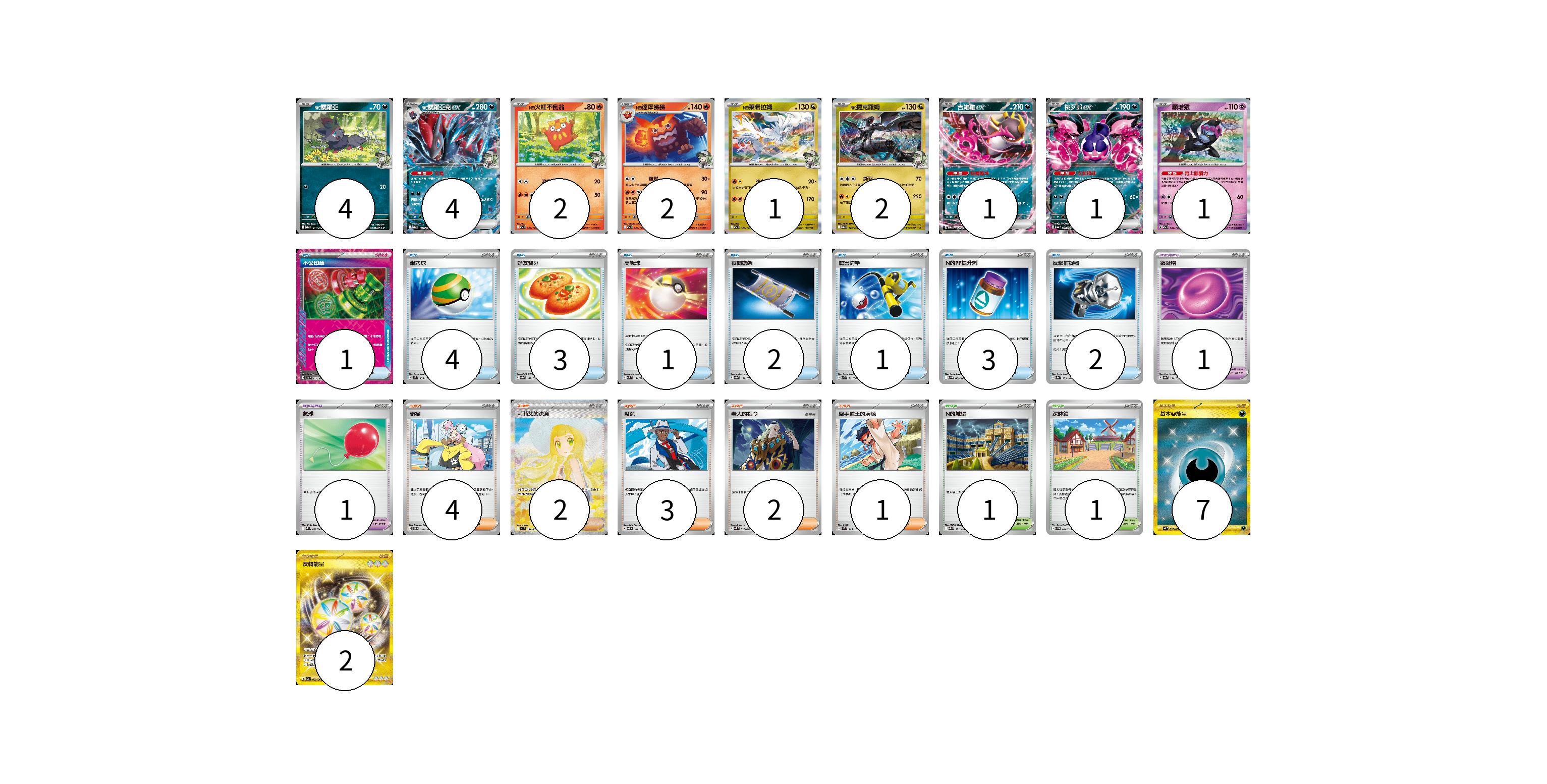 牌組構築方案 以此牌組為基礎新構築牌組 顯示卡面 顯示列表 寶可夢卡(18) 4 4 2 2 1 2 1 1 1 寶可夢道具(2) 1 1 物品卡(17) 1 4 3 1 2 1 3 2 支援者卡(12) 4 2 3 2 1 競技場卡(2) 1 1 能量卡(9) 7 2 寶可夢卡(18) 卡牌名稱 張數 卡牌名稱 張數 N的索羅亞 M2a 111/193 04 N的索羅亞克ex M2a 112/193 04 N的火紅不倒翁 M2a 027/193 02 N的達摩狒狒 M2a 028/193 02 N的萊希拉姆 M2a 128/193 01 N的捷克羅姆 M2a 129/193 02 吉雉雞ex M2a 114/193 01 桃歹郎ex SV6a 039/064 01 願增猿 M2a 081/193 01 寶可夢道具(2) 卡牌名稱 張數 卡牌名稱 張數 鎖鏈糬 SV8a 154/187 01 氣球 SV11B 082/086 01 物品卡(17) 卡牌名稱 張數 卡牌名稱 張數 不公印章 SV5a 053/066 01 巢穴球 SVM 133/175 04 好友寶芬 SV8a 147/187 03 高級球 SVM 134/175 01 夜間擔架 SV8a 151/187 02 厲害釣竿 SVK 011/042 01 N的PP提升劑 SV9 089/100 03 反擊捕捉器 SV8a 139/187 02 支援者卡(12) 卡牌名稱 張數 卡牌名稱 張數 奇樹 SVOM 018/021 04 莉莉艾的決意 M1L 091/063 02 席藍 SV8 102/106 03 老大的指令 SVK 036/042 02 空手道王的演練 SVM 145/175 01 競技場卡(2) 卡牌名稱 張數 卡牌名稱 張數 N的城堡 M2a 181/193 01 深缽鎮 SVF 036/038 01 能量卡(9) 卡牌名稱 張數 卡牌名稱 張數 基礎【惡】能量 SV4K 095/066 07 反轉能量 SV3a 092/062 02 以此牌組為基礎新構築牌組 牌組編碼 fHaCzN-LHPjIQ-kqCtoW copy 列印牌組單 牌組編碼已複製 分享至SNS