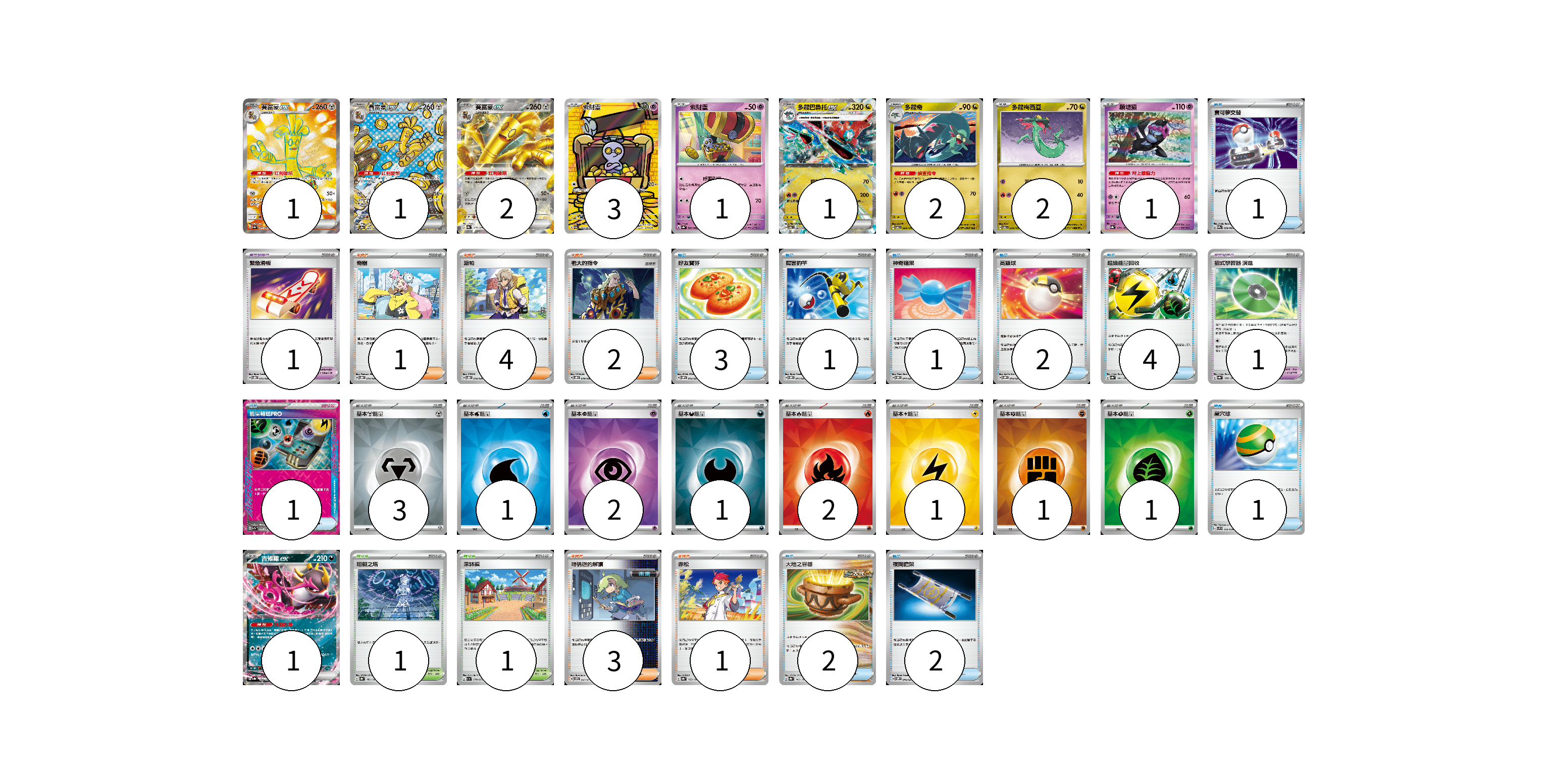 牌組構築方案 以此牌組為基礎新構築牌組 顯示卡面 顯示列表 寶可夢卡(15) 1 1 2 3 1 1 2 2 1 1 寶可夢道具(2) 1 1 物品卡(18) 1 3 1 1 2 4 1 1 2 2 支援者卡(11) 1 4 2 3 1 競技場卡(2) 1 1 能量卡(12) 3 1 2 1 2 1 1 1 寶可夢卡(15) 卡牌名稱 張數 卡牌名稱 張數 賽富豪ex SV3a 079/062 01 賽富豪ex SV8a 220/187 01 賽富豪ex SV8a 117/187 02 索財靈 SV3a 068/062 03 索財靈 SV3a 020/062 01 多龍巴魯托ex SV6 081/101 01 多龍奇 SV6 080/101 02 多龍梅西亞 SV6 079/101 02 願增猿 SV8a 075/187 01 吉雉雞ex SV8a 104/187 01 寶可夢道具(2) 卡牌名稱 張數 卡牌名稱 張數 緊急滑板 SVOD 015/020 01 招式學習器 演進 SV8a 160/187 01 物品卡(18) 卡牌名稱 張數 卡牌名稱 張數 寶可夢交替 SV9a 058/063 01 好友寶芬 SVOM 012/021 03 厲害釣竿 SVOM 011/021 01 神奇糖果 SVOM 014/021 01 高級球 SVOM 013/021 02 超級能量回收 SV8a 141/187 04 能量輸送PRO SV7a 052/064 01 巢穴球 SVF 016/038 01 大地之容器 SV8a 143/187 02 夜間擔架 SVOM 016/021 02 支援者卡(11) 卡牌名稱 張數 卡牌名稱 張數 奇樹 SVOD 016/020 01 派帕 SVOD 018/020 04 老大的指令 SVOD 019/020 02 暗碼迷的解讀 SV5M 067/071 03 赤松 SV8a 163/187 01 競技場卡(2) 卡牌名稱 張數 卡牌名稱 張數 阻礙之塔 SV8a 181/187 01 深缽鎮 SV1a 070/073 01 能量卡(12) 卡牌名稱 張數 卡牌名稱 張數 基本【鋼】能量 SVK MET 03 基本【水】能量 SVK WAT 01 基本【超】能量 SVOD PSY 02 基本【惡】能量 SVK DAR 01 基本【火】能量 SVK FIR 02 基本【雷】能量 SVK LIG 01 基本【鬥】能量 SVK FIG 01 基本【草】能量 SVK GRA 01 以此牌組為基礎新構築牌組 牌組編碼 fJAkKd-CiBzkH-GLJxFw copy 列印牌組單 牌組編碼已複製 分享至SNS