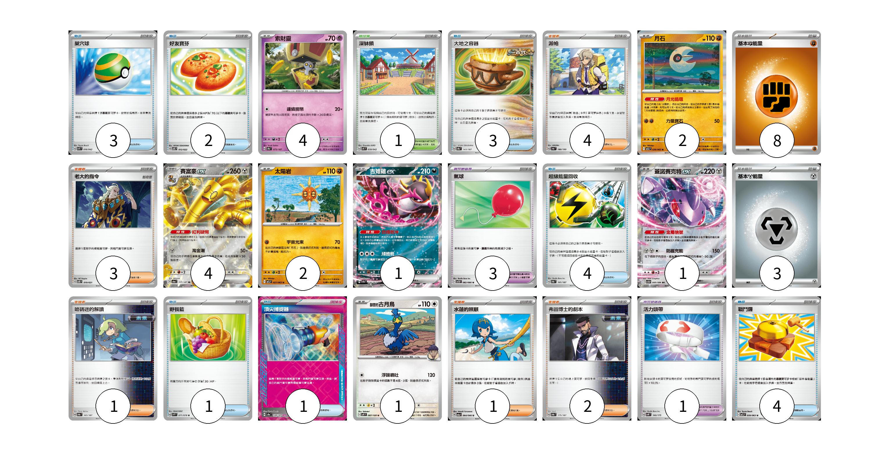 牌組構築方案 以此牌組為基礎新構築牌組 顯示卡面 顯示列表 寶可夢卡(15) 4 2 4 2 1 1 1 寶可夢道具(4) 3 1 物品卡(18) 3 2 3 4 1 1 4 支援者卡(11) 4 3 1 1 2 競技場卡(1) 1 能量卡(11) 8 3 寶可夢卡(15) 卡牌名稱 張數 卡牌名稱 張數 索財靈 SV8a 073/187 04 月石 M1L 026/063 02 賽富豪ex SV8a 117/187 04 太陽岩 M1L 027/063 02 吉雉雞ex SV6a 038/064 01 蓋諾賽克特ex SV11B 069/086 01 赫普的古月鳥 SV9 087/100 01 寶可夢道具(4) 卡牌名稱 張數 卡牌名稱 張數 氣球 SV11B 082/086 03 活力頭帶 SVM 140/175 01 物品卡(18) 卡牌名稱 張數 卡牌名稱 張數 巢穴球 SVK 016/042 03 好友寶芬 SVTS 012/022 02 大地之容器 SV8a 143/187 03 超級能量回收 SV8a 141/187 04 野餐籃 SV1V 071/078 01 頂尖捕捉器 SV8a 148/187 01 戰鬥鑼 M1L 059/063 04 支援者卡(11) 卡牌名稱 張數 卡牌名稱 張數 派帕 SV4a 180/190 04 老大的指令 SVTR 019/021 03 暗碼迷的解讀 SV8a 165/187 01 水蓮的照顧 SV5a 064/066 01 弗圖博士的劇本 SV8a 175/187 02 競技場卡(1) 卡牌名稱 張數 卡牌名稱 張數 深缽鎮 SVK 039/042 01 能量卡(11) 卡牌名稱 張數 卡牌名稱 張數 基本【鬥】能量 M-P FIG 08 基本【鋼】能量 M-P MET 03 以此牌組為基礎新構築牌組 牌組編碼 fKMUnK-wOdeeA-fdxusw copy 列印牌組單 牌組編碼已複製 分享至SNS