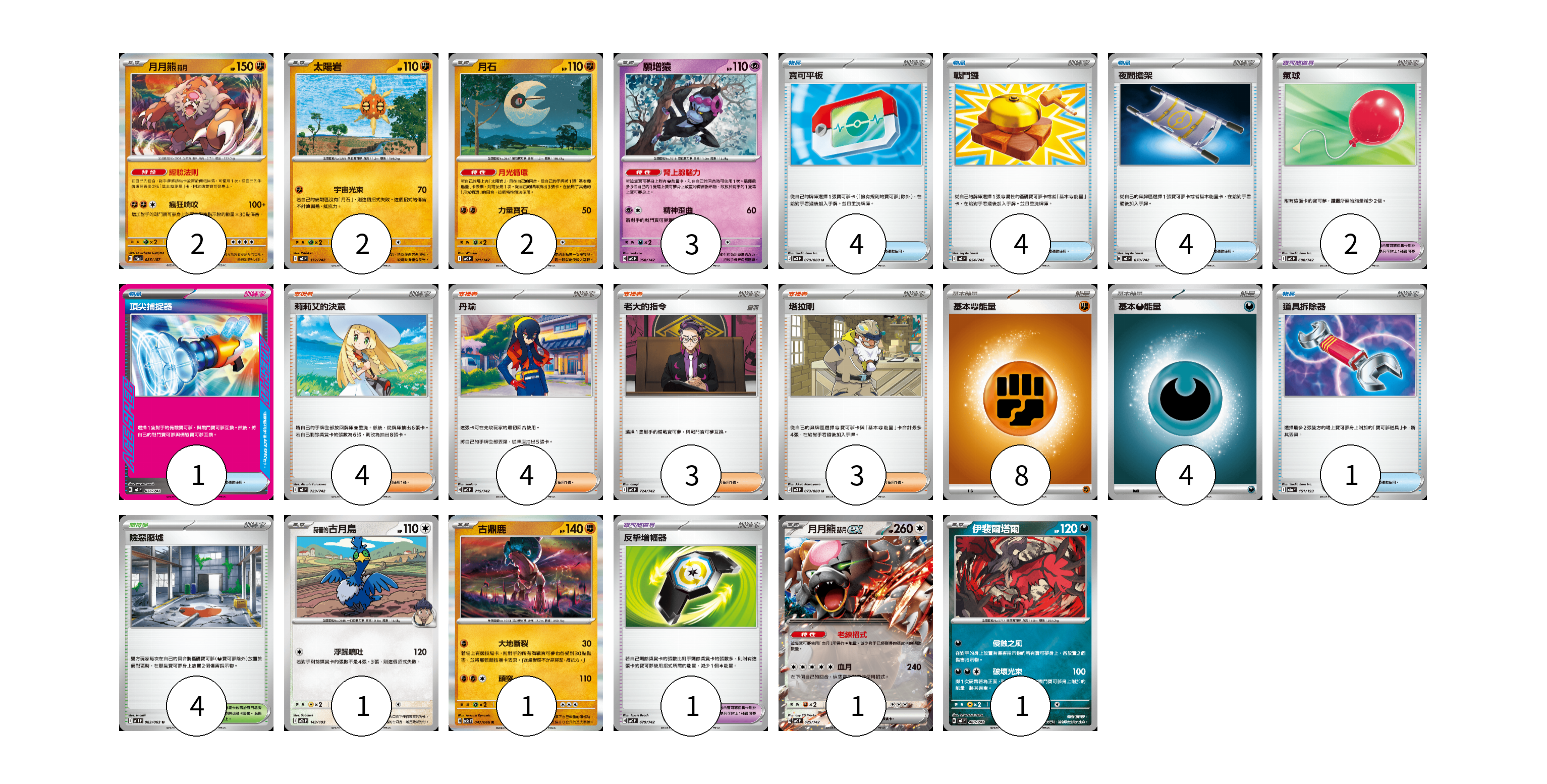 牌組構築方案 以此牌組為基礎新構築牌組 顯示卡面 顯示列表 寶可夢卡(13) 2 2 2 3 1 1 1 1 寶可夢道具(3) 2 1 物品卡(14) 4 4 4 1 1 支援者卡(14) 4 4 3 3 競技場卡(4) 4 能量卡(12) 8 4 寶可夢卡(13) 卡牌名稱 張數 卡牌名稱 張數 月月熊 赫月 SV8a 085/187 02 太陽岩 MC 372/742 02 月石 MC 371/742 02 願增猿 MC 358/742 03 赫普的古月鳥 M2a 143/193 01 古鼎鹿 SV5a 047/066 01 月月熊 赫月 ex MC 625/742 01 伊裴爾塔爾 MC 480/742 01 寶可夢道具(3) 卡牌名稱 張數 卡牌名稱 張數 氣球 MC 688/742 02 反擊增幅器 MC 679/742 01 物品卡(14) 卡牌名稱 張數 卡牌名稱 張數 寶可平板 M3 070/080 04 戰鬥鑼 MC 654/742 04 夜間擔架 MC 670/742 04 頂尖捕捉器 MC 656/742 01 道具拆除器 M2a 151/193 01 支援者卡(14) 卡牌名稱 張數 卡牌名稱 張數 莉莉艾的決意 MC 729/742 04 丹瑜 MC 715/742 04 老大的指令 MC 724/742 03 塔拉剛 M3 073/080 03 競技場卡(4) 卡牌名稱 張數 卡牌名稱 張數 險惡廢墟 M1L 063/063 04 能量卡(12) 卡牌名稱 張數 卡牌名稱 張數 基本【鬥】能量 MC FIG 08 基本【惡】能量 MC DAR 04 以此牌組為基礎新構築牌組 牌組編碼 fKdLef-hVbVNE-bgsATL copy 列印牌組單 牌組編碼已複製 分享至SNS