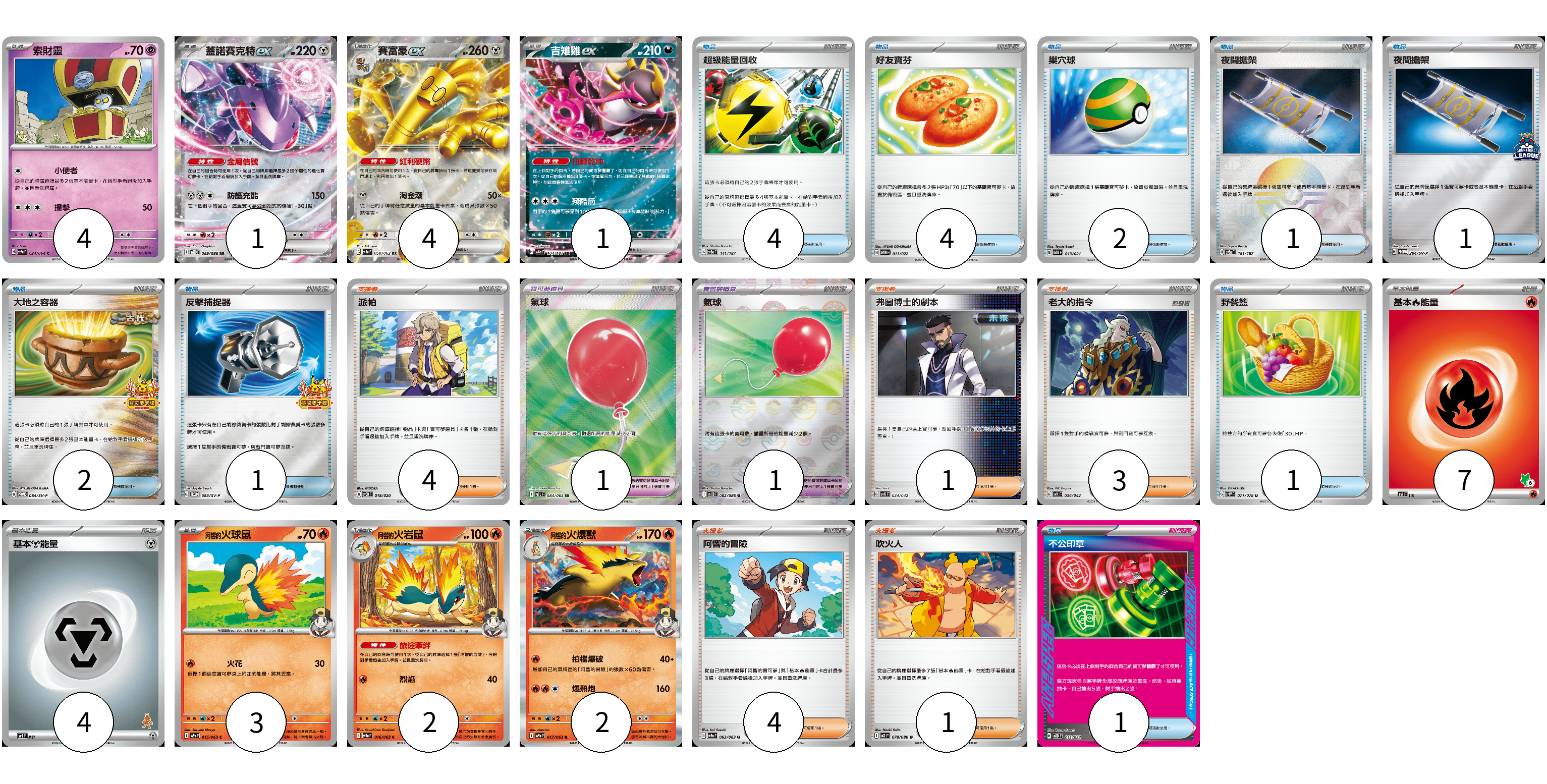牌組構築方案 以此牌組為基礎新構築牌組 顯示卡面 顯示列表 寶可夢卡(17) 4 1 4 1 3 2 2 寶可夢道具(2) 1 1 物品卡(17) 4 4 2 1 1 2 1 1 1 支援者卡(13) 4 1 3 4 1 能量卡(11) 7 4 寶可夢卡(17) 卡牌名稱 張數 卡牌名稱 張數 索財靈 SV7a 024/064 04 蓋諾賽克特ex SV11B 069/086 01 賽富豪ex SV3a 050/062 04 吉雉雞ex SV8a 104/187 01 <阿響的>火球鼠 SV9a 015/063 03 <阿響的>火岩鼠 SV9a 016/063 02 <阿響的>火爆獸 SV9a 017/063 02 寶可夢道具(2) 卡牌名稱 張數 卡牌名稱 張數 氣球 M1L 084/063 01 氣球 SV11B 082/086 01 物品卡(17) 卡牌名稱 張數 卡牌名稱 張數 超級能量回收 SV8a 141/187 04 好友寶芬 SVTM 011/022 04 巢穴球 SVTR 013/021 02 夜間擔架 SV8a 151/187 01 夜間擔架 SV-P 204/SV-P 01 大地之容器 SV-P 084/SV-P 02 反擊捕捉器 SV-P 083/SV-P 01 野餐籃 SV1V 071/078 01 不公印章 MBD 011/022 01 支援者卡(13) 卡牌名稱 張數 卡牌名稱 張數 派帕 SVOD 018/020 04 弗圖博士的劇本 SVK 034/042 01 老大的指令 SVK 036/042 03 阿響的冒險 SV9a 063/063 04 吹火人 M2 078/080 01 能量卡(11) 卡牌名稱 張數 卡牌名稱 張數 基本【火】能量 SVI FIR 07 基本【鋼】能量 SVI MET 04 以此牌組為基礎新構築牌組 牌組編碼 fPbdbX-NAKYUC-csdOMC copy 列印牌組單 牌組編碼已複製 分享至SNS