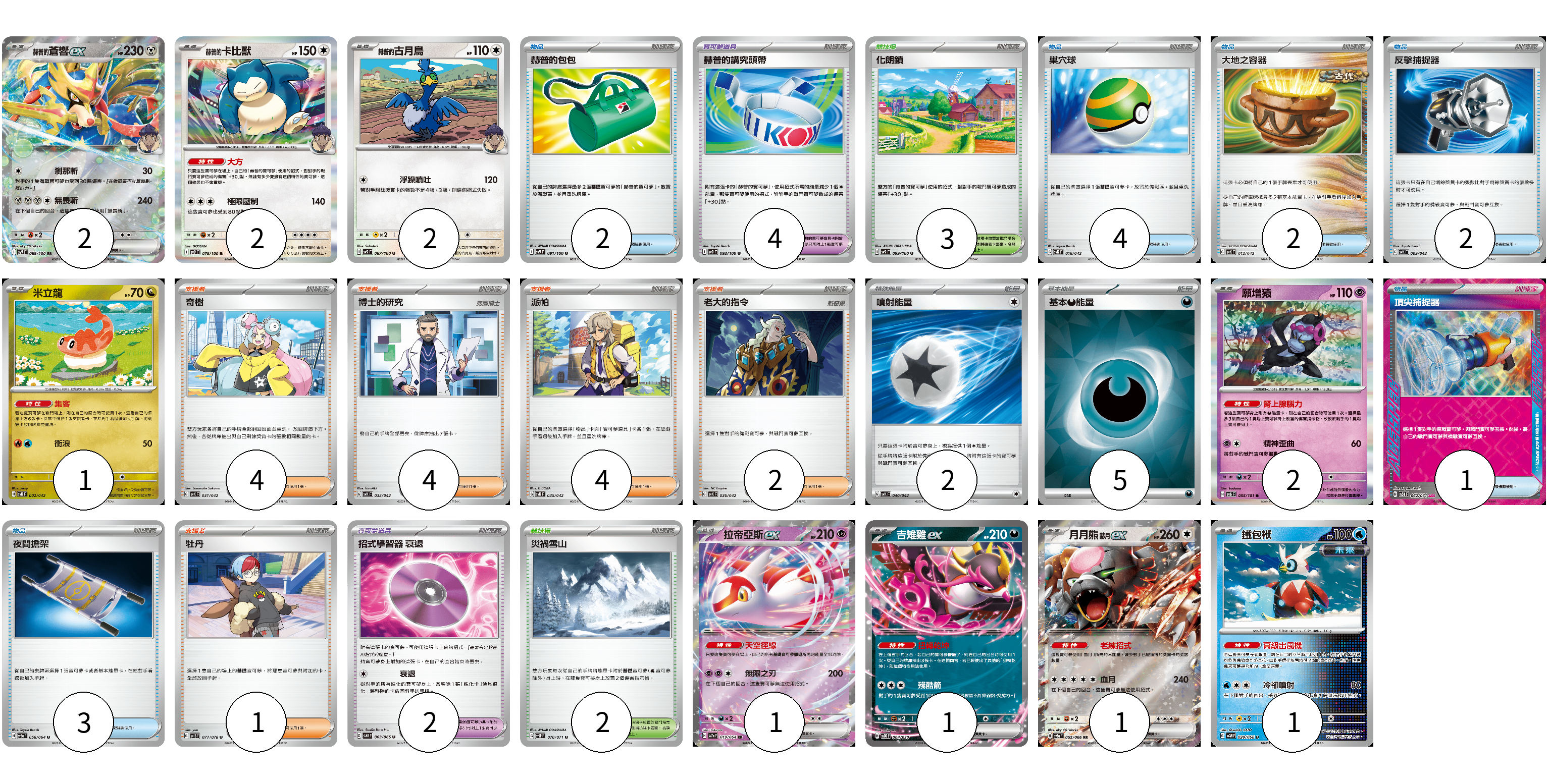牌組構築方案 以此牌組為基礎新構築牌組 顯示卡面 顯示列表 寶可夢卡(13) 2 2 2 1 2 1 1 1 1 寶可夢道具(6) 4 2 物品卡(14) 2 4 2 2 1 3 支援者卡(15) 4 4 4 2 1 競技場卡(5) 3 2 能量卡(7) 2 5 寶可夢卡(13) 卡牌名稱 張數 卡牌名稱 張數 赫普的蒼響ex SV9 069/100 02 赫普的卡比獸 SV9 075/100 02 赫普的古月鳥 SV9 087/100 02 米立龍 SVK 002/042 01 願增猿 SV6 055/101 02 拉帝亞斯ex SV7a 019/064 01 吉雉雞ex SVOD 004/020 01 月月熊 赫月 ex SV5a 052/066 01 鐵包袱 SV4M 020/066 01 寶可夢道具(6) 卡牌名稱 張數 卡牌名稱 張數 赫普的講究頭帶 SV9 092/100 04 招式學習器 衰退 SV4K 063/066 02 物品卡(14) 卡牌名稱 張數 卡牌名稱 張數 赫普的包包 SV9 091/100 02 巢穴球 SVK 016/042 04 大地之容器 SVK 012/042 02 反擊捕捉器 SVK 009/042 02 頂尖捕捉器 SV5M 062/071 01 夜間擔架 SV6a 056/064 03 支援者卡(15) 卡牌名稱 張數 卡牌名稱 張數 奇樹 SVK 031/042 04 博士的研究 SVK 033/042 04 派帕 SVK 035/042 04 老大的指令 SVK 036/042 02 牡丹 SV1S 077/078 01 競技場卡(5) 卡牌名稱 張數 卡牌名稱 張數 化朗鎮 SV9 099/100 03 災禍雪山 SV2P 070/071 02 能量卡(7) 卡牌名稱 張數 卡牌名稱 張數 噴射能量 SVK 040/042 02 基本【惡】能量 SVK DAR 05 以此牌組為基礎新構築牌組 牌組編碼 fZmLMa-dVPaOp-QRswvE copy 列印牌組單 牌組編碼已複製 分享至SNS