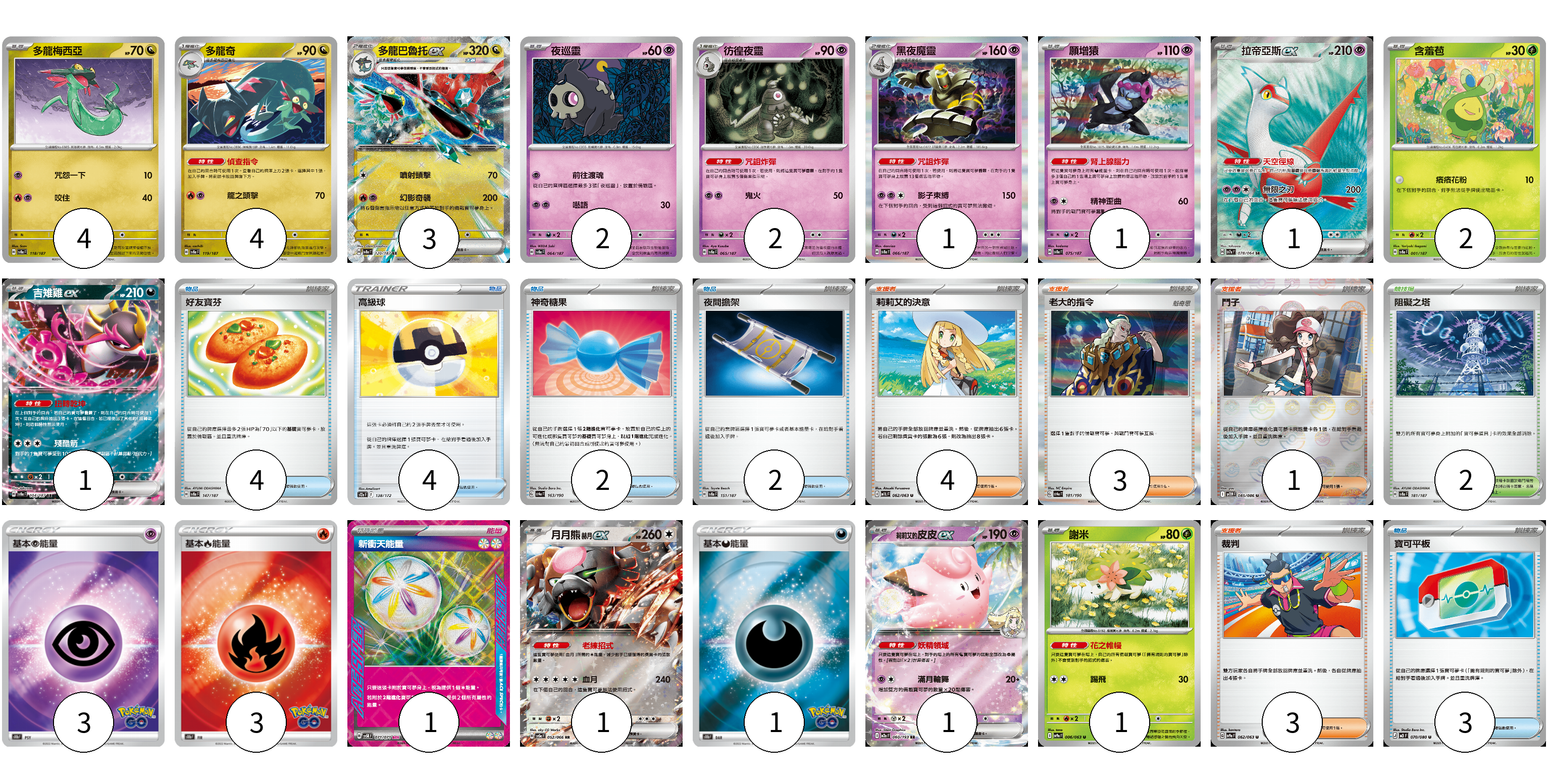 牌組構築方案 以此牌組為基礎新構築牌組 顯示卡面 顯示列表 寶可夢卡(24) 4 4 3 2 2 1 1 1 2 1 1 1 1 物品卡(15) 4 4 2 2 3 支援者卡(11) 4 3 1 3 競技場卡(2) 2 能量卡(8) 3 3 1 1 寶可夢卡(24) 卡牌名稱 張數 卡牌名稱 張數 多龍梅西亞 SV8a 118/187 04 多龍奇 SV8a 119/187 04 多龍巴魯托ex SV8a 120/187 03 夜巡靈 SV8a 064/187 02 彷徨夜靈 SV8a 065/187 02 黑夜魔靈 SV8a 066/187 01 願增猿 SV8a 075/187 01 拉帝亞斯ex SV7a 078/064 01 含羞苞 SV8a 001/187 02 吉雉雞ex SV8a 104/187 01 月月熊 赫月 ex SV5a 052/066 01 莉莉艾的皮皮ex M2a 060/193 01 謝米 SV9a 006/063 01 物品卡(15) 卡牌名稱 張數 卡牌名稱 張數 好友寶芬 SV8a 147/187 04 高級球 S12a 138/172 04 神奇糖果 SV4a 163/190 02 夜間擔架 SV8a 151/187 02 寶可平板 M3 070/080 03 支援者卡(11) 卡牌名稱 張數 卡牌名稱 張數 莉莉艾的決意 M1L 062/063 04 老大的指令 SV4a 181/190 03 鬥子 SV11W 085/086 01 裁判 SV9a 062/063 03 競技場卡(2) 卡牌名稱 張數 卡牌名稱 張數 阻礙之塔 SV8a 181/187 02 能量卡(8) 卡牌名稱 張數 卡牌名稱 張數 基本超能量 S10b PSY 03 基本火能量 S10b FIR 03 新衝天能量 SV5K 071/071 01 基本惡能量 S10b DAR 01 以此牌組為基礎新構築牌組 牌組編碼 fapXGl-zkIGHg-JIWeHp copy 列印牌組單 牌組編碼已複製 分享至SNS
