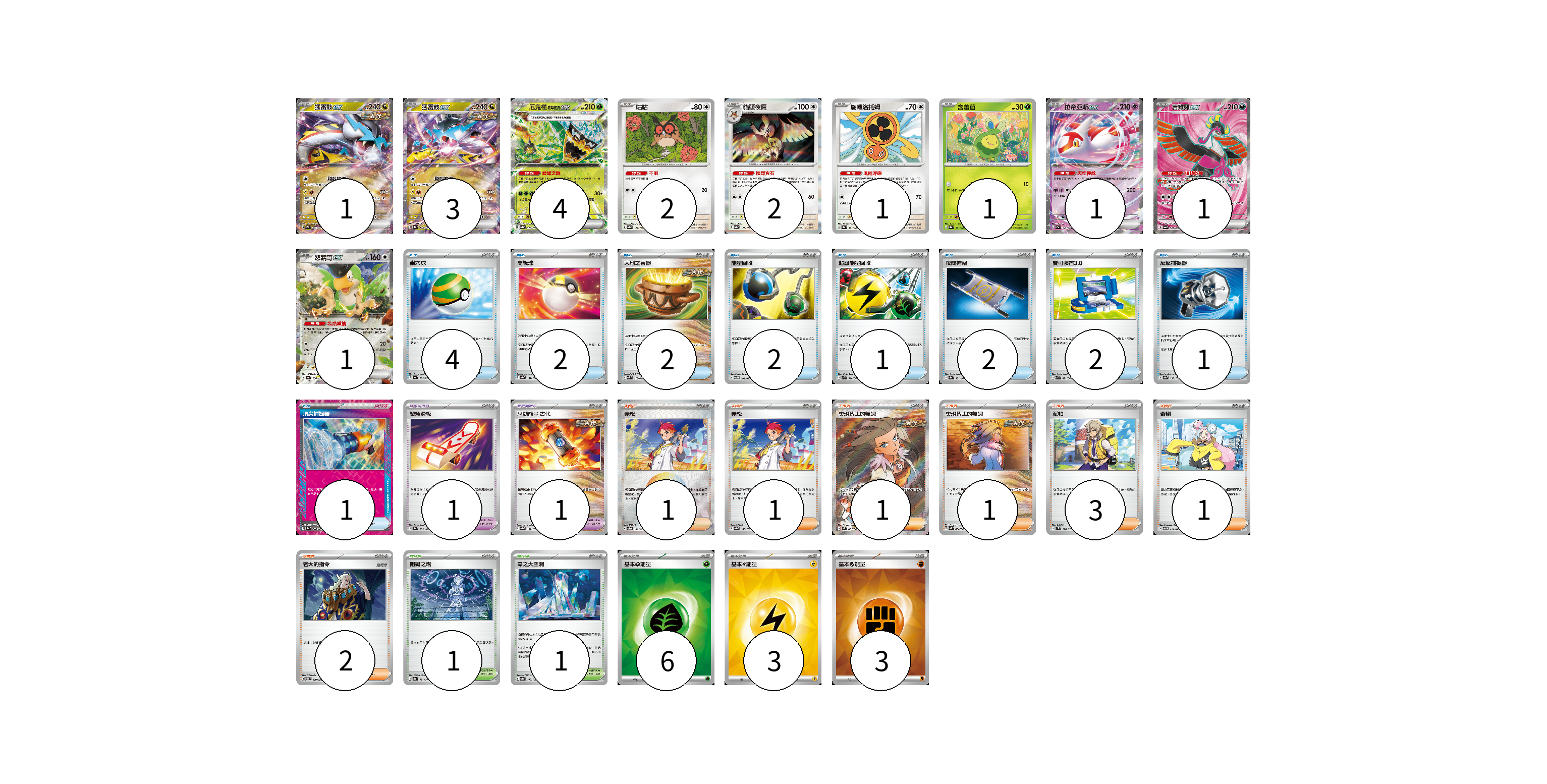 牌組構築方案 以此牌組為基礎新構築牌組 顯示卡面 顯示列表 寶可夢卡(17) 1 3 4 2 2 1 1 1 1 1 寶可夢道具(2) 1 1 物品卡(17) 4 2 2 2 1 2 2 1 1 支援者卡(10) 1 1 1 1 3 1 2 競技場卡(2) 1 1 能量卡(12) 6 3 3 寶可夢卡(17) 卡牌名稱 張數 卡牌名稱 張數 猛雷鼓ex SV5K 053/071 01 猛雷鼓ex SV8a 124/187 03 厄鬼椪 碧草面具ex SV8a 020/187 04 咕咕 SV8a 127/187 02 貓頭夜鷹 SV8a 128/187 02 旋轉洛托姆 SV8a 131/187 01 含羞苞 SV8a 001/187 01 拉帝亞斯ex SV7a 019/064 01 吉雉雞ex SV6a 081/064 01 怒鸚哥ex SV4a 154/190 01 寶可夢道具(2) 卡牌名稱 張數 卡牌名稱 張數 緊急滑板 SV8a 153/187 01 驅勁能量 古代 SV8a 157/187 01 物品卡(17) 卡牌名稱 張數 卡牌名稱 張數 巢穴球 SV4a 159/190 04 高級球 SV4a 161/190 02 大地之容器 SVK 012/042 02 能量回收 SVTM 009/022 02 超級能量回收 SVK 010/042 01 夜間擔架 SV8a 151/187 02 寶可裝置3.0 SVK 021/042 02 反擊捕捉器 SV8a 139/187 01 頂尖捕捉器 SV8a 148/187 01 支援者卡(10) 卡牌名稱 張數 卡牌名稱 張數 赤松 SV8a 163/187 01 赤松 SV8a 163/187 01 奧琳博士的氣魄 SV4K 085/066 01 奧琳博士的氣魄 SV4K 064/066 01 派帕 SV1V 076/078 03 奇樹 SVTM 017/022 01 老大的指令 SVTM 020/022 02 競技場卡(2) 卡牌名稱 張數 卡牌名稱 張數 阻礙之塔 SV8a 181/187 01 零之大空洞 SV8a 182/187 01 能量卡(12) 卡牌名稱 張數 卡牌名稱 張數 基本【草】能量 SVK GRA 06 基本【雷】能量 SVK LIG 03 基本【鬥】能量 SVK FIG 03 以此牌組為基礎新構築牌組 牌組編碼 feBbxI-ofttYQ-gmhZVC copy 列印牌組單 牌組編碼已複製 分享至SNS